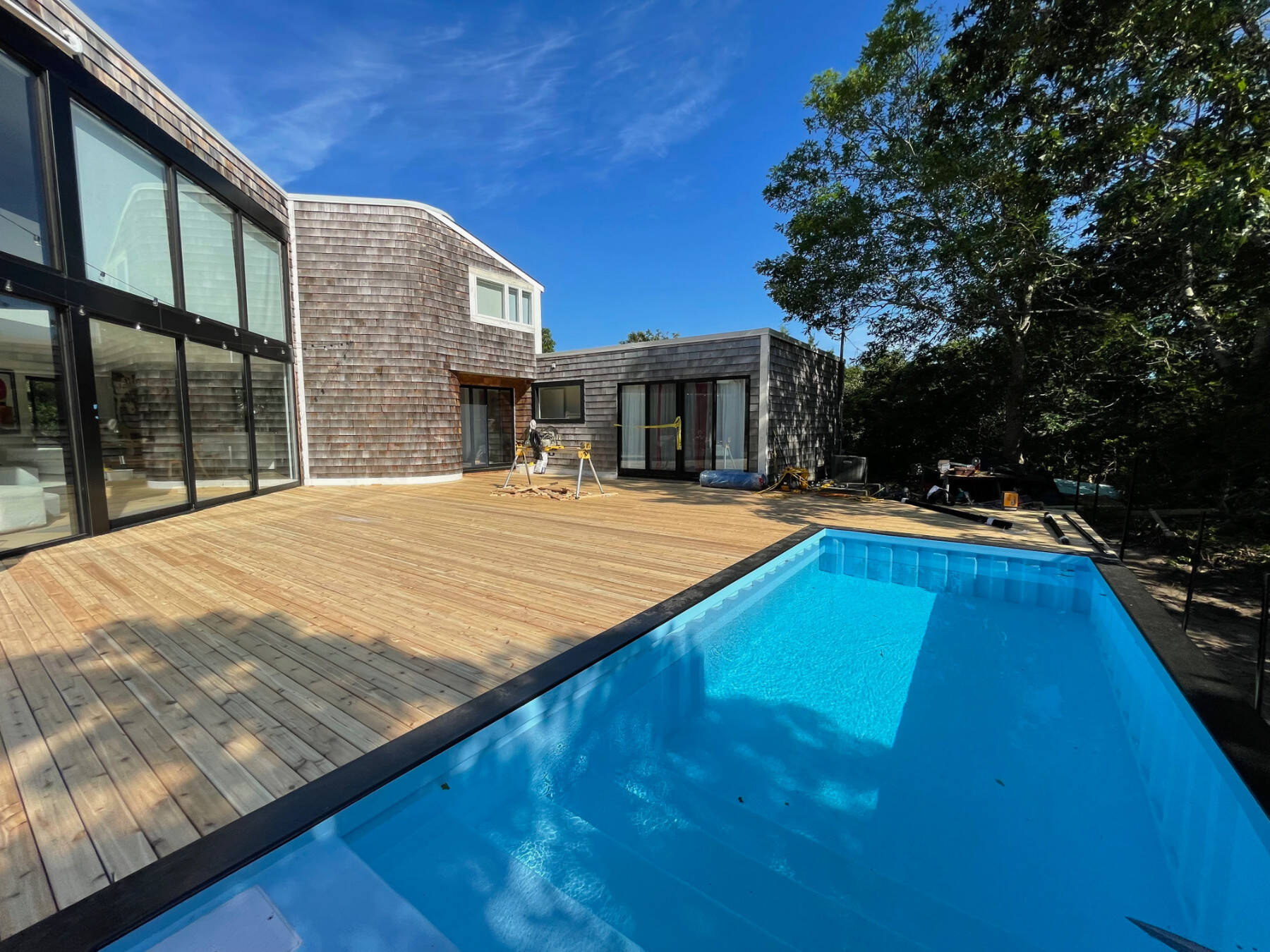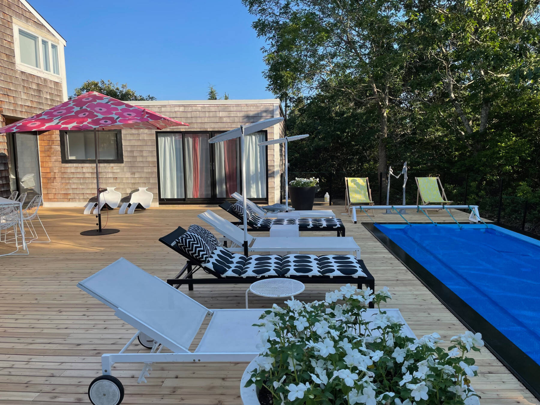 This newly renovated modern in the Dunes with a new pool has four bedrooms and 4 bathrooms. The first floor has a bright and open kitchen and living room with a fireplace overlooking a deck with a heated pool, three bedrooms and two bathrooms. The second floor has the master bedroom and bathroom, a loft with two additional trundle beds, and a guest bathroom. There is a beautiful collection of contemporary art work throughout the house. [[Rental Registration # 23-259]] EH RR #: 23-259