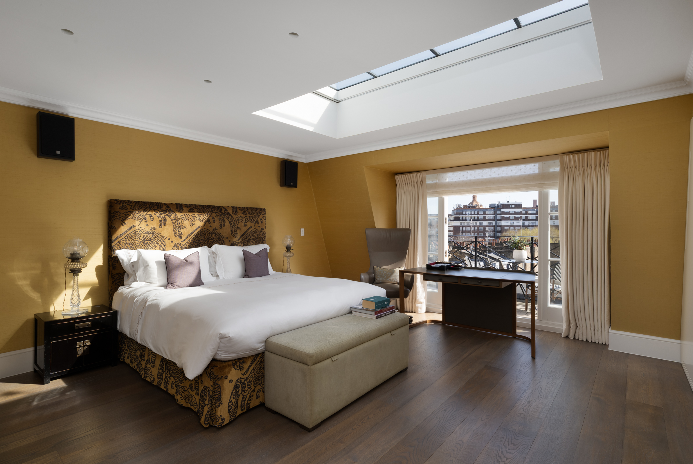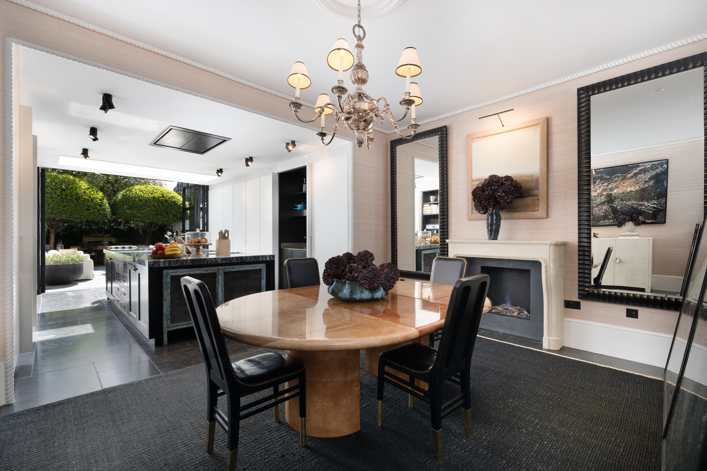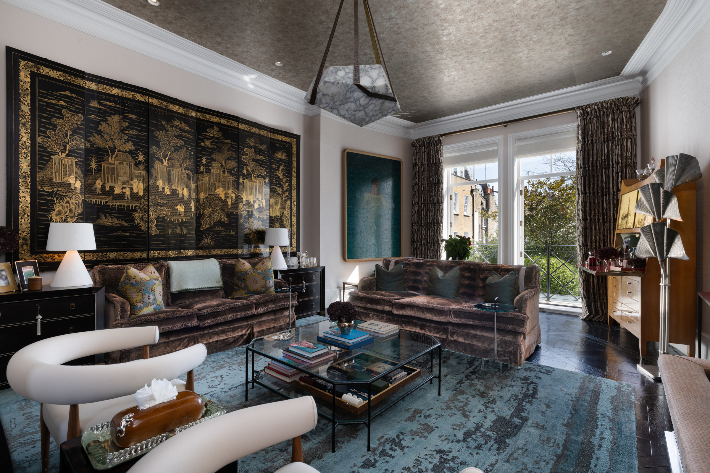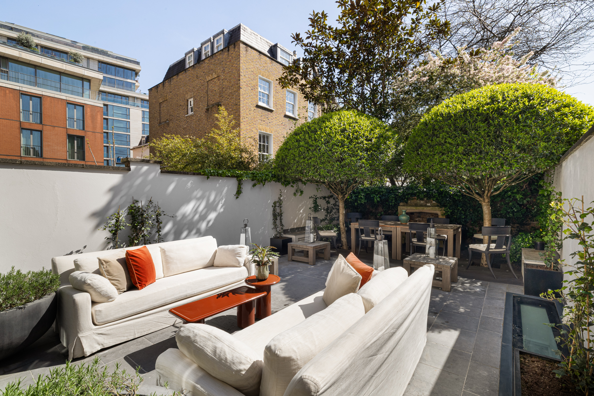 Set back behind a private gate, the front door opens to a hallway that leads to both a study/dining area and a large kitchen. Fitted with top of the range appliances and a breakfast bar, the kitchen has been exquisitely finished and features floor-to-ceiling glazed doors that open to a lovely landscaped garden. A large reception and a library lie on the first floor, which is also home to two balconies with leafy views.
