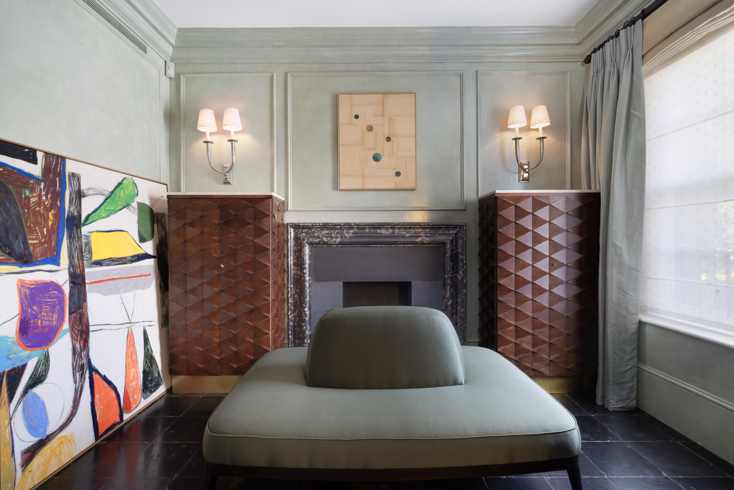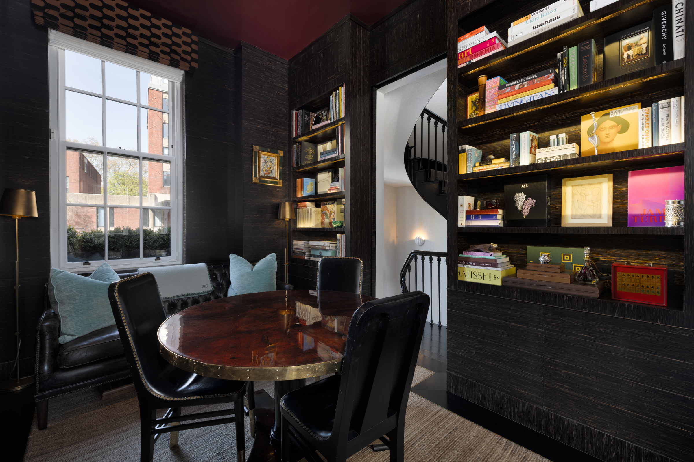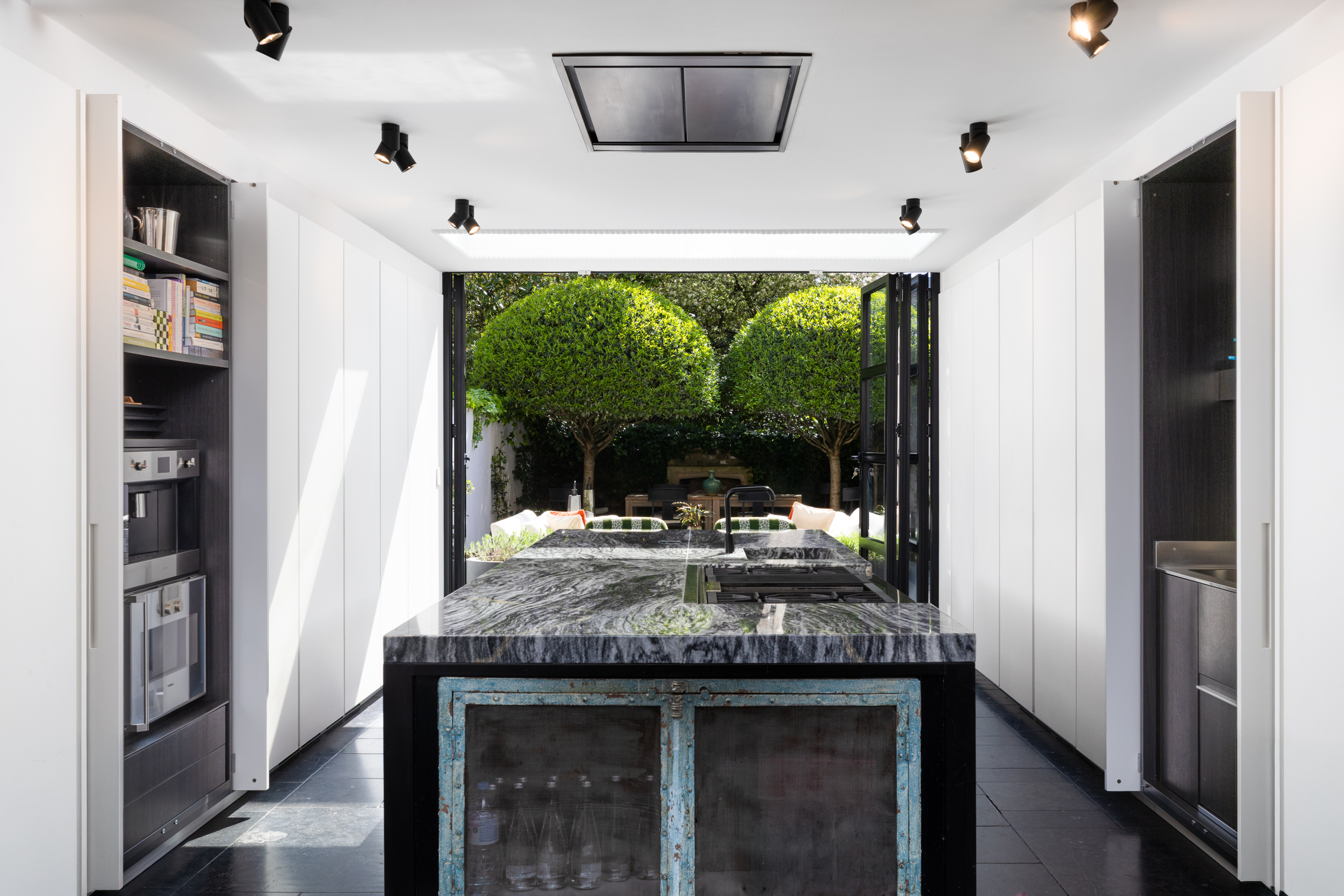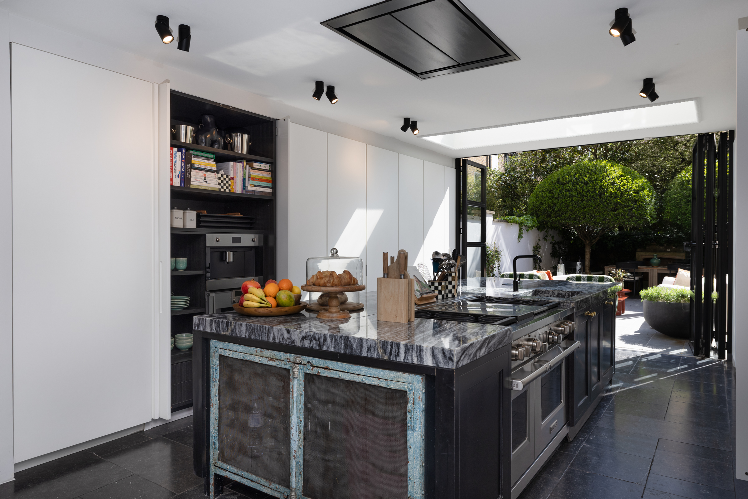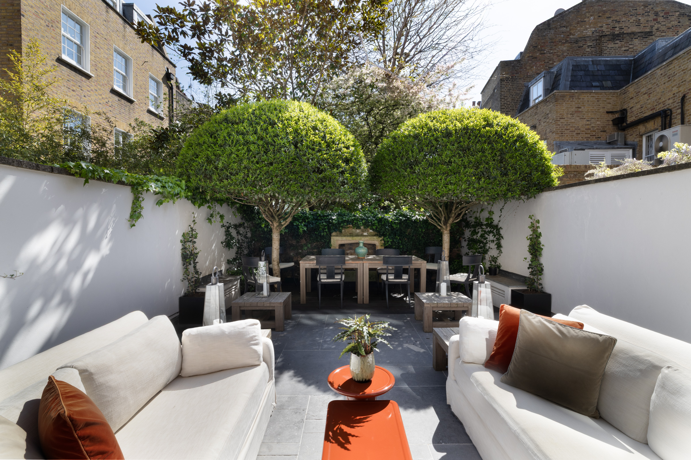 Set back behind a private gate, the front door opens to a hallway that leads to both a study/dining area and a large kitchen. Fitted with top of the range appliances and a breakfast bar, the kitchen has been exquisitely finished and features floor-to-ceiling glazed doors that open to a lovely landscaped garden. A large reception and a library lie on the first floor, which is also home to two balconies with leafy views.