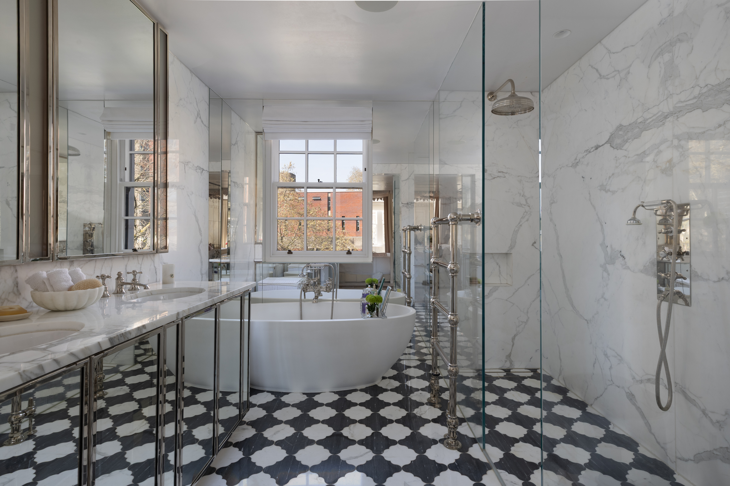 The two lower-ground floors play host to a number of impressive spaces, which are ideal when entertaining. The basement houses a gym, a spa with a steam room and a plant room, as well as a utility room and a bathroom. On the lower-ground floor, there’s a living room/cinema room, a large indoor swimming pool, which transforms into a dance floor. There is also a bedroom, perfect for hosting guests. Four more bedrooms lie on the second, third and fourth floors. The main bedroom on the second-floor bedroom has its own dressing room and en-suite with a bath, while the two bedrooms on the third floor have access to a family bathroom. A fourth bedroom spans the second floor and has an en-suite and private balcony with views of the garden.
