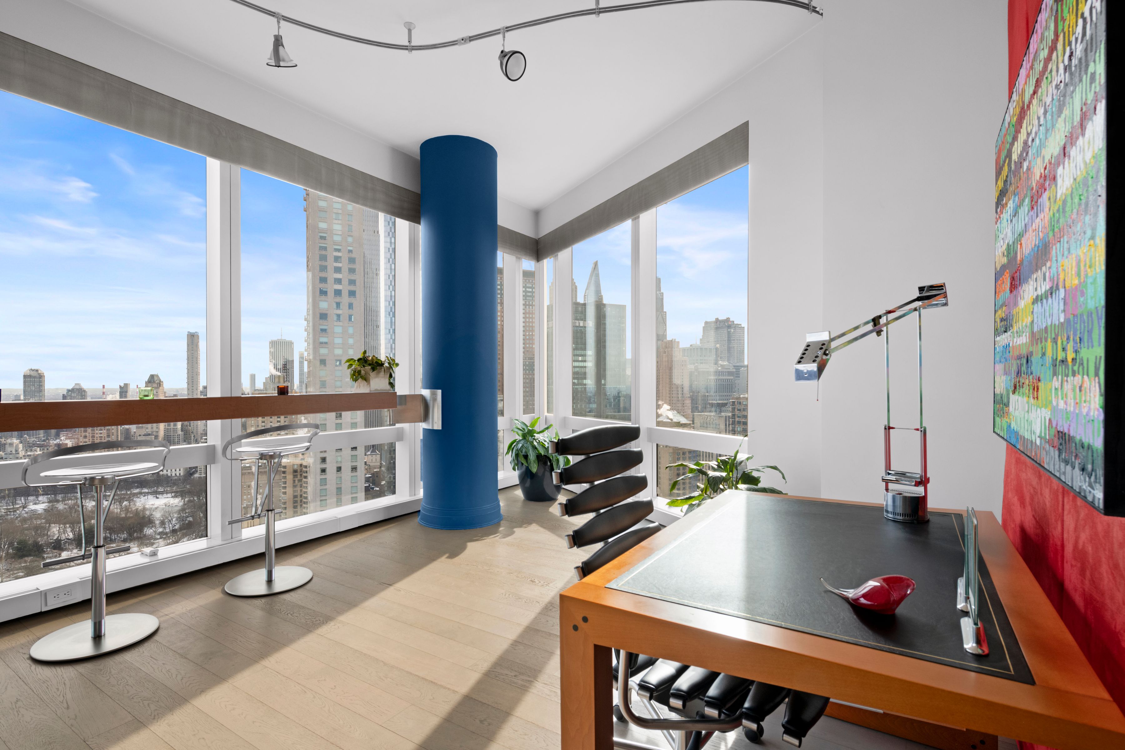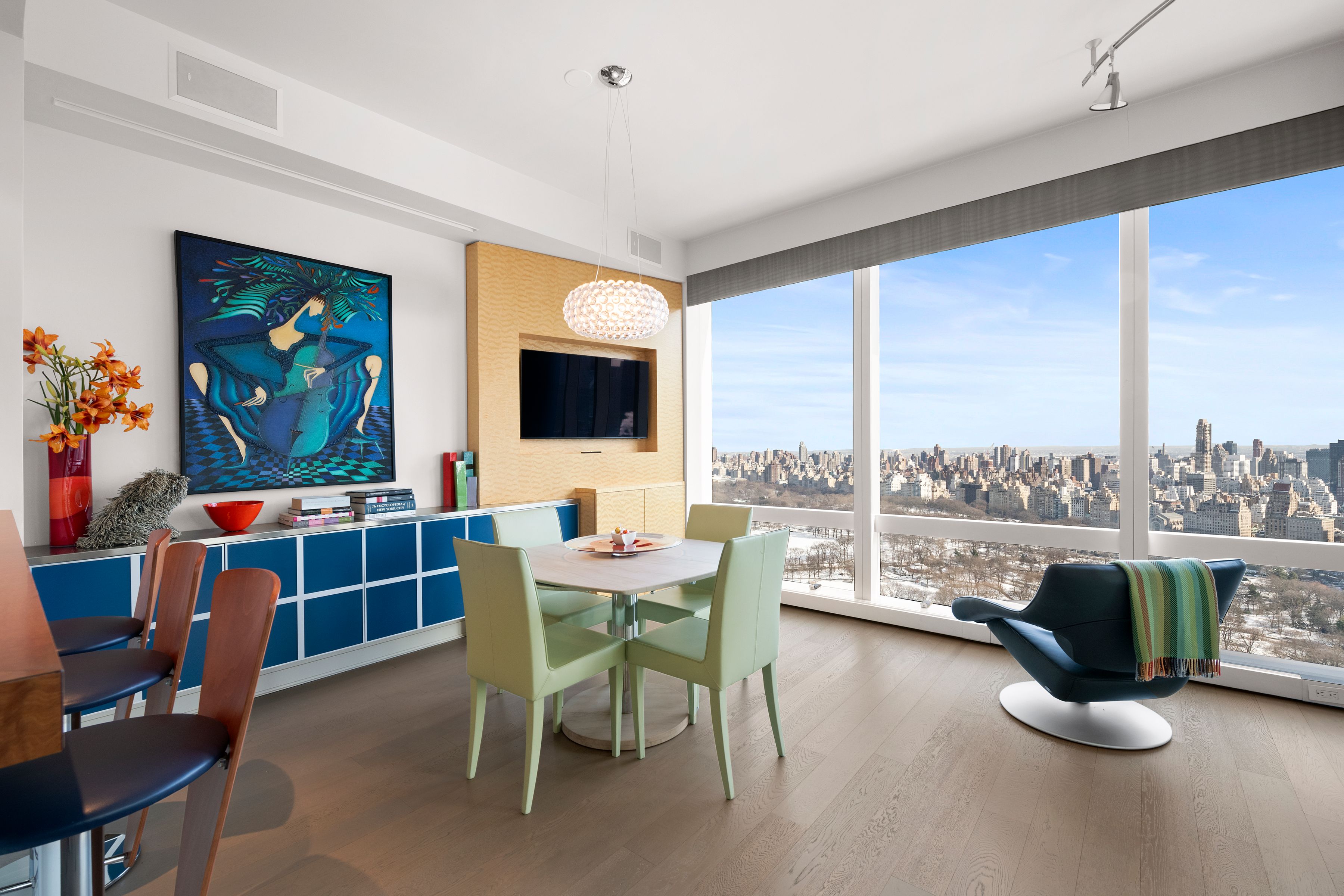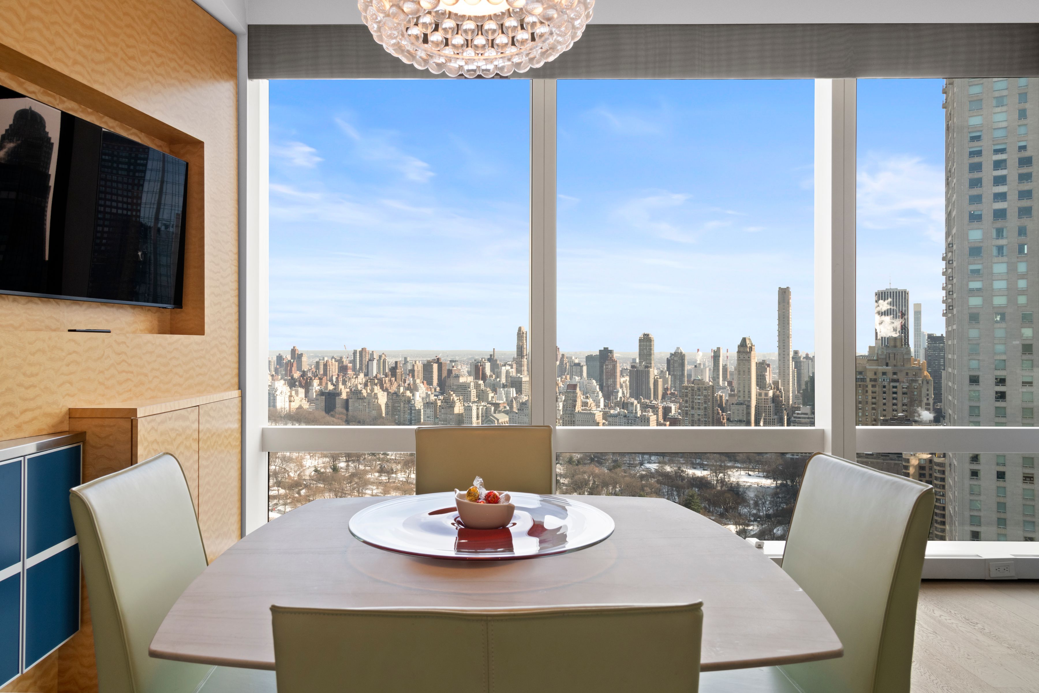 Central Park & Hudson River Views The breathtaking Central Park views and Hudson River sunsets, along with the Manhattan skyline illuminate every room seen from this spectacular residence with floor-to-ceiling windows. The apartment is beautifully renovated, designer and architecturally enhanced, and includes all-new wide white oak plank floors, an open kitchen, wood paneling, built-ins, custom furniture, and carpeting. There are playful aspects including the bar on the Park, stained glass panel, and custom lighting. A mix of wonderful bright and subtle colors highlights the magnificent views. A 20ft entry gallery, perfect for large art, leads to the stunning 42-foot entertaining area with its direct Park, River, and skyline views. The park-facing third bedroom has been incorporated into the existing Great Room to create a sweeping expanse of views. The modern opened kitchen has magnificent Park views and offers top-of-the-line Meile and Subzero appliances with white marble countertops and flooring. There is custom cabinetry throughout and ample storage. The washer and dryer are located conveniently within the apartment, and there are many closets throughout. The private, primary bedroom suite offers, Hudson River and views along with an ensuite, marble bathroom with a double marble vanity, large porcelain soaking tub, and large glass stall shower. An additional bedroom with an ensuite cream travertine marble bathroom and river views complete the 1862 sq ft home. The 5-star condominium offers amenities on the 51st floor (Club 51) including a private screening room, state-of-the-art gym, private party space, children’s playroom, private massage room, and outdoor terrace. In-house and valet parking. As a resident, you have access to The Mandarin Oriental Hotel amenities. Enjoy the state-of-the-art fitness center and the 75-foot indoor pool. Direct access to the retail offering first-class dining experiences, Whole Foods Market, and world-famous shopping. \u2028Deutsche Bank Center (also One Columbus Circle and formerly Time Warner Center) is a mixed-use building on Columbus Circle in New York City. It was developed by The Related Companies and Apollo Global Management, and designed by David Childs and Mustafa Kemal Abadan of Skidmore, Owings & Merrill. Deutsche Bank Center consists of two 750-foot (230 m) two towers bridged by a multi-story atrium containing upscale retail shops. The building also contains office and residential tenants. The total floor area of 2.8 million square feet (260,000 m2) is occupied by office space, including the Residences Mandarin Oriental condominiums; the Mandarin Oriental hotel; and Jazz at Lincoln Center. The Shops at Columbus Circle is an upscale shopping mall located in a curving arcade at the base of the building, with a large Whole Foods Market grocery store on the lower level.