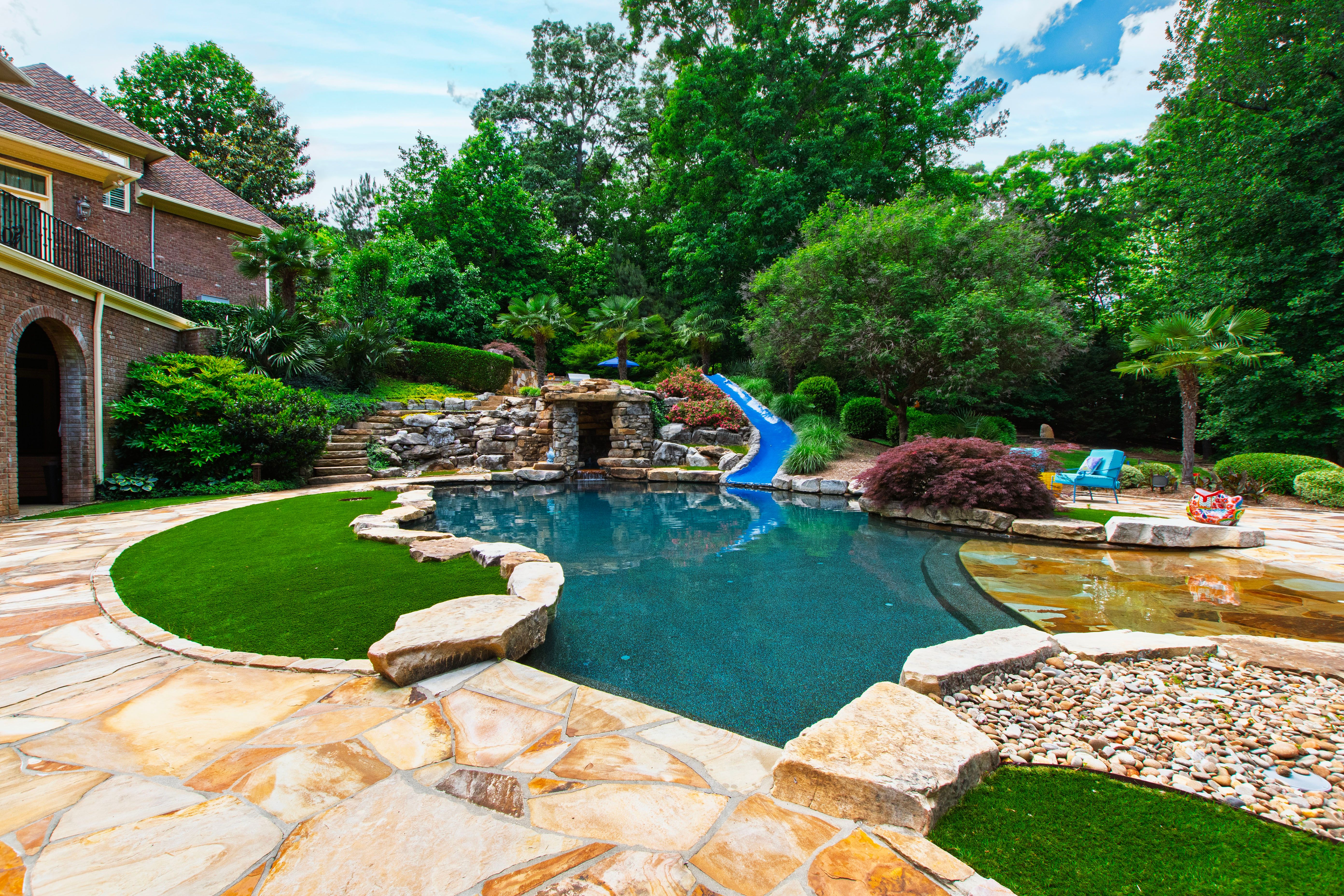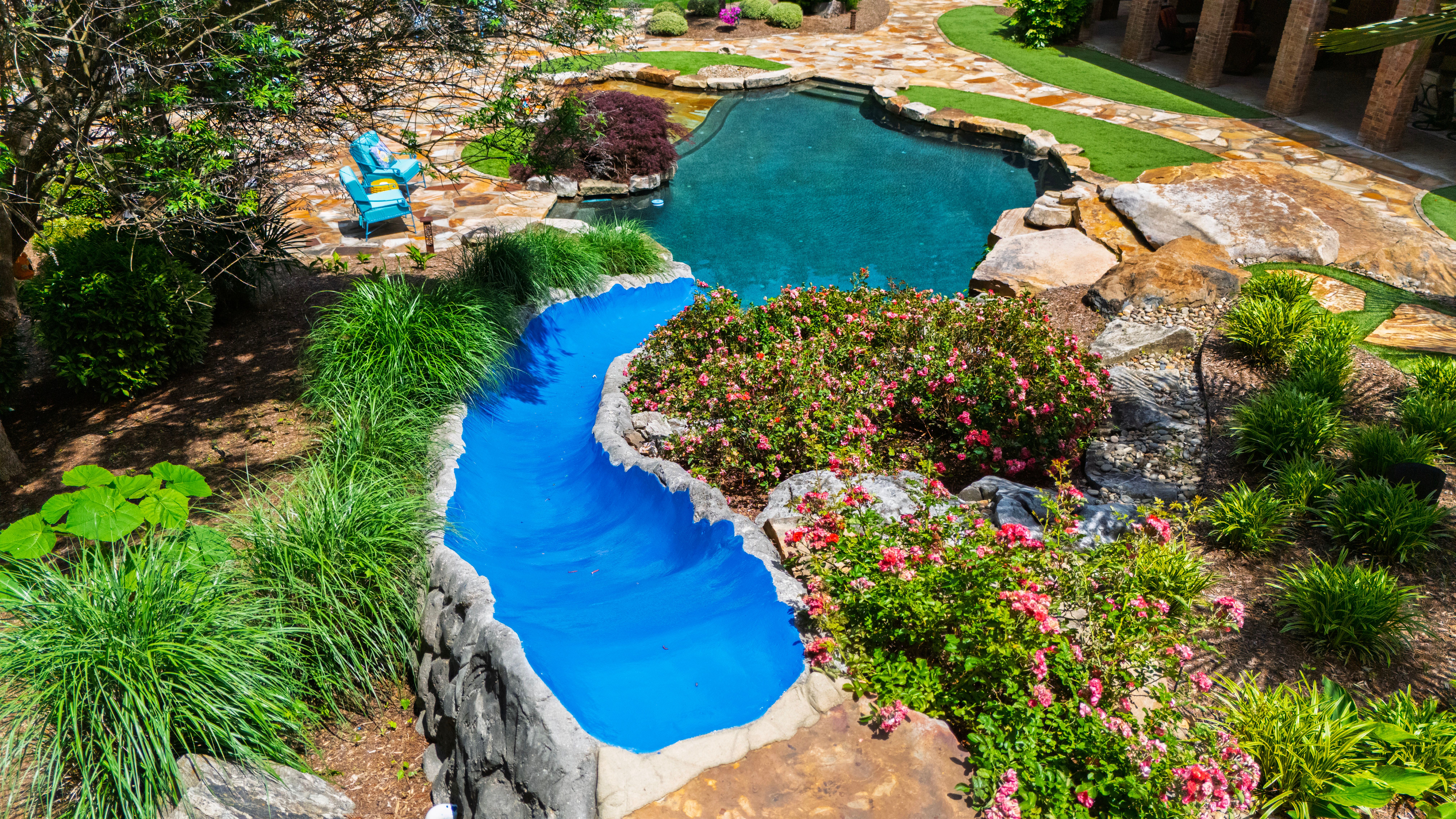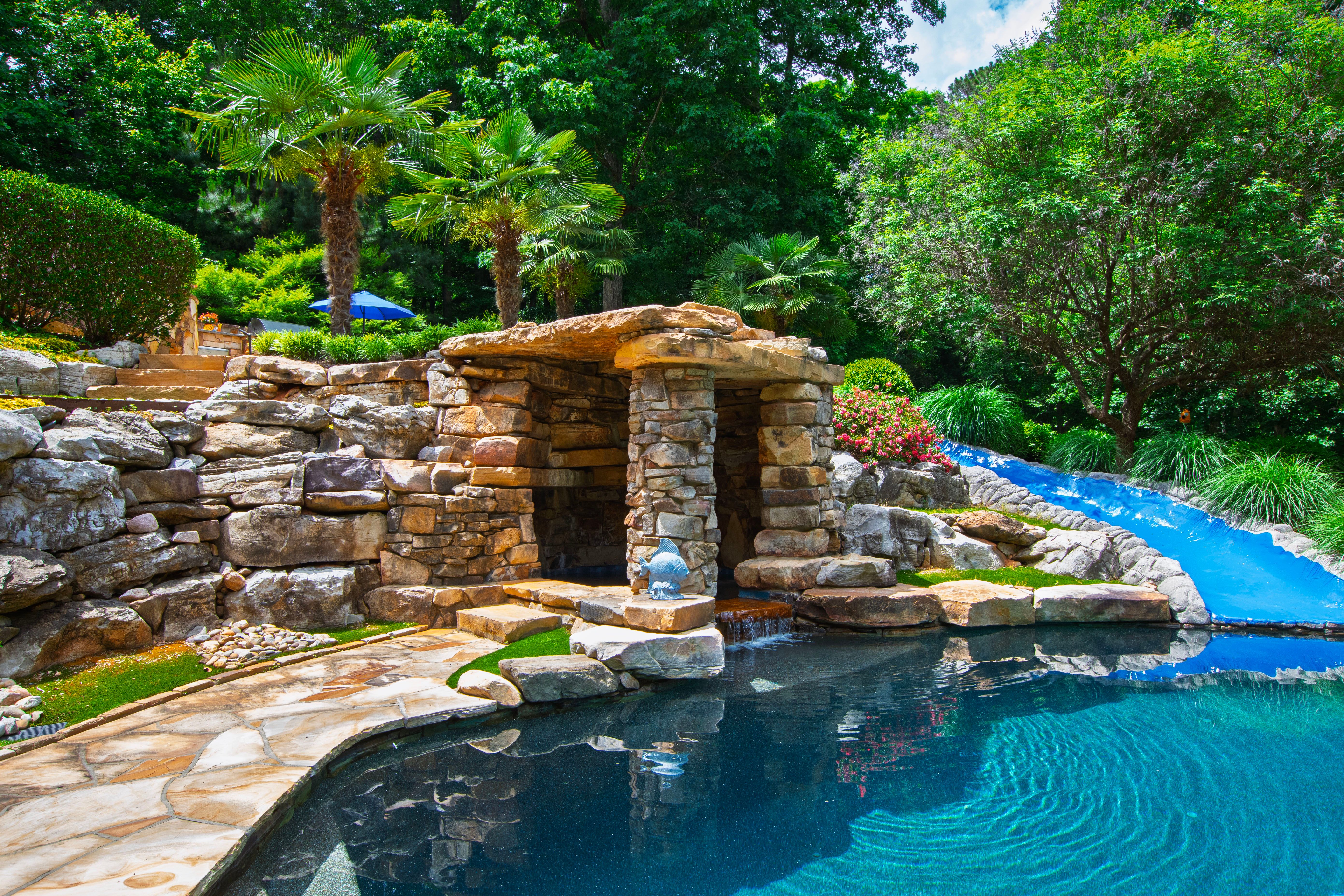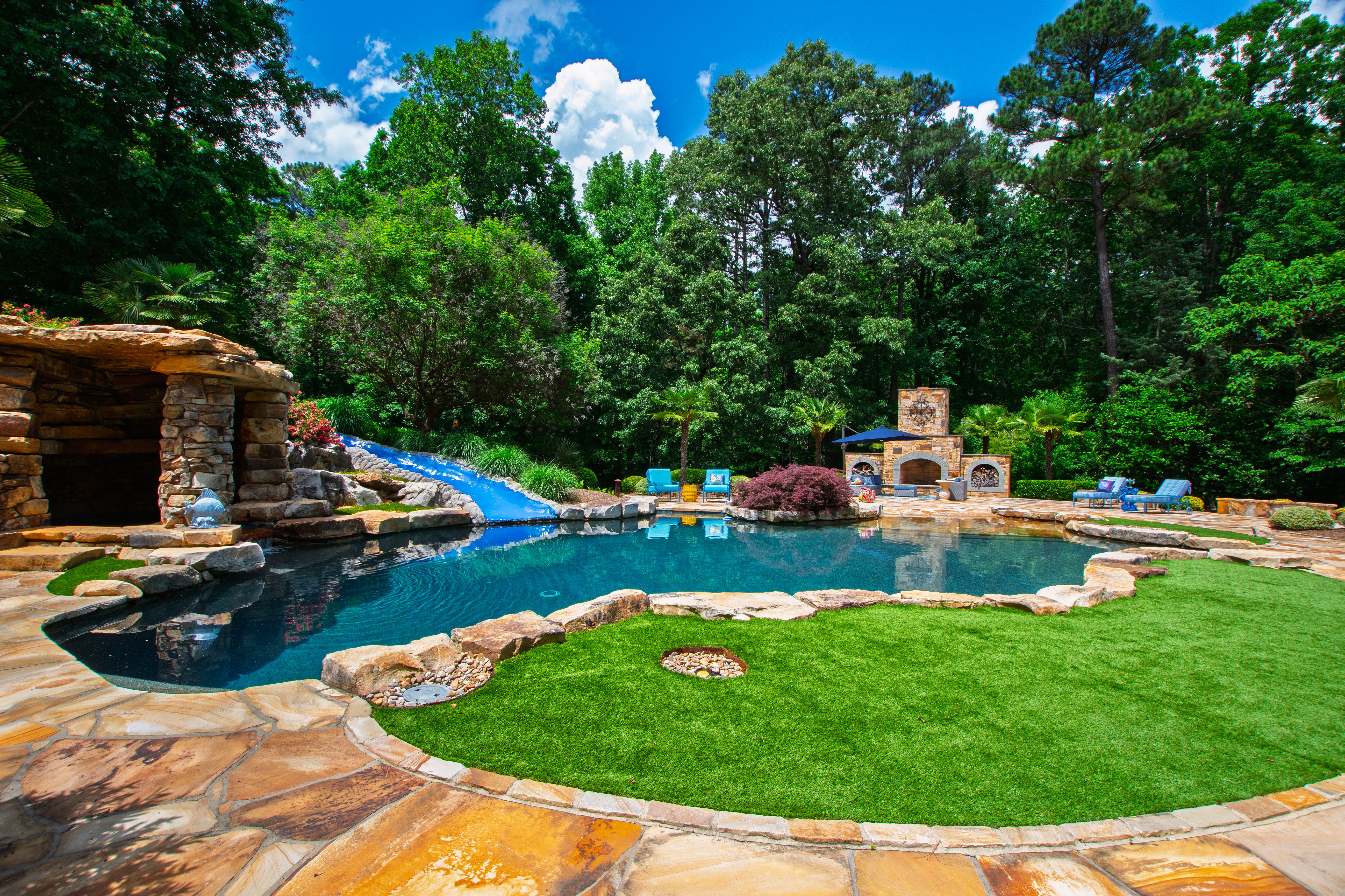 Located in the exclusive gated community of Back Nine Estates near prestigious Wakefield Plantation, this stunning all-brick, gated estate is a rare find offering over 3.9 acres of private, exquisitely-landscaped grounds. The property features a brick-paver driveway encircling an impressive fountain, an extraordinary sandstone front porch, and multiple garages, including a three-car upper-level garage and lower-level RV and single-car garages with an electric charging station. The outdoor living space is unparalleled, with a zero-entry saltwater Pebble Tec pool, a rock waterslide, a grotto spa, an expansive stone patio, an outdoor fireplace and a 1,056-sf elevated terrace with panoramic views. Perfect for entertaining, the outdoor kitchen is equipped with a Lynx gas grill, granite countertops, task lighting, and ample storage. Inside, this home boasts an elegant grand foyer with double cascading staircases, travertine flooring, extraordinary millwork, Murano glass chandeliers and flows beautifully into multiple gathering spaces. The open kitchen adjoins a fabulous keeping room with floor-to-ceiling windows and features a gas fireplace, a breakfast bar, top-of-the-line Thermador appliances, a center island with a prep sink and one of two dishwashers, a walk-in pantry with Miele coffee/expresso maker, and a perfectly-placed butler's pantry. The owner's wing offers a private den with a two-sided gas fireplace, custom walk-in closets and dressing room, and a luxurious primary suite with a spa-like bath featuring heated floors, a huge steam shower, a bubble massage soaking tub, marble flooring, and dual water closets. The finished basement includes an in-law suite with a full kitchen and family room, game room, theater, custom wine cellar with 750-bottle storage, and more. The third-floor offers additional flex space with windows showcasing views of the stunning backyard oasis. This versatile space is perfect for dance, fitness, work, or relaxation, with plenty of natural light. Equipped with advanced systems such as a whole-house generator, whole-house water filtration, central vacuum, and an extensive security system, this home offers ultimate comfort and convenience. Ideal for those seeking luxury, privacy, and extraordinary amenities, this property is truly one-of-a-kind. Perfect for multi-generational living. Basement offers separate living quarters.