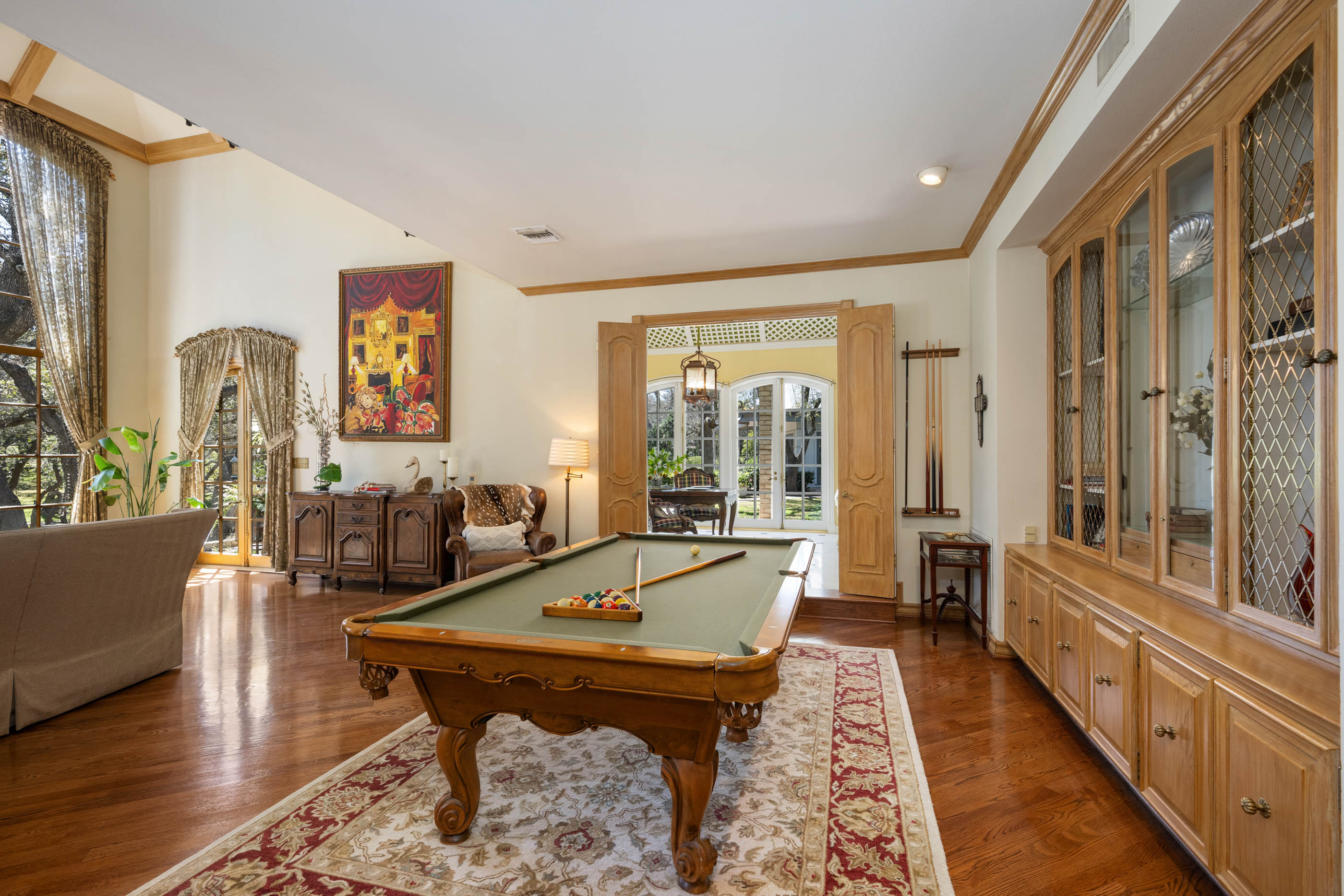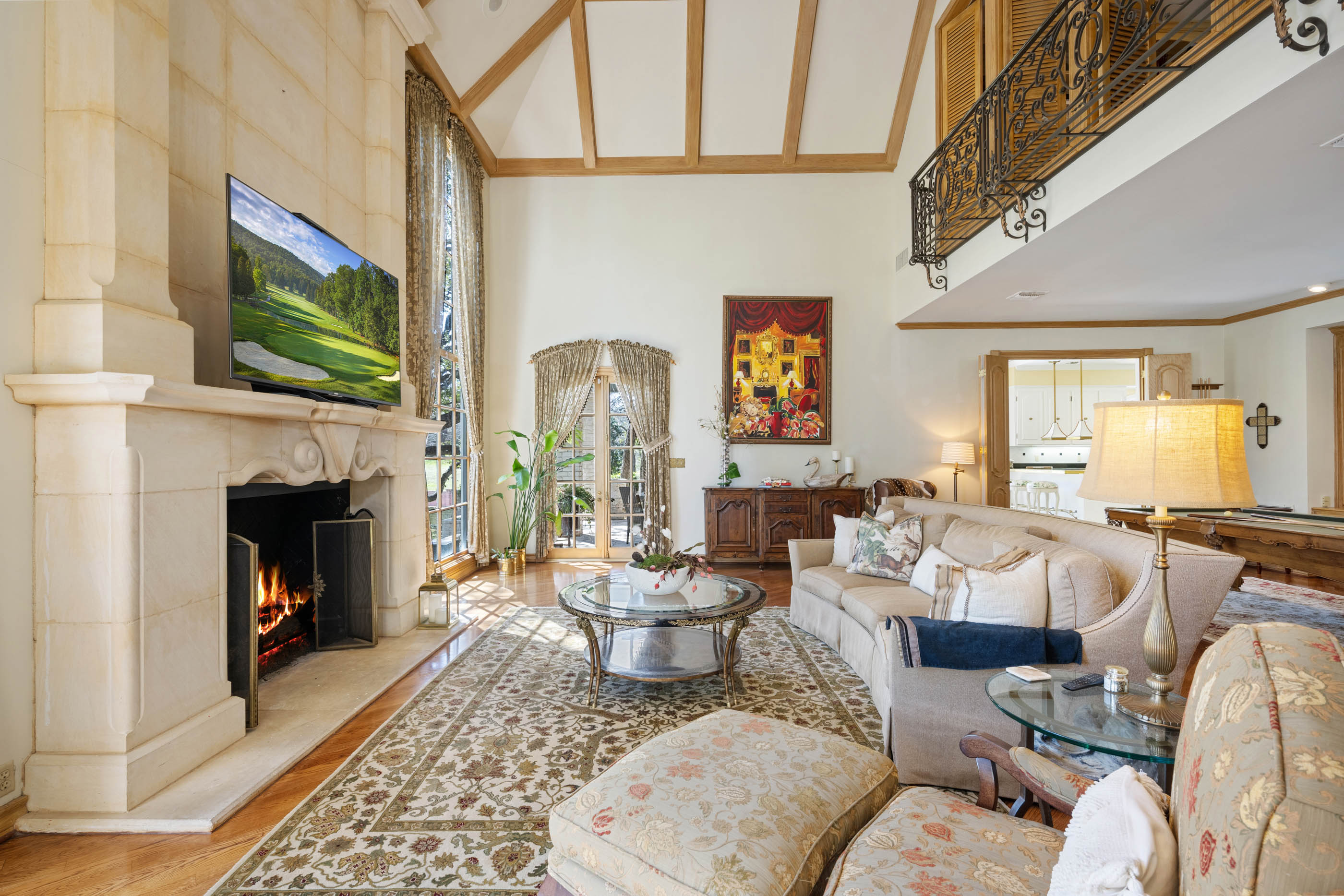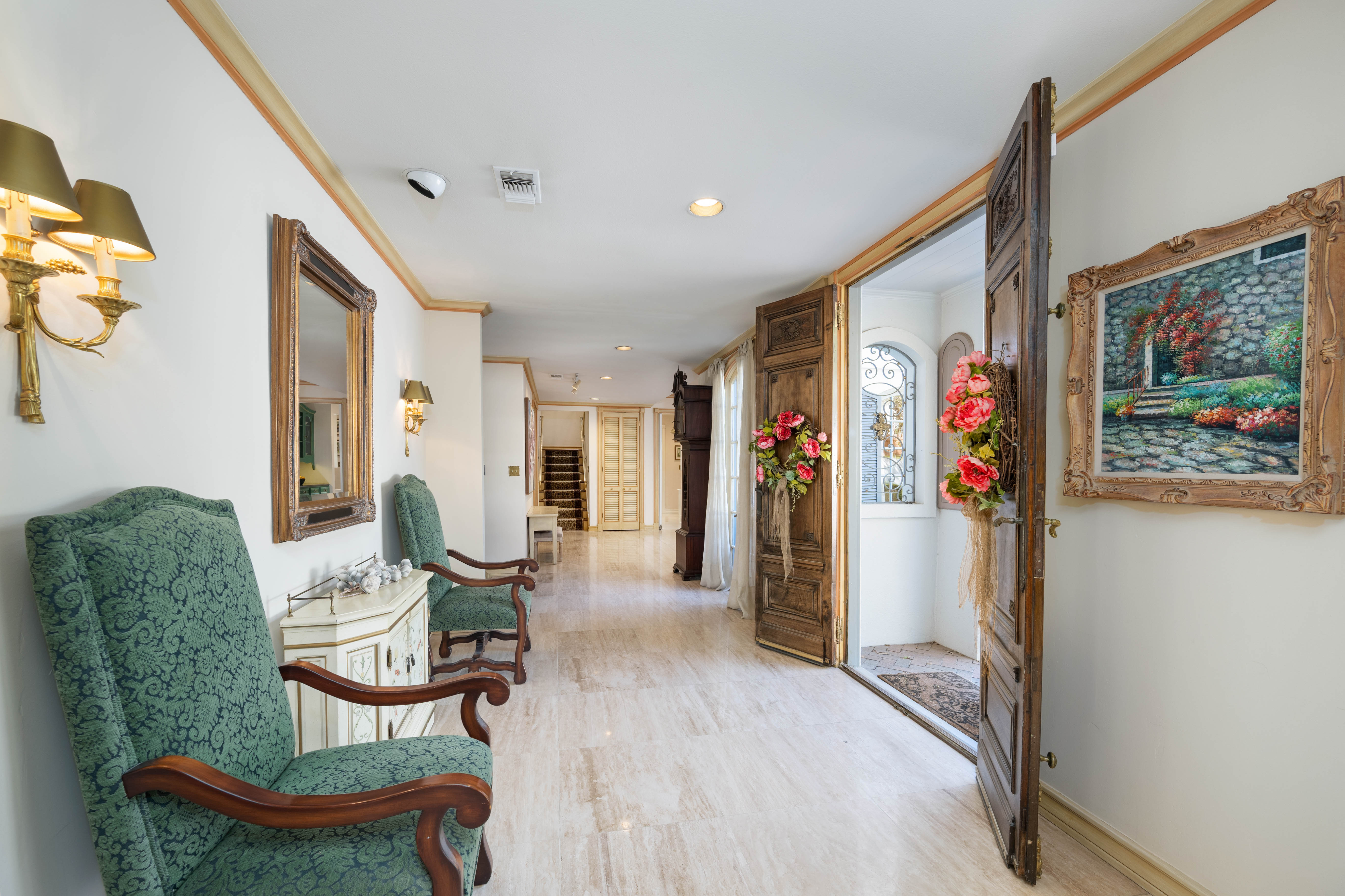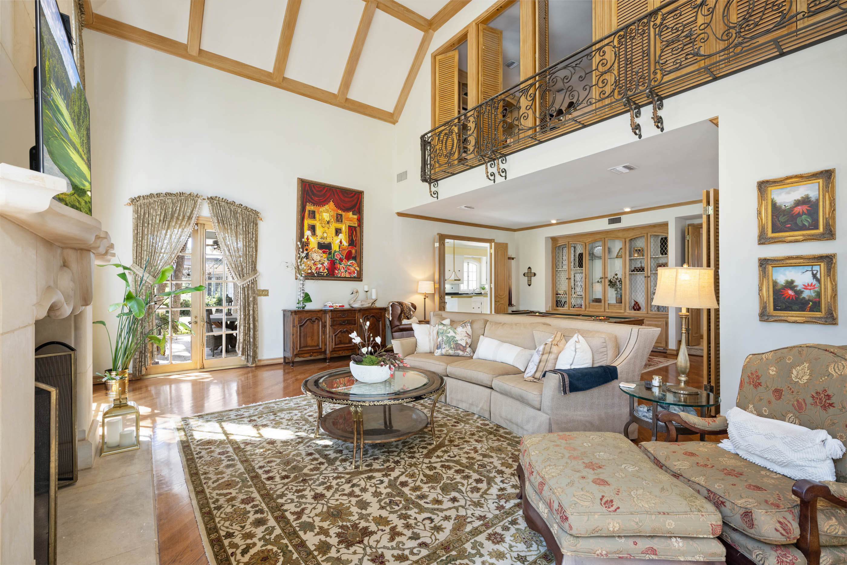 Tucked behind private gates on 6.5 acres of beautifully manicured grounds, this exceptional French-inspired estate offers a rare blend of timeless elegance and modern luxury in an unparalleled location. A winding, tree-lined drive welcomes you, leading past lush gardens and a picturesque 2.5-acre lake, setting the stage for this remarkable residence. Designed with influences from the French countryside, the home boasts soaring ceilings, graceful archways, and expansive windows that frame breathtaking views of the pool and surrounding landscape. Gleaming wood floors anchor the grand living spaces, seamlessly flowing from one room to the next. The formal dining room, illuminated by an intricate chandelier, sits adjacent to a thoughtfully designed island kitchen, perfectly positioned for both everyday living and entertaining. The private owner's wing is a true retreat, featuring a spacious suite, a cozy sitting area with a fireplace, and a remodeled spa-like bath. Throughout the home, bespoke details including preserved Sherle Wagner fixtures add a touch of timeless glamour. A richly paneled library and a stately billiards room provide additional spaces for relaxation and entertainment. Stepping outside, the estate continues to impress with an array of resort-style amenities. A tennis court, putting green, and sparkling pool with a spa create an entertainer's paradise, while a separate guest house complete with a built-in Teppanyaki grill offers a private sanctuary for visitors. A greenhouse and meticulously maintained gardens further enhance the property's serene ambiance. Offering grand proportions yet an inviting warmth, this estate is a rare find, secluded yet conveniently located just minutes from I-10, embodying the perfect harmony of refined sophistication and natural beauty.