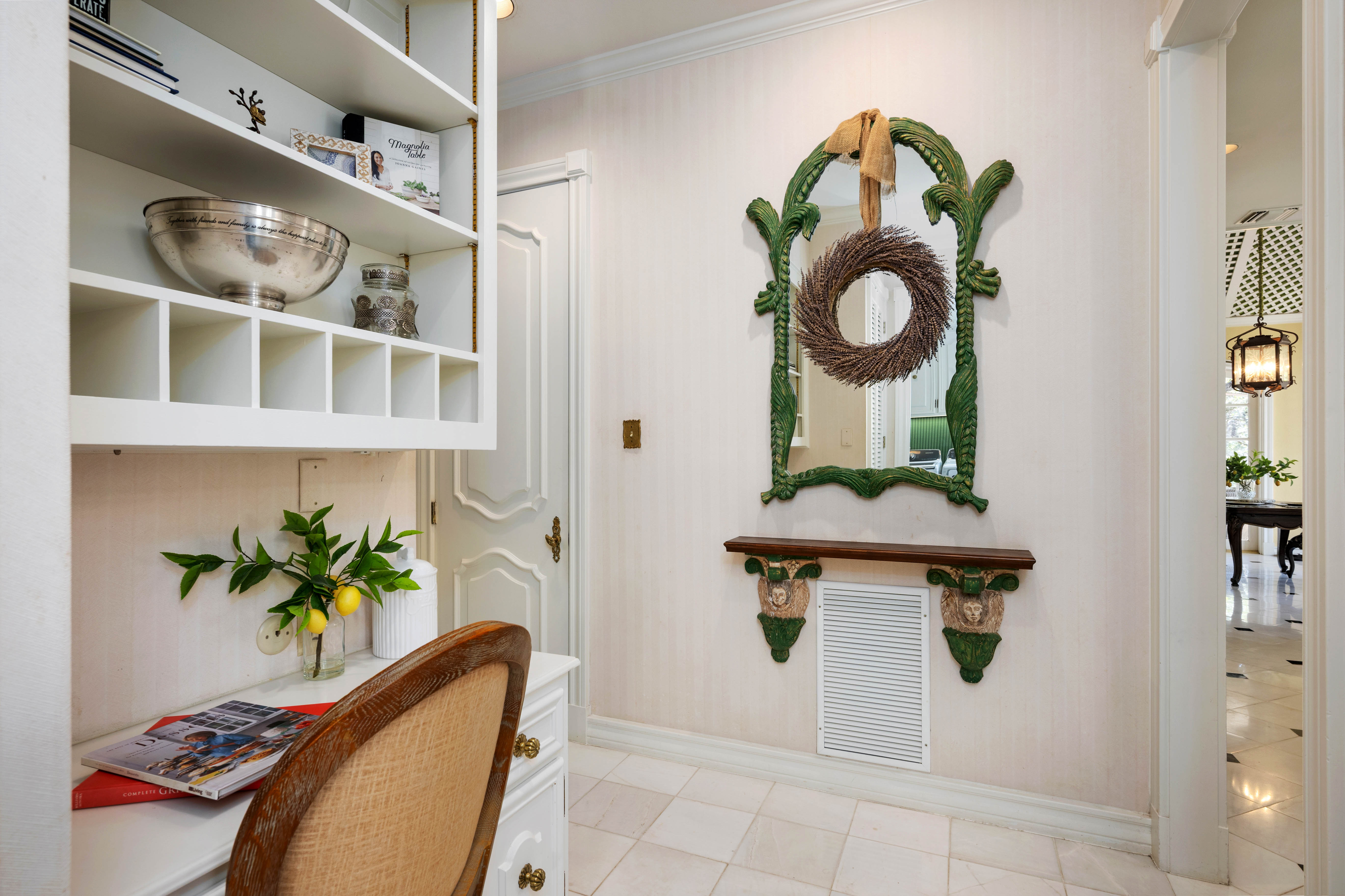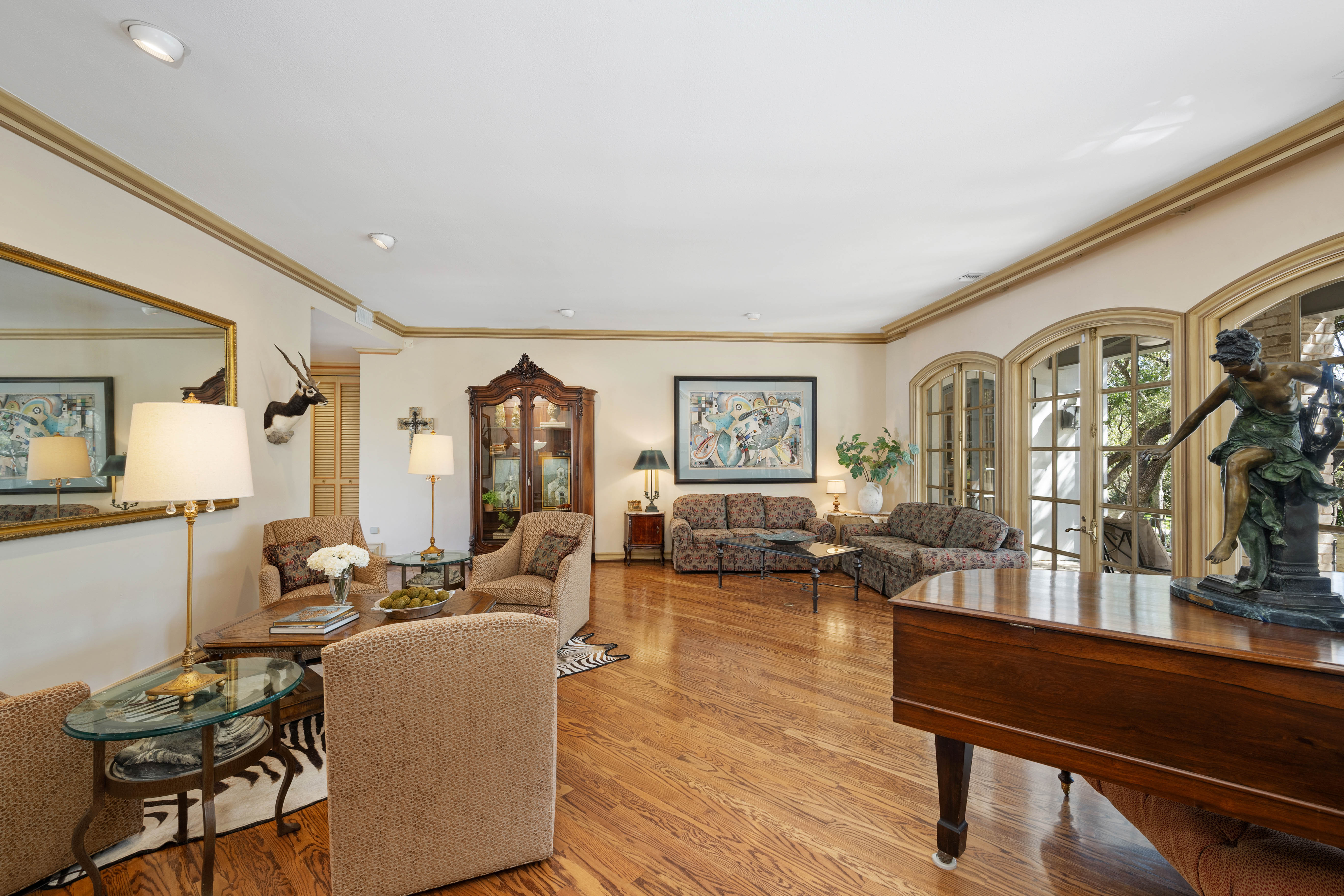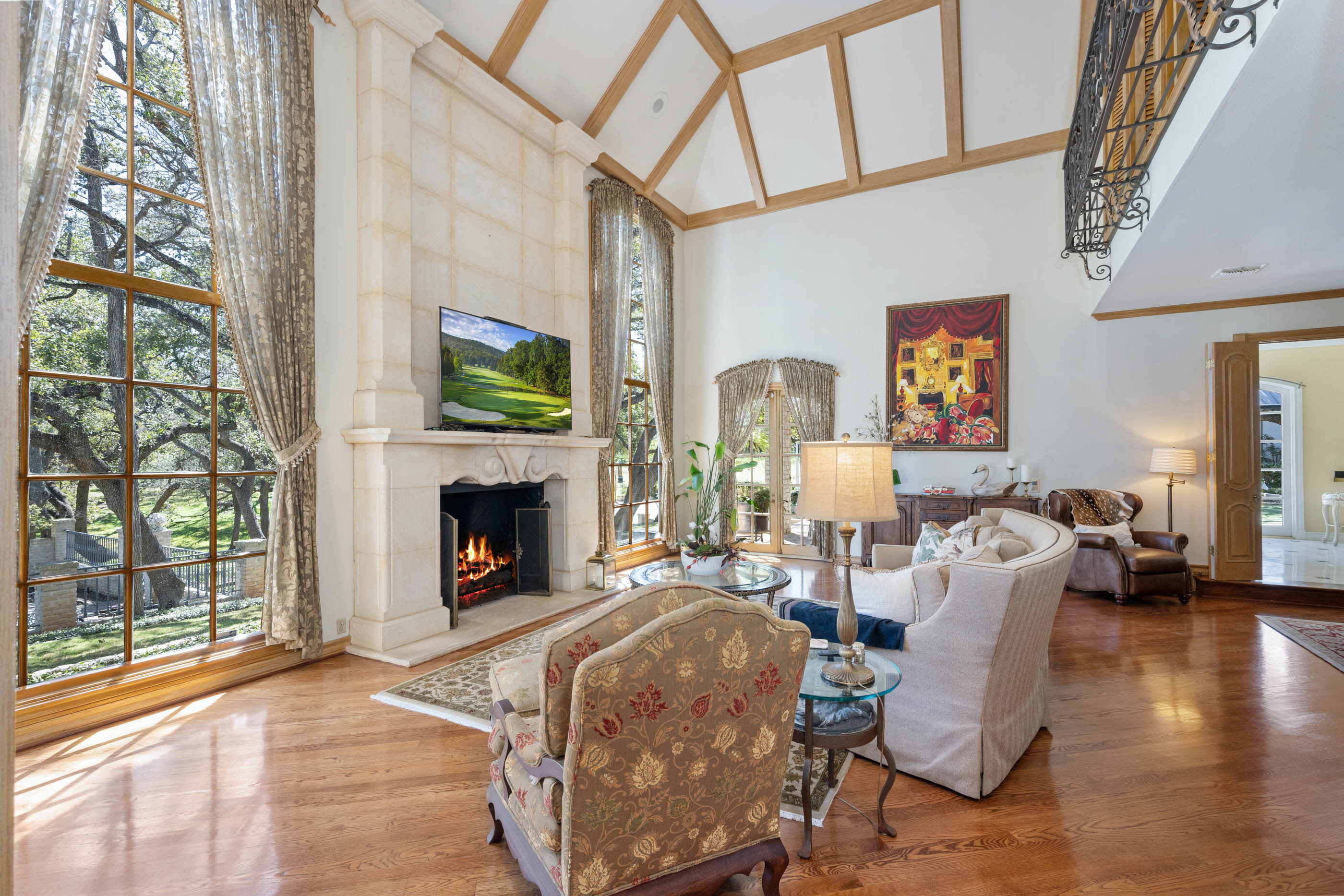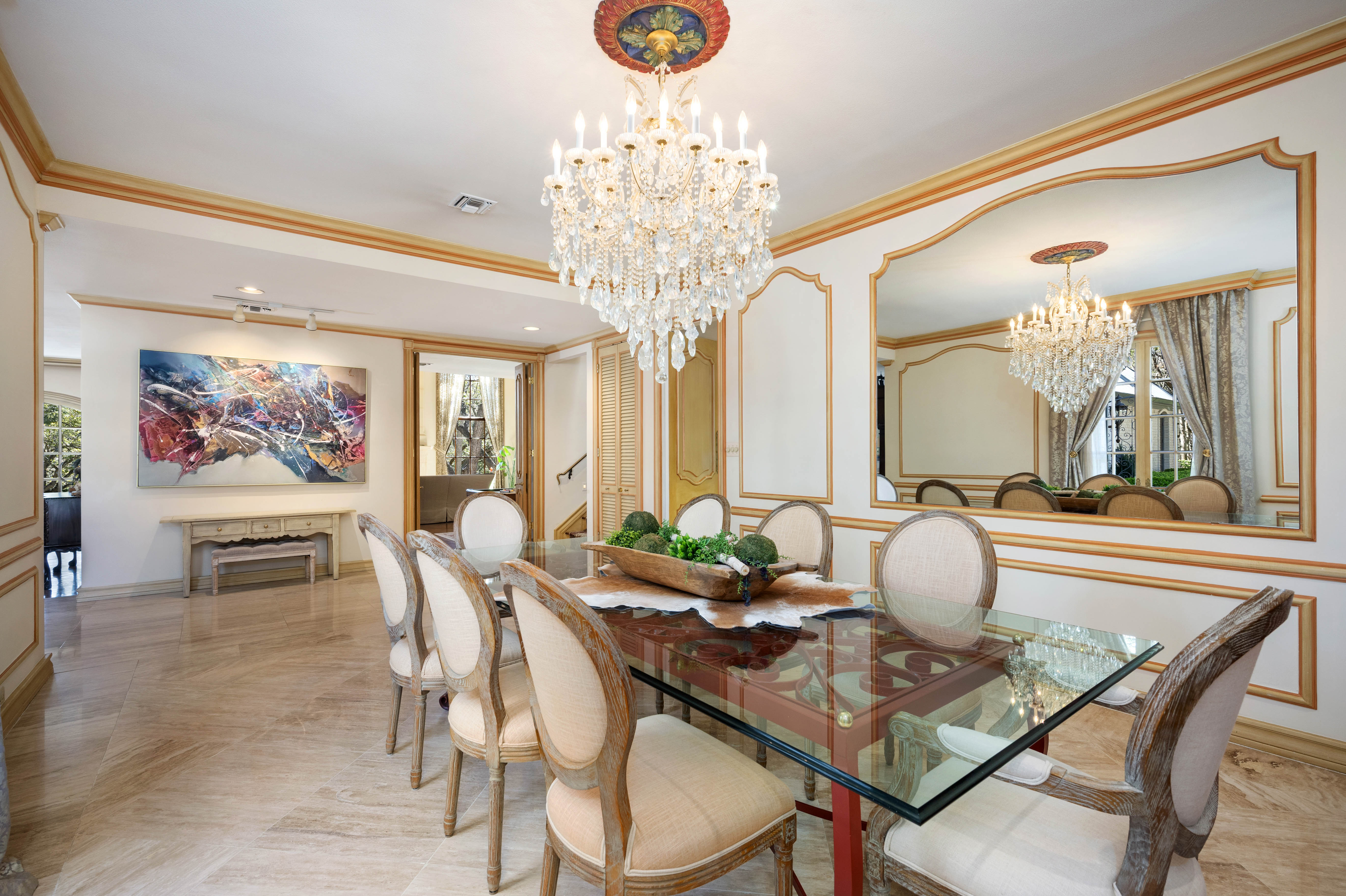 Tucked behind private gates on 6.5 acres of beautifully manicured grounds, this exceptional French-inspired estate offers a rare blend of timeless elegance and modern luxury in an unparalleled location. A winding, tree-lined drive welcomes you, leading past lush gardens and a picturesque 2.5-acre lake, setting the stage for this remarkable residence. Designed with influences from the French countryside, the home boasts soaring ceilings, graceful archways, and expansive windows that frame breathtaking views of the pool and surrounding landscape. Gleaming wood floors anchor the grand living spaces, seamlessly flowing from one room to the next. The formal dining room, illuminated by an intricate chandelier, sits adjacent to a thoughtfully designed island kitchen, perfectly positioned for both everyday living and entertaining. The private owner's wing is a true retreat, featuring a spacious suite, a cozy sitting area with a fireplace, and a remodeled spa-like bath. Throughout the home, bespoke details including preserved Sherle Wagner fixtures add a touch of timeless glamour. A richly paneled library and a stately billiards room provide additional spaces for relaxation and entertainment. Stepping outside, the estate continues to impress with an array of resort-style amenities. A tennis court, putting green, and sparkling pool with a spa create an entertainer's paradise, while a separate guest house complete with a built-in Teppanyaki grill offers a private sanctuary for visitors. A greenhouse and meticulously maintained gardens further enhance the property's serene ambiance. Offering grand proportions yet an inviting warmth, this estate is a rare find, secluded yet conveniently located just minutes from I-10, embodying the perfect harmony of refined sophistication and natural beauty.