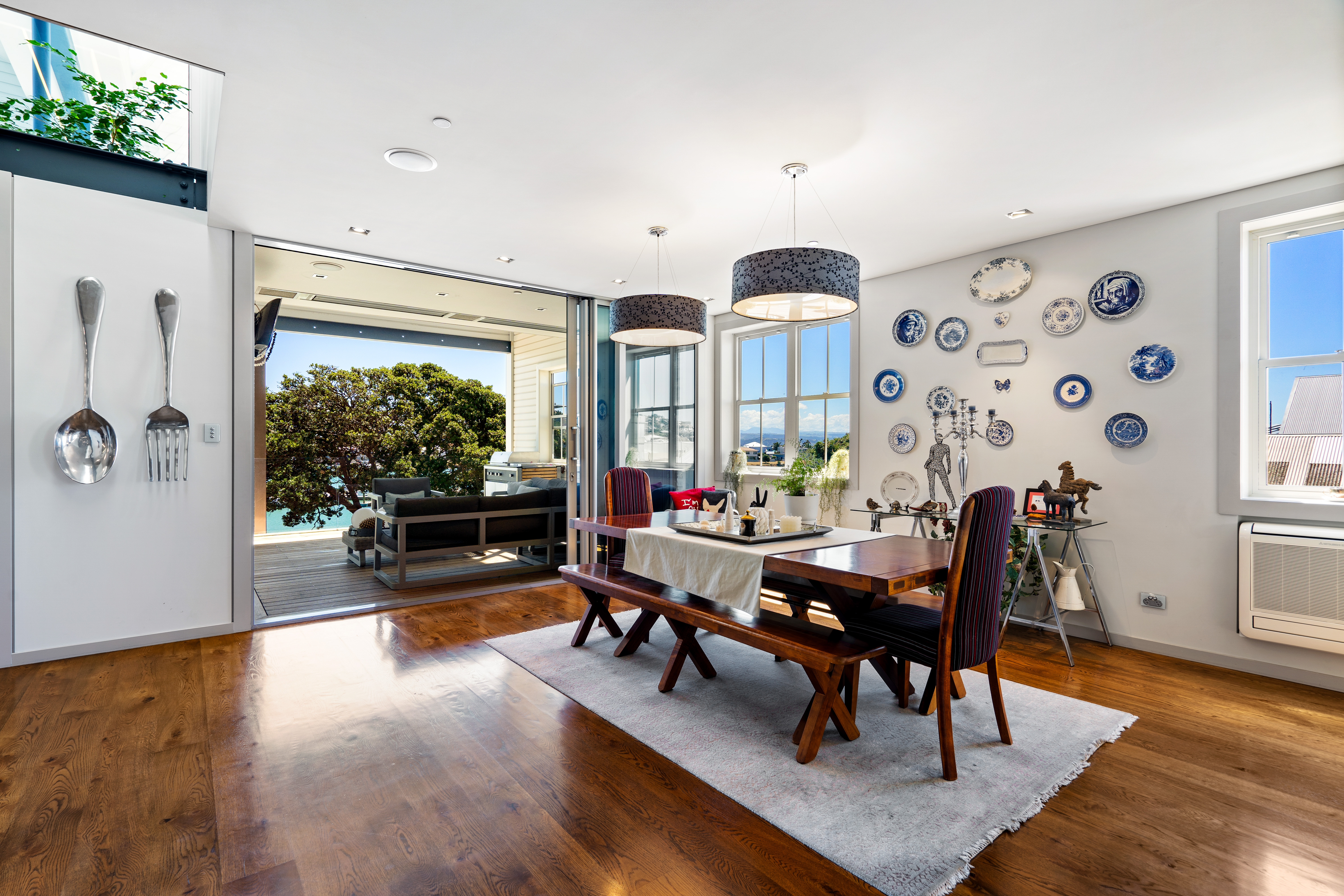 This former wool store brims with authenticity and charm, blending polished American oak floors, a striking saw-tooth roof, and expansive glazing that fills adaptable spaces with light and volume rarely seen in conventional homes. The open-plan living area, complete with a cosy gas fire, is a bright and versatile space for lounging and entertaining. The designer kitchen, featuring a walk-in scullery and top-of-the-line appliances, is an entertainer’s delight. Adjacent, the dining area flows seamlessly into the living room, with stacker doors opening onto an expansive deck that spans the front of the residence, offering breathtaking panoramic views. A separate media room complements the living spaces, adding flexibility and privacy.