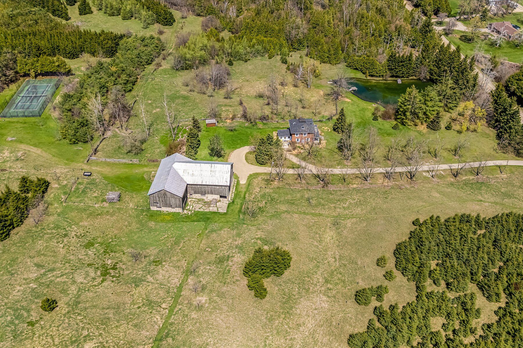 Escape to the rolling hills of Mulmur and discover this beautifully preserved three-storey brick farmhouse set on 88 acres of pristine countryside and wonderful private walking trails through pastures and forests. Rich in character and lovingly maintained, the home exudes warmth and timeless charm offering a rare opportunity to embrace the very best of country living. Enter through the welcoming front veranda or opt for the side foyer with direct access from the driveway. The main floor is filled with natural light and features a spacious living room with original wood trim and a cozy wood-burning fireplace, a formal dining room with hardwood floors and tranquil pond views, and an upgraded kitchen with stainless steel appliances. A powder room, full four-piece bath, and laundry room add comfort and convenience. Upstairs, four bright bedrooms share another four-piece bath. The third floor unveils a sunlit open loft with cathedral ceiling, its own bathroom, and endless versatility ideal as a fifth bedroom, home office, art studio, or serene yoga retreat. The natural surroundings are truly exceptional, with sweeping vistas, a spring-fed pond ideal for swimming, and private trails winding through mature forests. Approximately 50,000 trees have been thoughtfully planted, enhancing the property's privacy and year-round appeal. Outdoor highlights include a large classic bank barn, tennis court, and ample open space for recreation or relaxation. A long driveway leads to a circular drive with parking for 15+ vehicles perfect for hosting gatherings. Tucked away on a quiet country road with breathtaking views and unmatched seclusion, this exceptional property is just minutes from Mansfield Ski Club, Mono Cliffs Provincial Park, the Bruce Trail, 20 minutes to Mad River Golf, Devil's Glen ski and the charming village of Creemore.