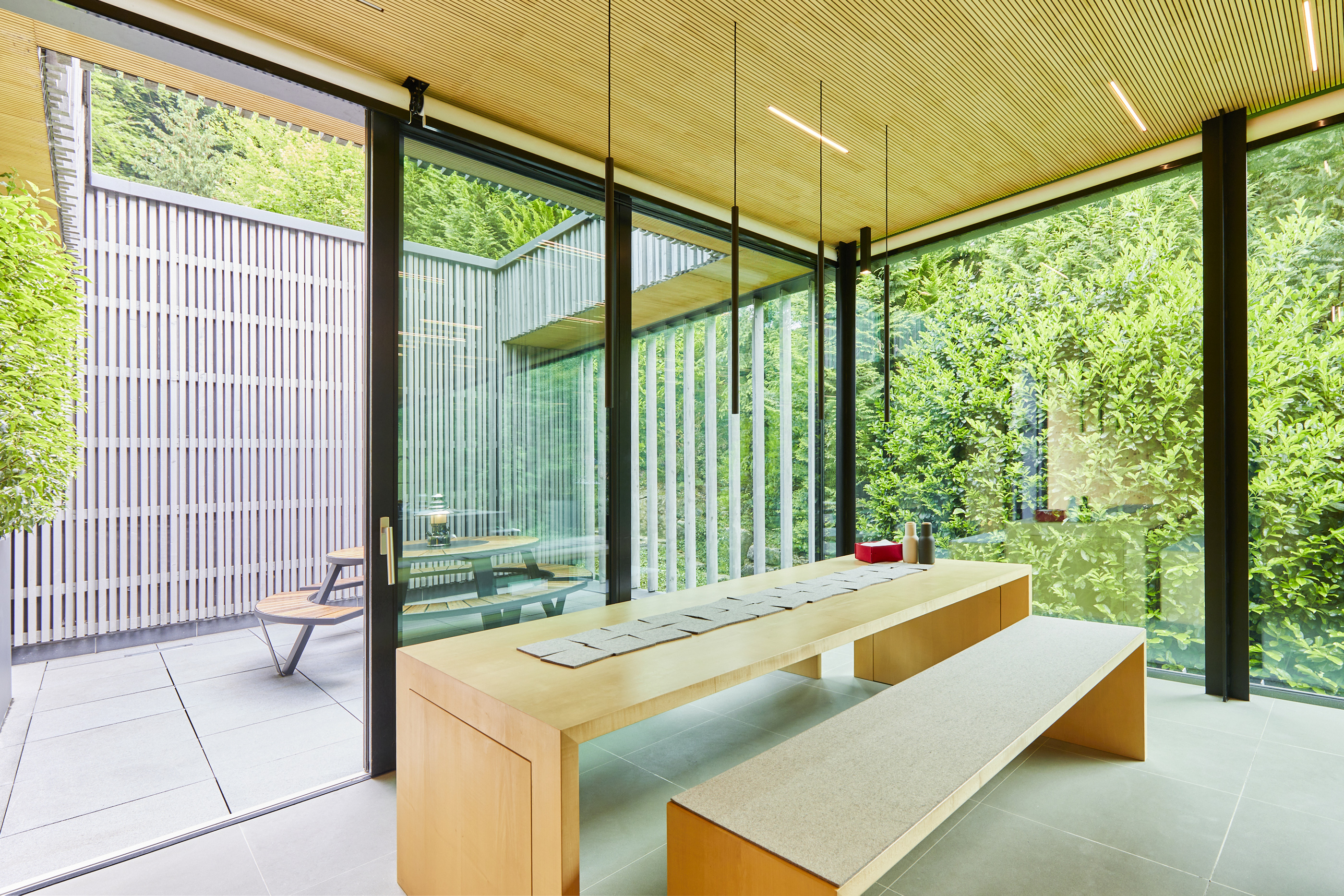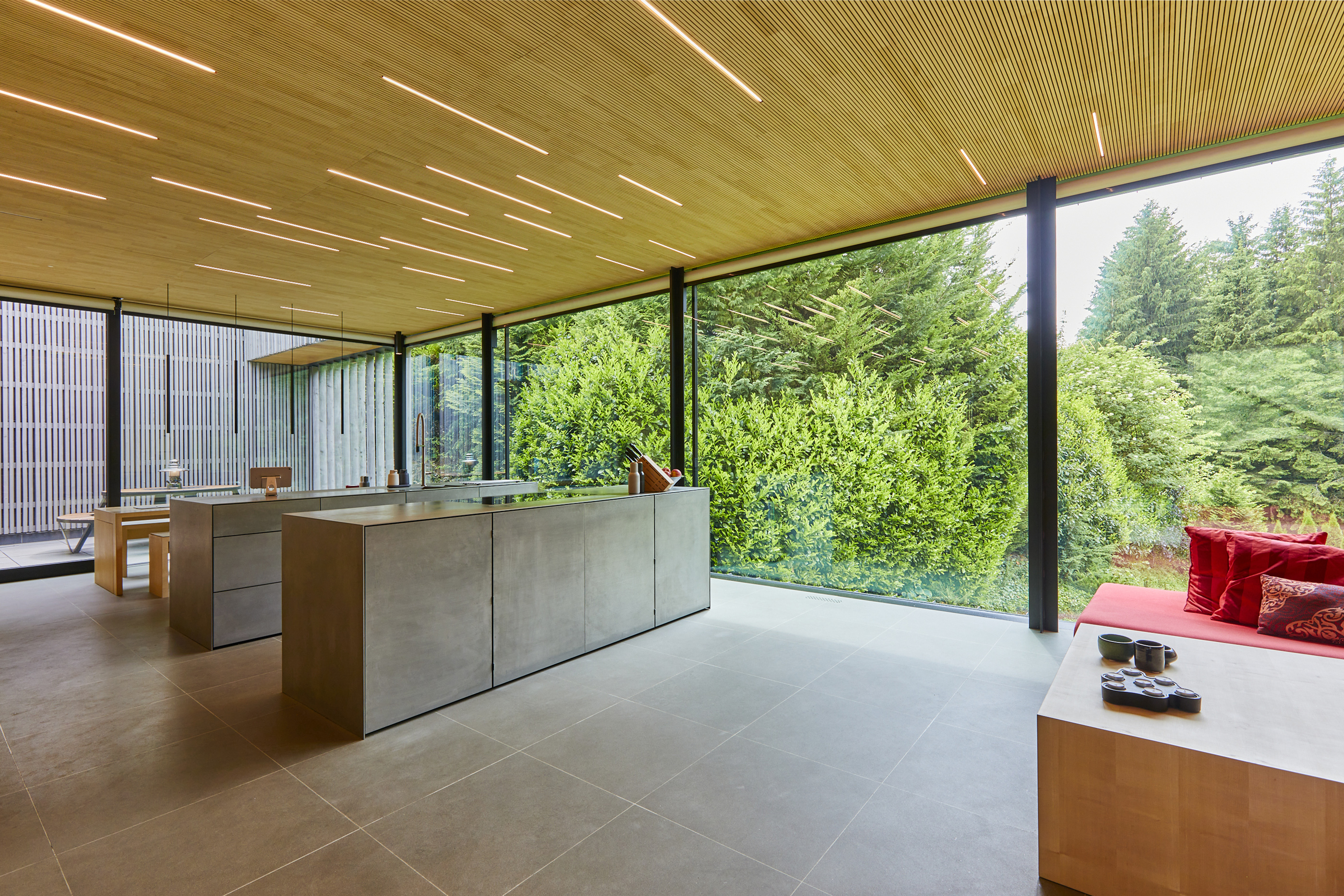 On the lower level, you will find three bedrooms, including a master suite with walk-in closet and en-suite shower room. Each room has been designed to open generously onto the outdoors, allowing you to enjoy the peaceful natural scenery in every season, thanks to large glazed sections placed at bed level. This floor also includes a second bathroom, separate toilet, a spacious office, laundry room, and storage area.