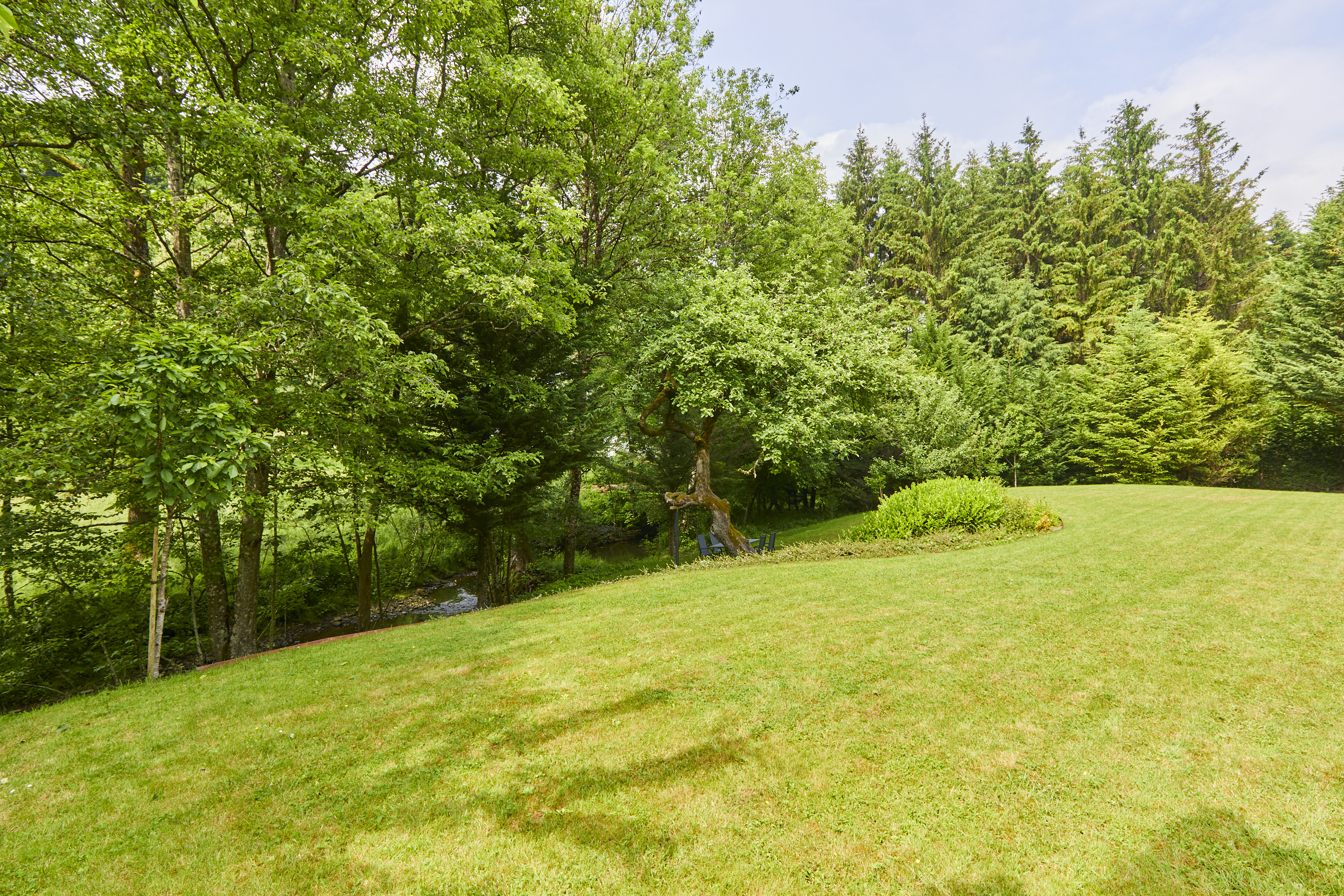 Below the main garden, a second landscaped level invites relaxation with a shaded terrace beside the stream – a setting of rare serenity, like a living painting.