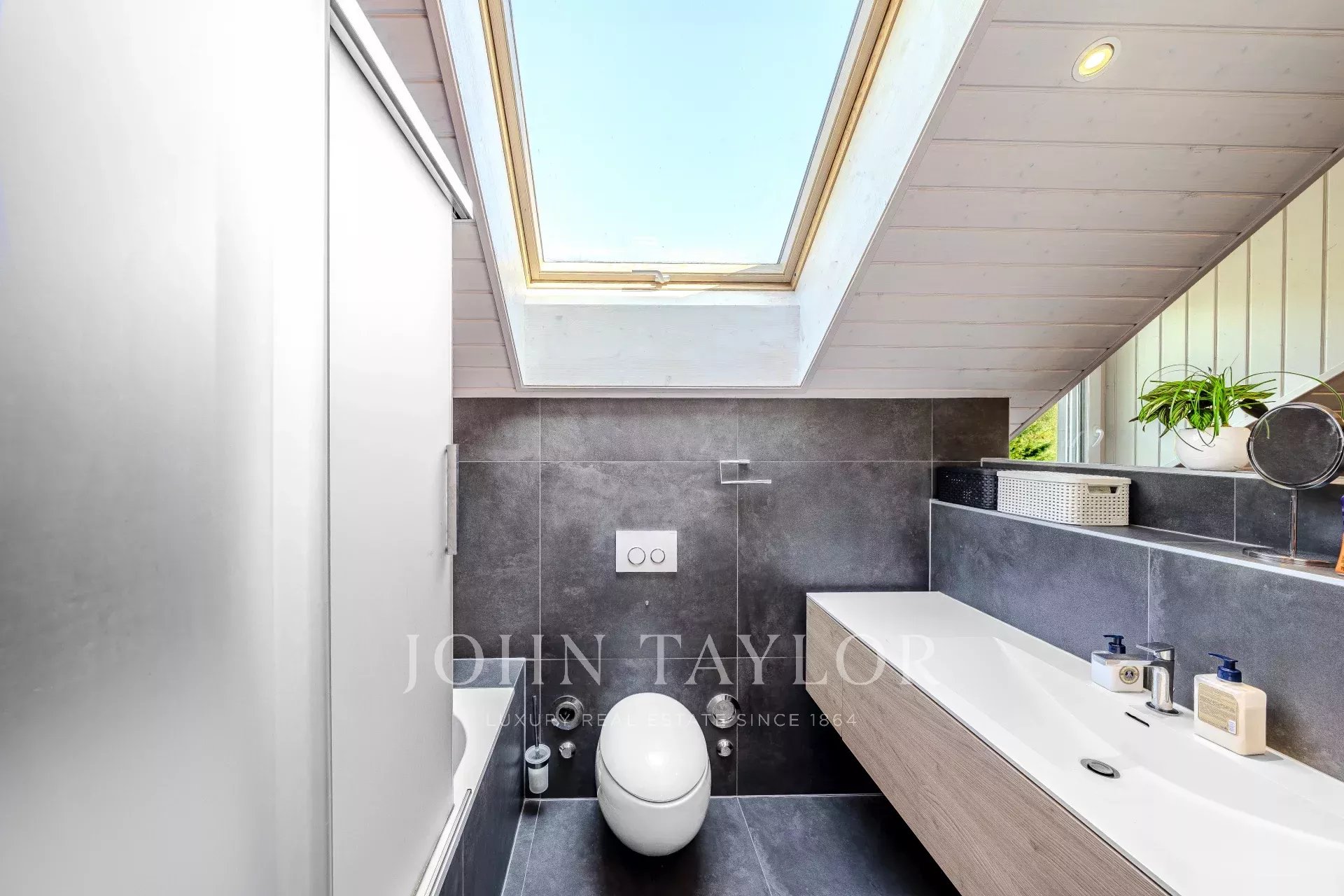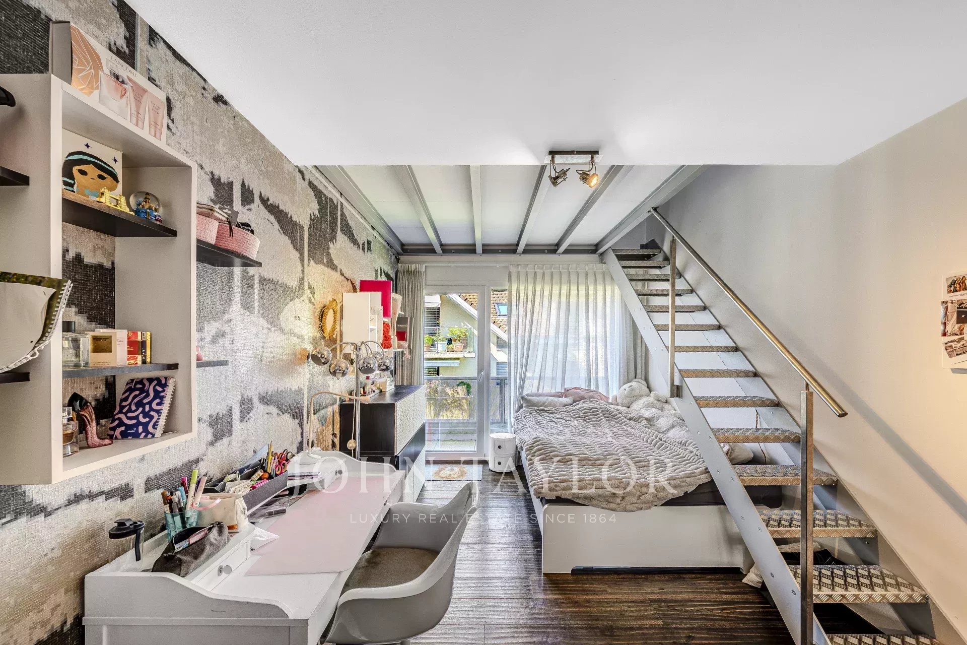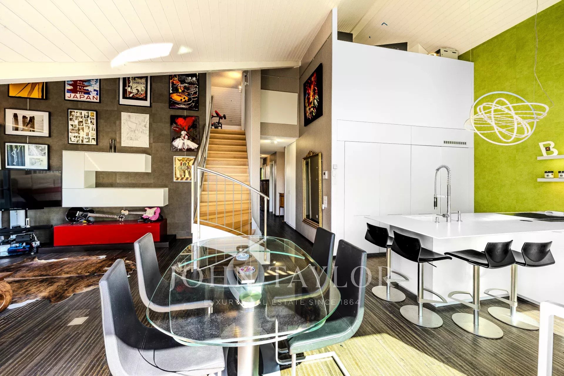 Property Overview:Perched on the top floor of a prestigious residence, this 220 m² split-level duplex offers an atmosphere that is both elegant, functional, and bathed in natural light.- Layout Highlights:A generous living room with a fully equipped open-plan kitchen, enhanced by an impressive 5 m ceiling height.Large floor-to-ceiling triple-glazed windows, ensuring maximum brightness and excellent insulation.A spacious terrace and a linear balcony accessible from every bedroom, offering private, serene outdoor space.- Sleeping Quarters:Master suite (28 m²): ample and refined, complete with its own en-suite bathroom and walk-in closet.Two additional bedrooms (20 m² & 22 m²): fitted with lofts/mezzanines, ideal for a workspace, reading nook, or relaxation area.Two well-appointed shower rooms.Average ceiling height of 3 m, enhancing the feeling of space and comfort.- Upper Level: Flexible SpaceThe upper level offers a versatile area that can be adapted to your needs—whether as a second living room, home office, playroom, or additional bedrooms.- Premium Amenities:Underfloor heating via geothermal pumpElectric blindsCentral alarm systemVideo intercomUniversal wiring for seamless connectivity in every room- Optional Garage:Two enclosed garages are available, each featuring a motorized door and electric vehicle charging outlet, priced at CHF 75,000 each.Exceptional Lifestyle:This unique duplex combines top-tier finishes, spacious volumes, and immediate proximity to amenities and schools. A rare address—synonymous with comfort, elegance, and outstanding quality of life—a true gem to fall in love with.