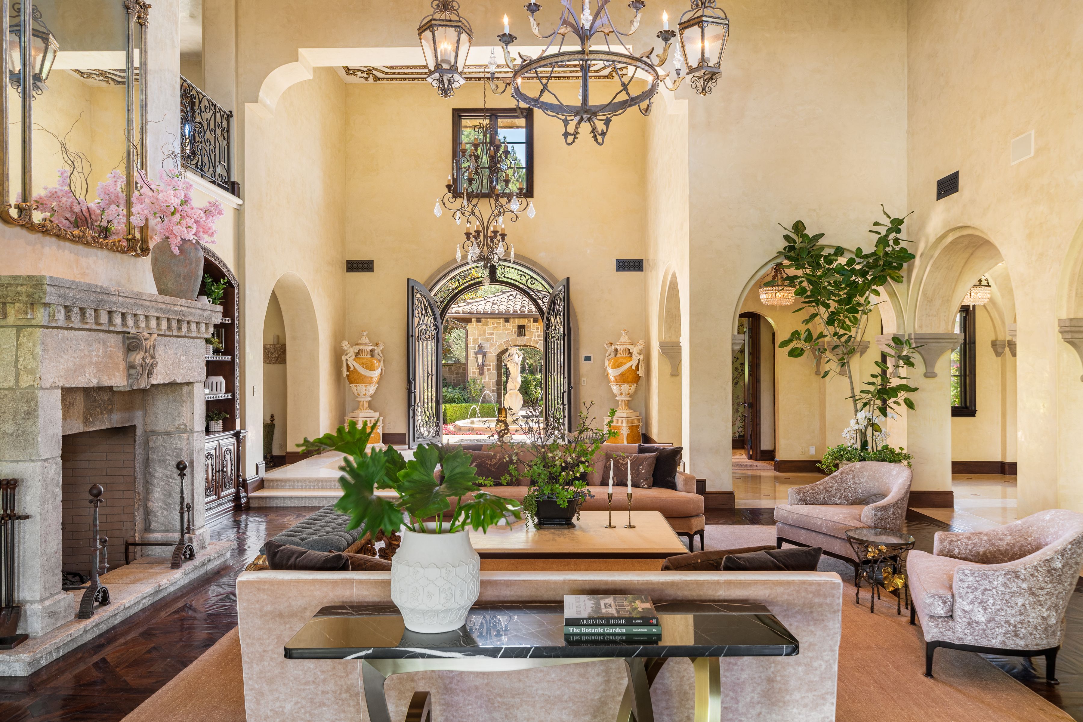 Highlights include a detached guest casita, a fully self-contained guest cottage, and interiors adorned with Venetian plaster walls, imported limestone, Crema Marfil marble, and custom Versailles-patterned hardwood flooring. The great room boasts soaring beamed ceilings and a dramatic stone fireplace, while the formal dining room opens to a serene courtyard. The gourmet kitchen, complete with massive island, butler’s pantry, and Wolf/Sub-Zero appliances, extends seamlessly outdoors to a loggia with fireplace, kitchen, and bar overlooking the infinity-edge pool and spa.