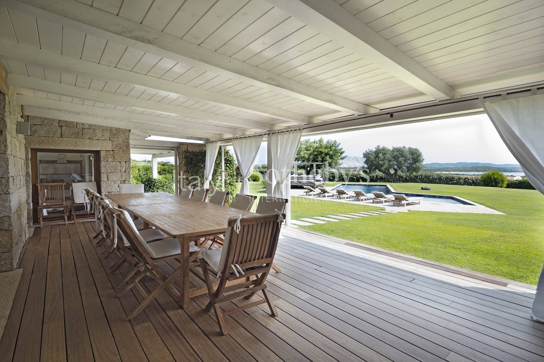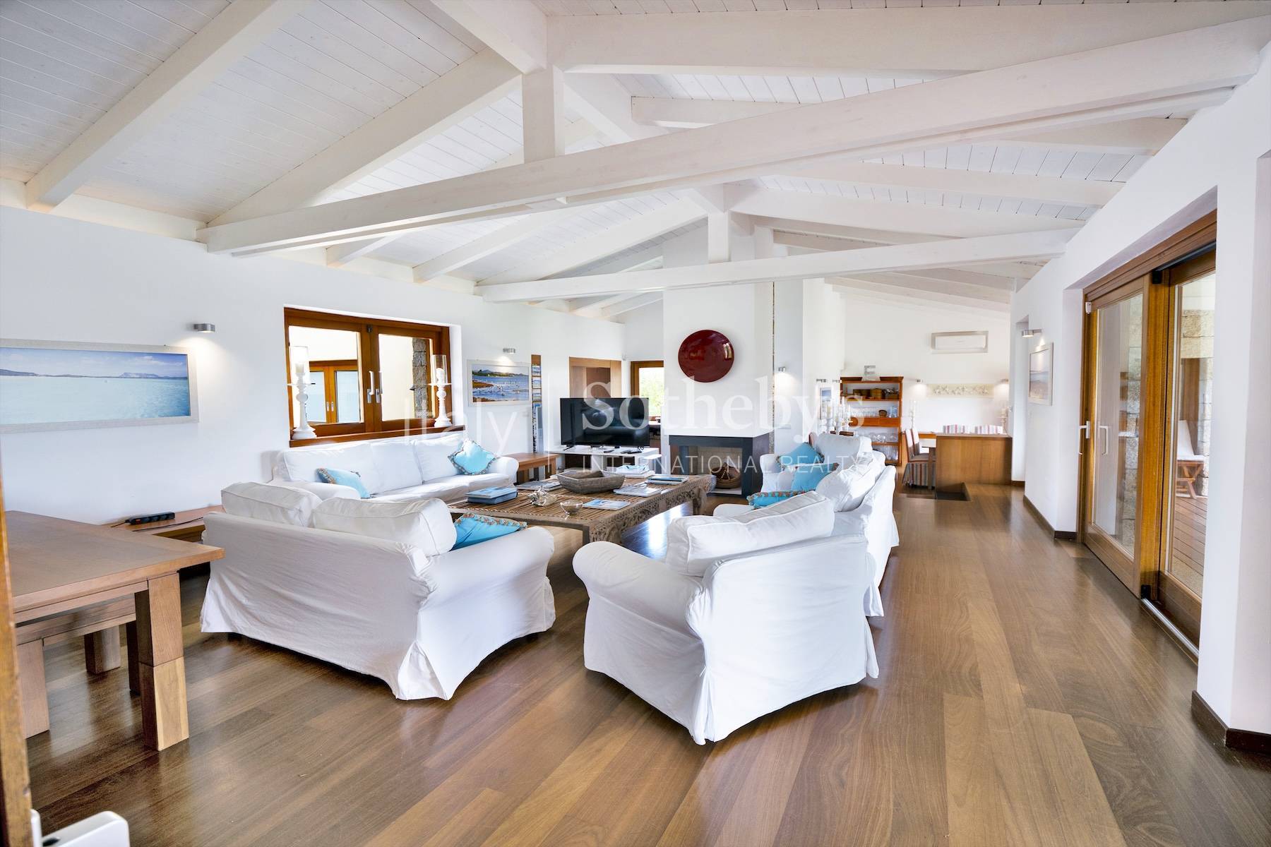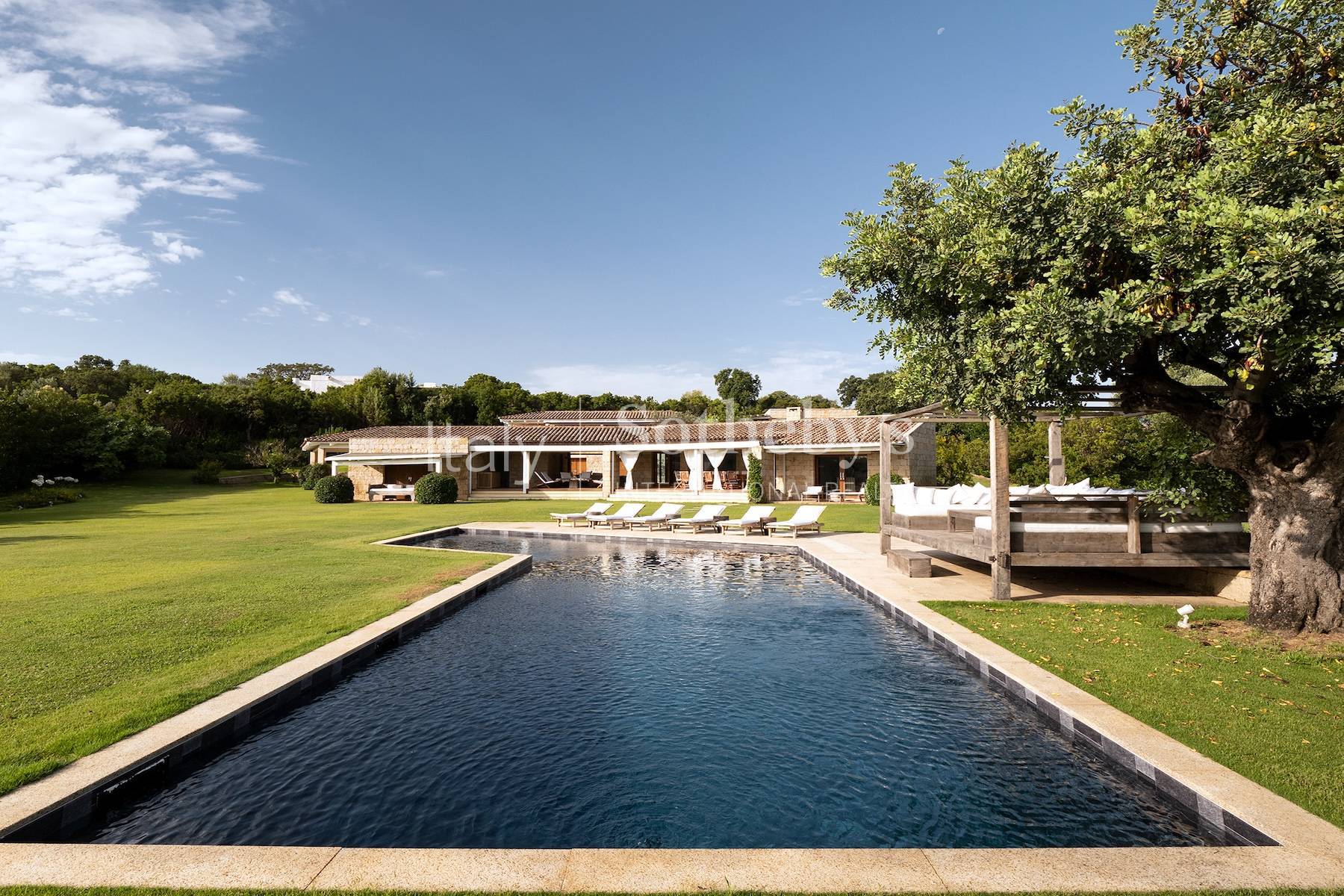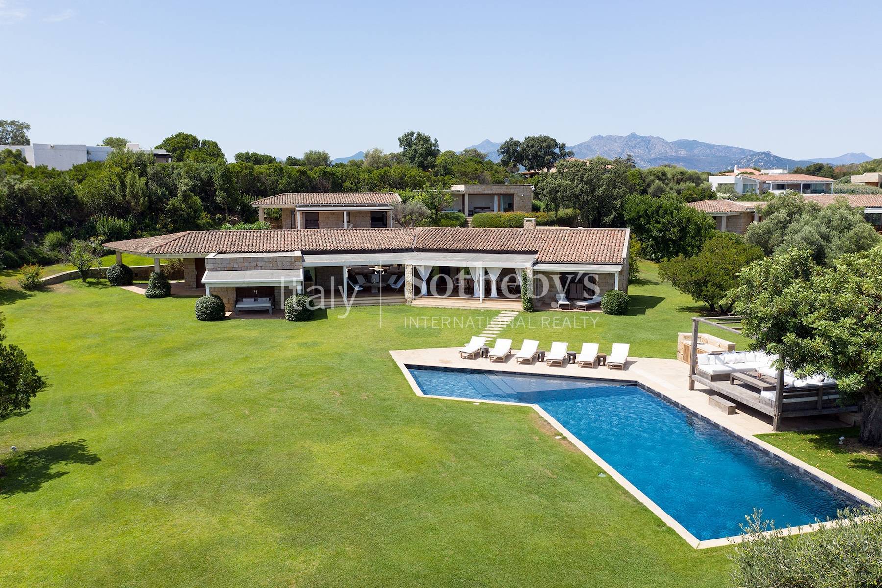 This villa is situated within the luxury real estate complex "I Giardini d'Aldia," just a short distance of 1000 meters from the stunning Lu Impostu beach. The property features a main building and two annexes, benefiting from ample natural light due to sliding glass doors leading to sea-facing verandas. Set on a generous 5000 sqmt plot - 53819 sq.ft, the villa boasts an enormous garden size, which includes a small orchard, providing a lush outdoor space for relaxation and enjoyment. Entering through the main building's veranda, you find a spacious living area with a fireplace, tastefully furnished for comfort while enjoying sea views. The dining room accommodates up to 10 guests, also offering beautiful sea vistas. The villa includes seven bright bedrooms and seven bathrooms, adorned with white walls and furnishings that enhance the brightness, complemented by parquet flooring. Two additional staff bedrooms are available, accommodating 5-6 people. Several technical rooms and a laundry area are present, along with spaces that could be transformed into a spa area or gym, adding potential value to the property. The villa is accessed via an electric gate that opens to a large entrance area with covered parking for two cars, as well as additional parking spaces. A charming stone path leads through the garden to a spacious veranda, featuring a large wooden table for 12 and a light-colored outdoor lounge area that can be closed off when it's windy, providing a seamless connection between the living and sleeping areas. The architectural style mirrors the traditional Stazzo Gallurese, reimagined with modern elements and expansive windows. The villa is conveniently located near Lu Impostu beach, accessible via a scenic pathway through the complex leading to the Baglioni hotel. A large swimming pool with a Balinese bed provides a refreshing escape on warm days, perfect for relaxation away from the beach crowds.