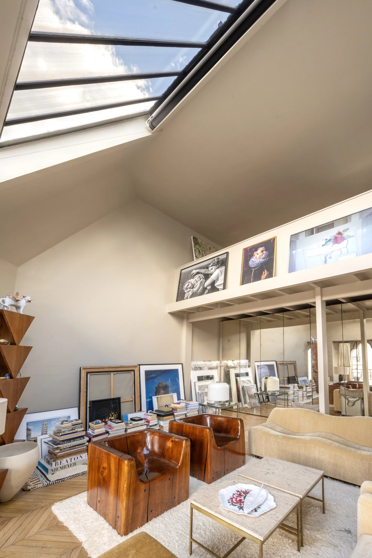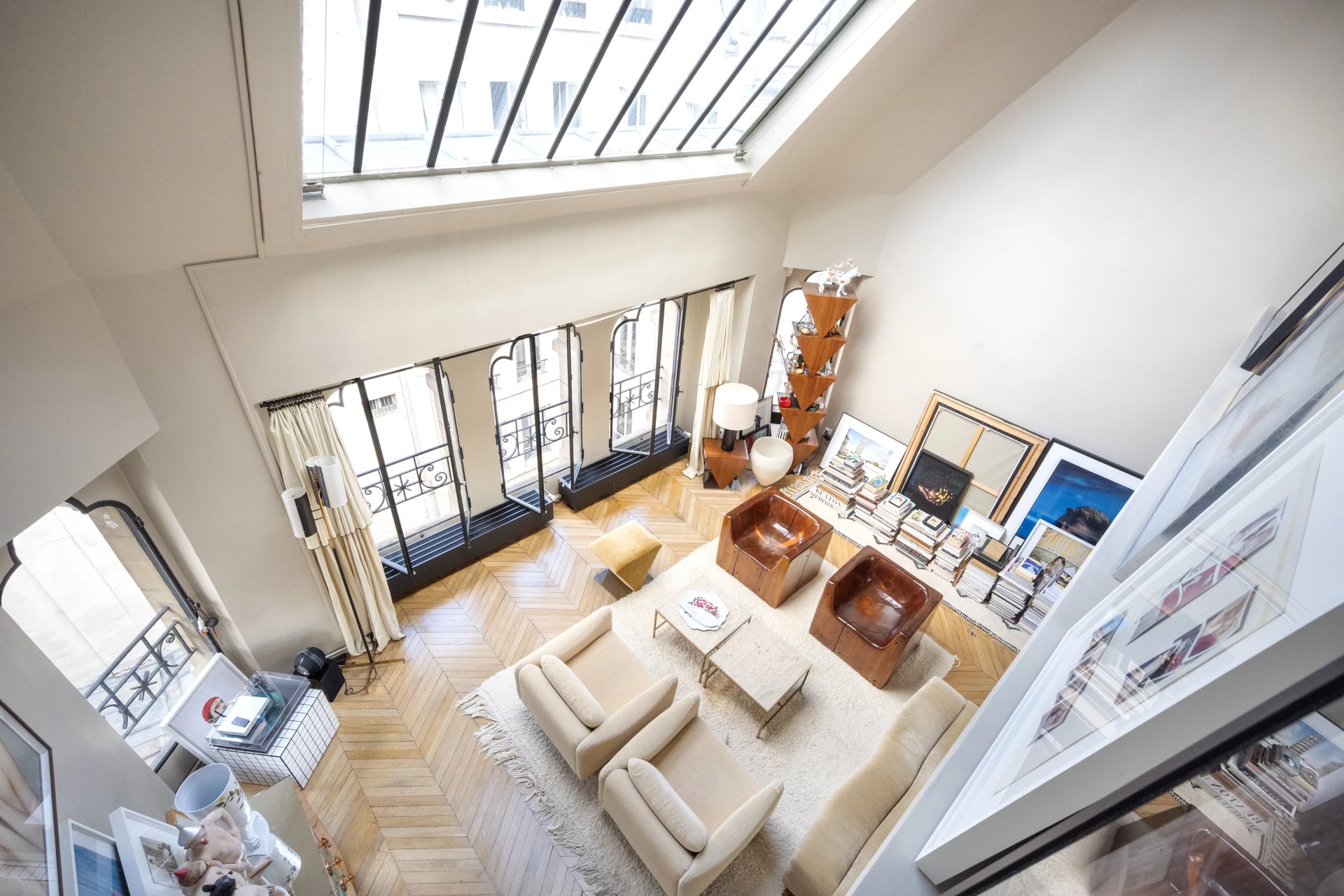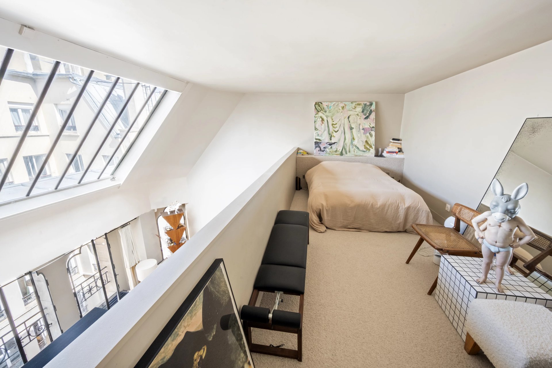 Trudaine neighbourhood. This tastefully renovated and beautifully appointed former artist's studio is on the 3rd and top floor of a fine mid 19th century building. It includes a spacious living/reception room featuring high ceilings with a large skylight, an open-plan kitchen, a mezzanine bedroom enjoying a view of Sacre Coeur Basilica, and a shower room.