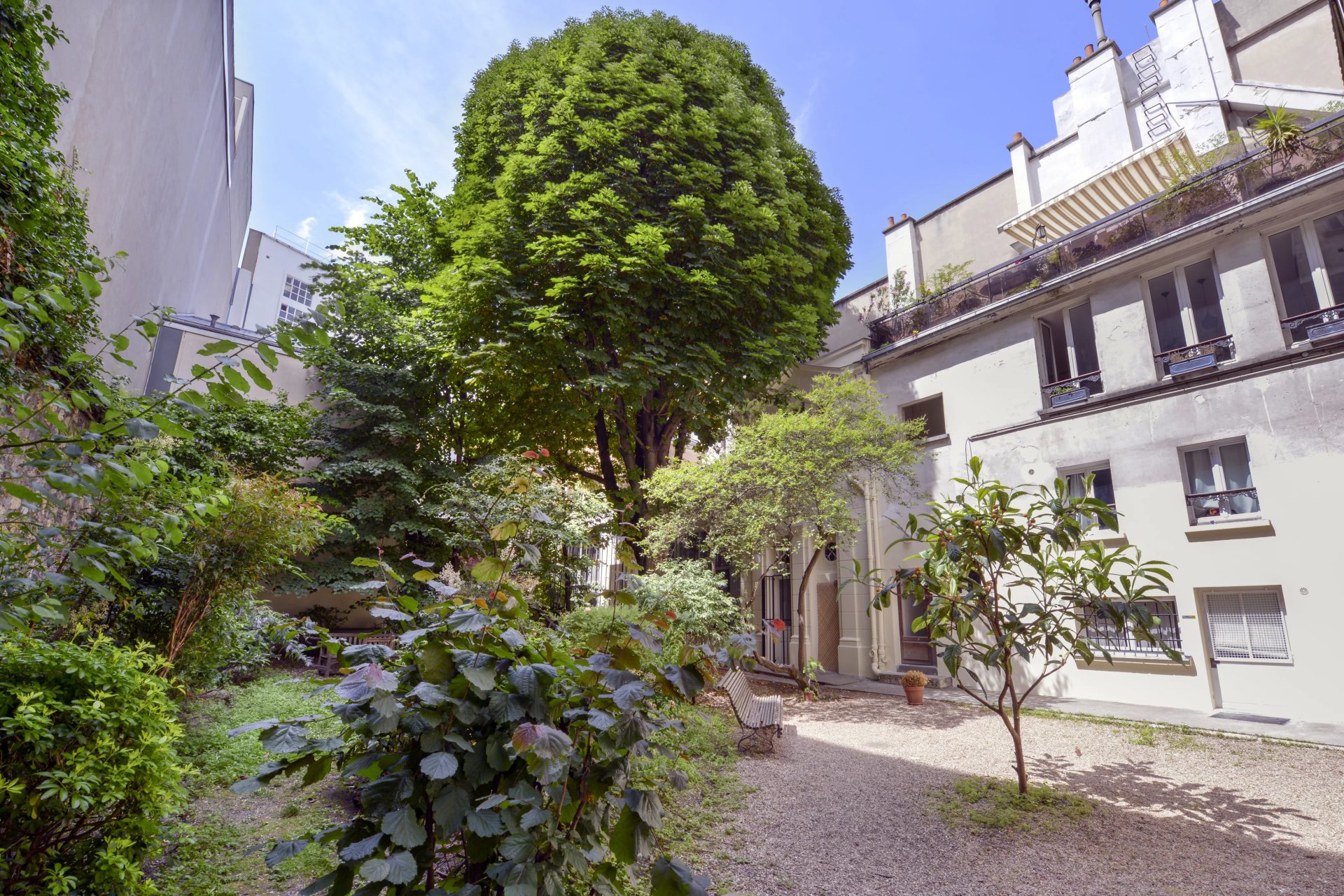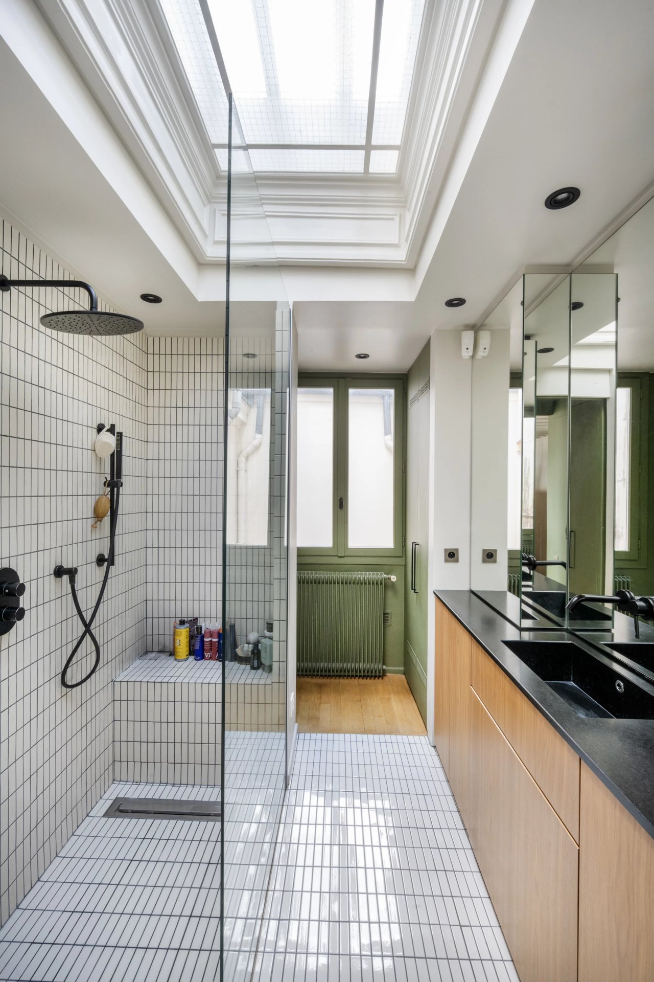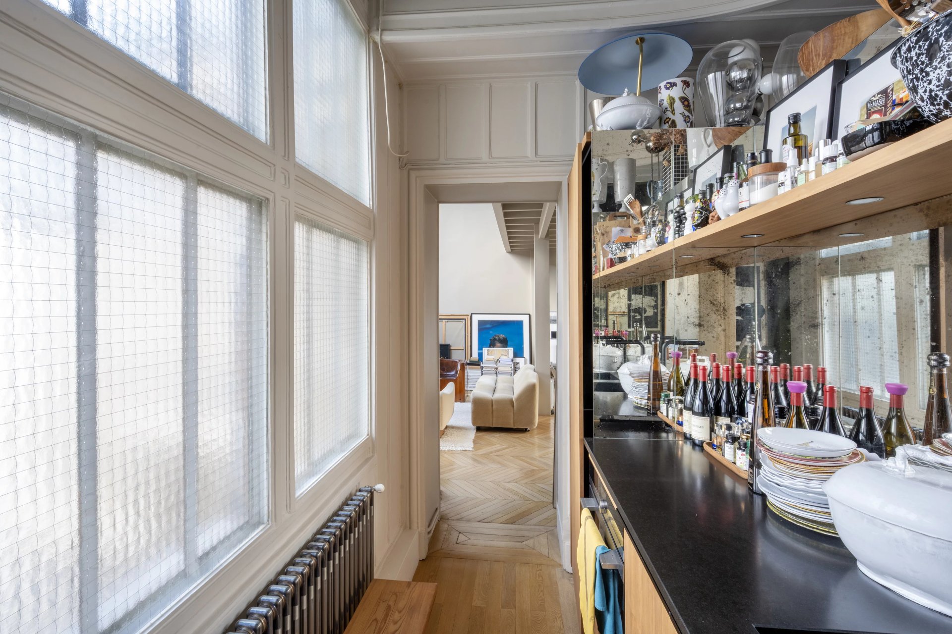 Trudaine neighbourhood. This tastefully renovated and beautifully appointed former artist's studio is on the 3rd and top floor of a fine mid 19th century building. It includes a spacious living/reception room featuring high ceilings with a large skylight, an open-plan kitchen, a mezzanine bedroom enjoying a view of Sacre Coeur Basilica, and a shower room.