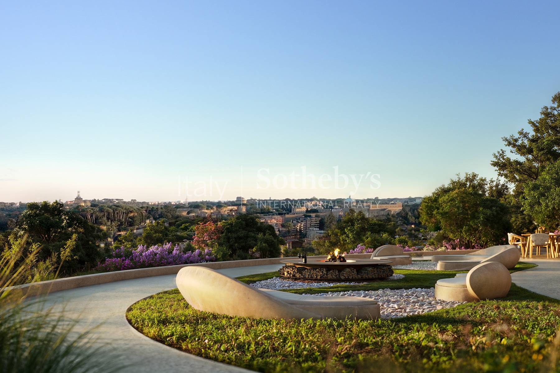 In one of Rome's most panoramic areas, Terrazze Fedro stands as a new icon of contemporary architecture, designed by the international firm MAD Architects in collaboration with Gruppo Sce Proget and Architect Stefano La Greca Bertacchi. Its fluid lines and wide loggias seem sculpted by the wind, framing breathtaking views from the Vittoriano to the Dome of St. Peter's. In this extraordinary setting, a prestigious four-bedroom residence on the second floor offers 139 sqm (1,496 sq.ft.) of interior space and 56 sqm (603 sq.ft.) of loggia terraces, featuring a spectacular view of St. Peter's Dome. The apartment comprises a spacious living room with open kitchen and floor-to-ceiling windows that create visual continuity between indoors and outdoors, and a panoramic main terrace also connected to the master bedroom. The sleeping area includes two double bedrooms-one master with en suite bathroom-a third single bedroom with its own bathroom, a guest bathroom, and a convenient laundry room. The second double bedroom and the single bedroom both access a second, more private terrace overlooking the landscaped gardens of the complex. Equipped with state-of-the-art technologies - underfloor heating, air conditioning, home automation system, alarm predisposition, and maximum energy efficiency - the property perfectly balances comfort and design. The residential complex offers exclusive amenities: a rooftop Jacuzzi, an elegant wellness room with sauna, a private park, a relaxation area with views over Rome, concierge service, and parcel storage. Cellar and parking space available separately. Completion expected: Q2 2026 - Ref. C21
