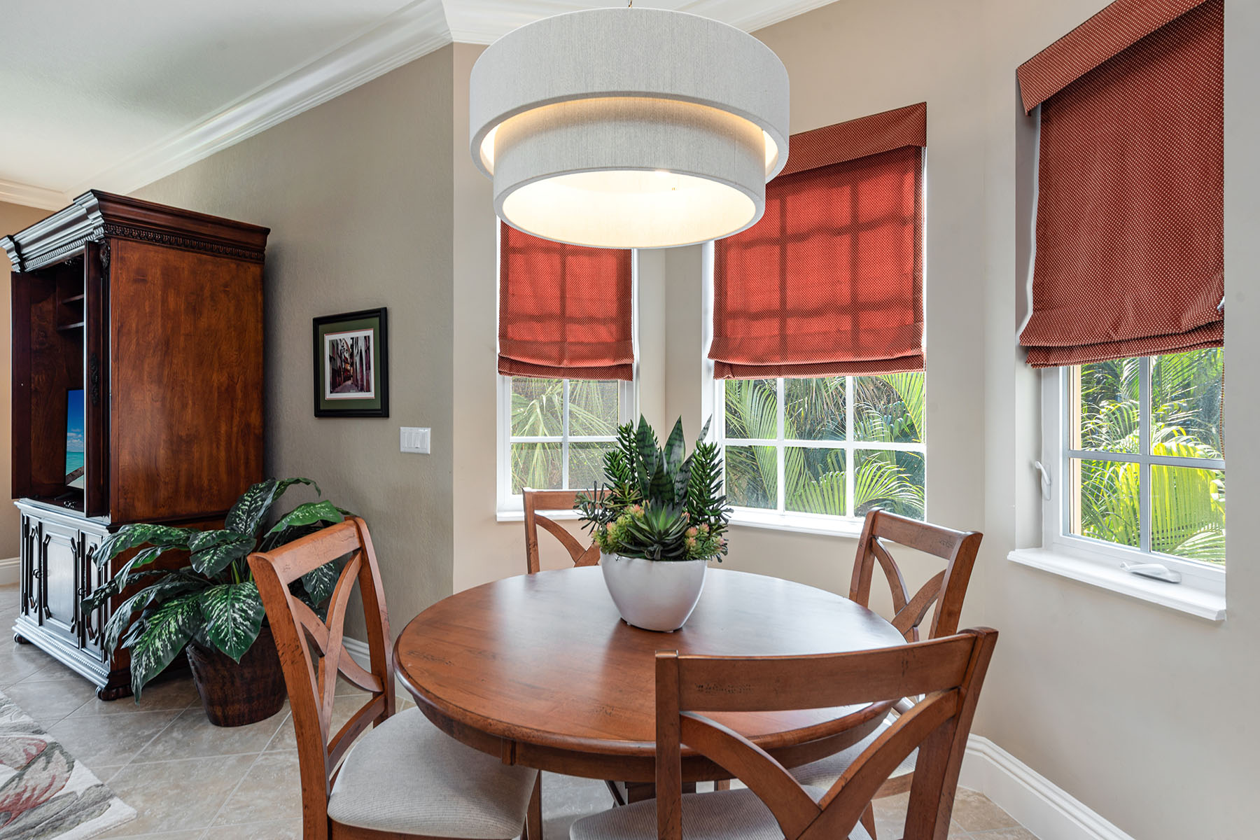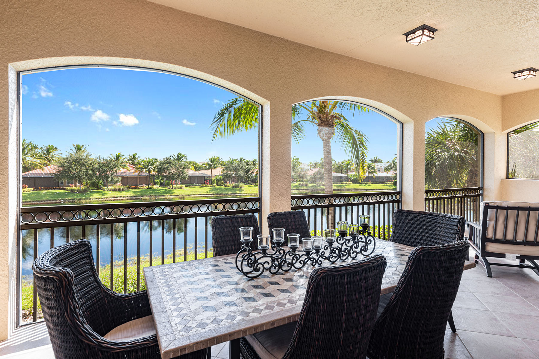 Introducing luxurious living in this elegantly furnished Menaggio residence, quality built by Gulf Bay, and located within the award-winning gated community of Fiddler's Creek. Showcasing tranquil lake views and desirable eastern exposure, this home is positioned to enjoy brilliant morning sunlight and relaxing shaded afternoons on the spacious screened lanai. Highly upgraded, meticulously maintained, and designed for refined comfort, this expansive second-floor coach home features three large bedrooms plus a den, 3.5 baths, and a private elevator leading to a beautifully appointed interior highlighted by decorator molding, plantation shutters, custom drapery and double crown molding throughout. The inviting living space opens through glass sliders to the lanai, where covered outdoor living with a ceiling fan and tile flooring provides a peaceful setting to take in the lake views. The gourmet kitchen blends style and functionality with quality Raffinati cabinetry, including glass-front displays, under-cabinet lighting, quartz countertops and backsplash, recessed lighting and a large island. A pantry with wood pullout shelving and premium GE Monogram appliances, including a cabinet-front refrigerator, 36-inch five-burner stainless cooktop, stainless wall oven, 2022 stainless microwave and cabinet-front dishwasher, completes the space. Adjacent, a charming breakfast nook framed by bay windows overlooks lush palms, while the formal dining room with a tray ceiling creates an elegant atmosphere for entertaining. Just off the dining room, a door leads to an additional pantry featuring shelving and a refrigerator, providing extra storage and convenience. The owner's suite is a serene retreat featuring lake views, a tray ceiling, lanai access, plantation shutters and two walk-in closets with wood shelving. The impressive spa-inspired bath offers dual vanities with a makeup counter, a full-width mirror, a jetted soaking tub and a walk-in shower with a glass enclosure. Two spacious guest bedrooms each include private en-suite baths, one featuring its balcony and the other often utilized as a second primary suite with an oversized bath and walk-in closet. The cozy den with French doors is ideal for a quiet office or study. Additional highlights include full storm protection with all impact glass, two recently installed air-conditioning units (2024), 18-inch porcelain tile on the diagonal in the main living areas, textured accent walls, a powder bath, a laundry room with newer Maytag washer and dryer, utility sink, water leak sensors, alarm system, overhead cabinetry and a two-car garage with epoxy flooring. A new tankless water heater (2025) adds peace of mind. Residents enjoy resort-style amenities, dining and recreation, with the optional Tarpon Club offering beach and marina access plus two golf courses. Furnished, impact-protected, and move-in ready with new HVAC and luxury upgrades, this Menaggio home offers exceptional living.