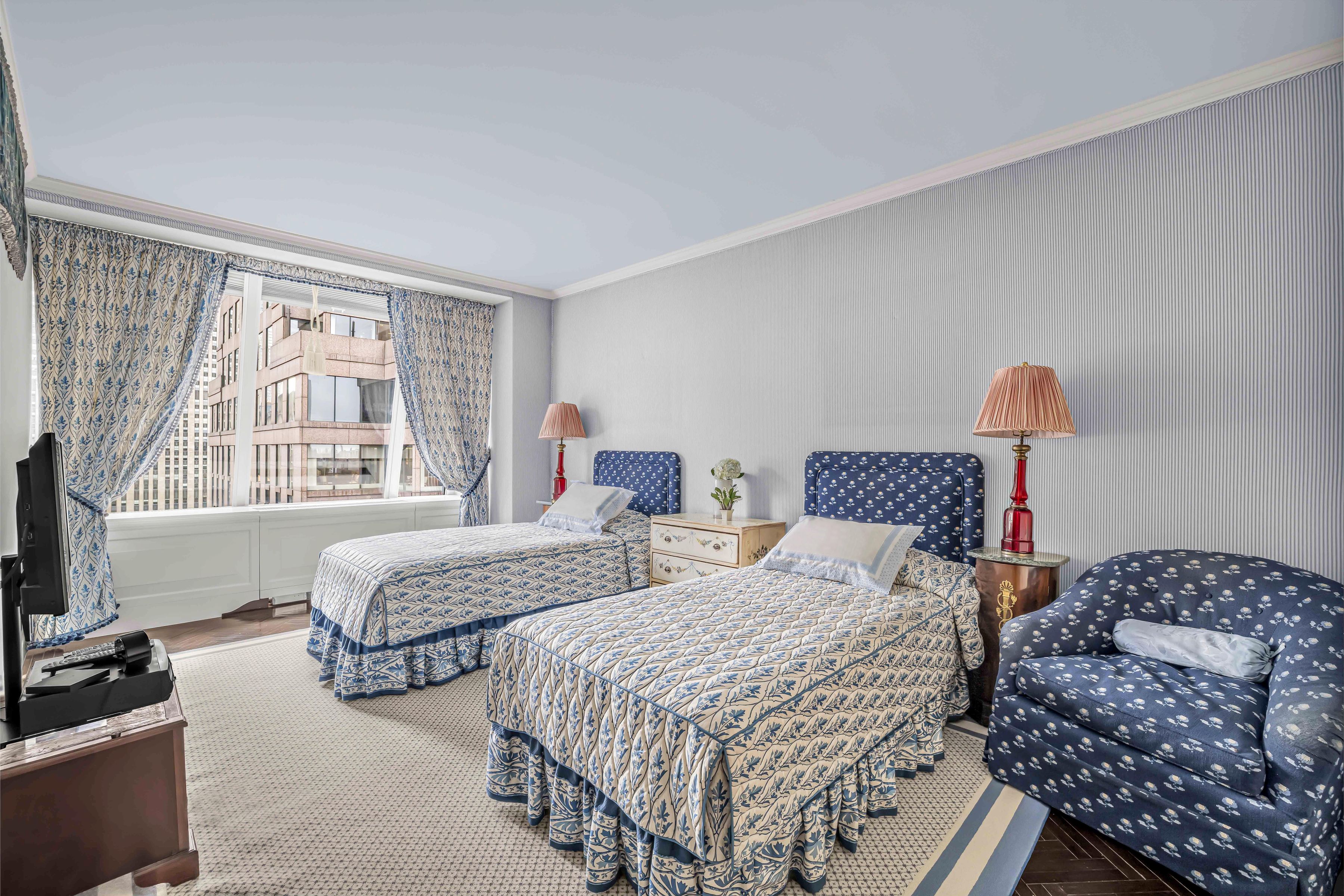 Museum Tower stands as one of Manhattan’s most distinguished luxury condominium residences, rising above the Museum of Modern Art. Apartment 30BC is a rare collector’s residence defined by cultural provenance, dramatic light and iconic views. Gallery-caliber interiors, gracious entertaining spaces, and unparalleled hotel-level services and amenities complete this extraordinary Manhattan offering. A rare opportunity to enjoy primary or pied-a-terre residence atop one of the world’s foremost art institutions. The formal entry hall is wrapped in exquisite neoclassical murals by Italian craftsmen and geometric patterned hardwood floors; a powder room, coat closet, and mirrored bar are conveniently concealed within the walls. An expansive corner living room features luminous exposures where sleek urban architecture meets the drama of open skies. In the southeast corner, floor-to-ceiling windows create a true “wow” moment, framing the architectural corridor of 53rd Street and the MoMA sculpture garden below. Custom art gallery-style fiber optic lighting installed by the renowned firm Sandra Liotus Lighting Design of Newport, RI will perfectly highlight and protect any art collection. Mirrored French doors lead to the “Gustavian” room, a library and office distinguished by arched doors, southern light, and a tranquil palette of soft blues. Outfitted with discreet storage closets and an ensuite bath, it offers a rare view of the Rockefeller Center Christmas tree in winter. Candlelit dinners, lively gatherings, and celebrations all find a natural stage in the warmth of the graciously appointed dining room. Custom overhead lighting allows the mood to be tailored to the moment. The windowed eat-in kitchen pairs chic black lacquered cabinetry with ample storage and space for morning coffee overlooking the Philip Johnson Terrace and Sculpture Gardens of MoMA. The home’s private bedroom wing holds both the primary and secondary suites which are connected through a soundproofed and handsomely outfitted back hallway with a hidden door. Each is bathed in warm southern light and features its own dressing area, generous walk-in closet, and ensuite bathroom. Museum Tower is a white-glove condominium; premium hotel-level services include a 24-hour doorman, elevator attendant, resident manager, concierge. Amenities span a state-of-the-art fitness center with pilates, sauna, steam, and meditation rooms, as well as a media, conference, and tech room. Valet and housekeeping services are available, along with private storage, temperature-controlled wine storage, and bicycle storage. Museum Tower remains a glorious reminder of the unique partnership that not only gave shape to Cesar Pelli’s modernist architectural vision but simultaneously modernized and ensured MoMA’s long-term institutional stability. A capital contribution equal to 2% of the purchase price is payable by the buyer.