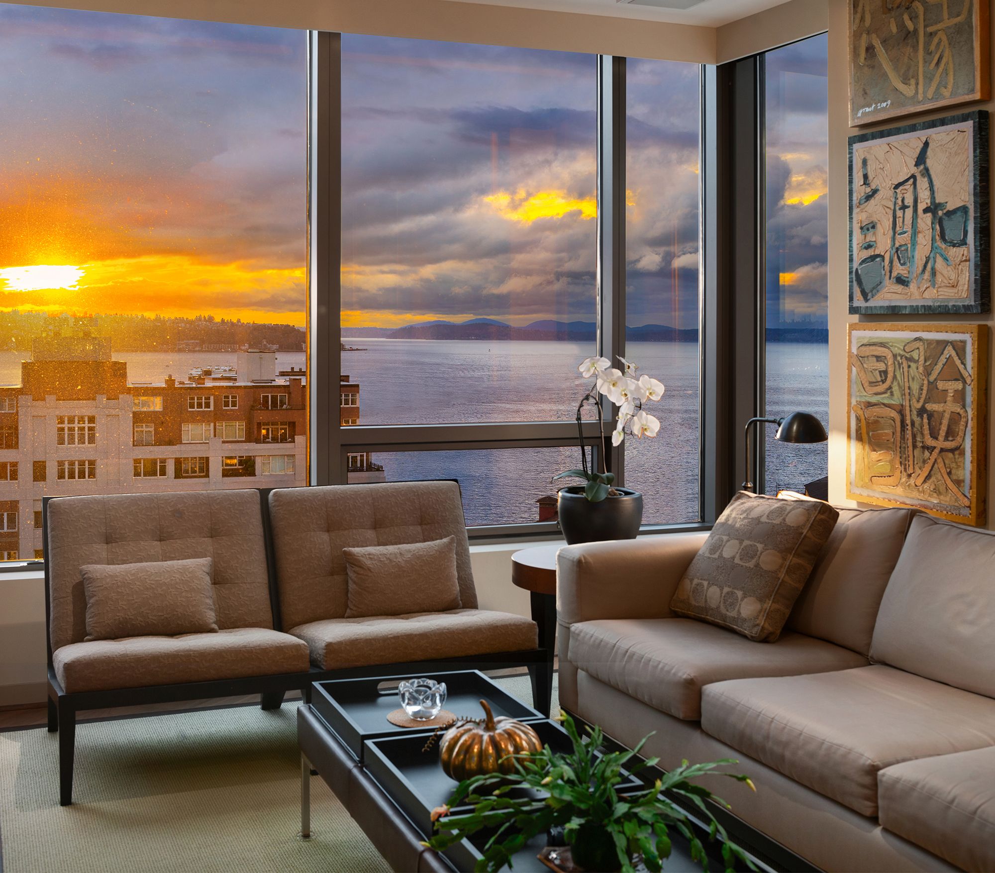 Incredible opportunity to acquire one of the most coveted and rarely available floor plans at Madison Tower/Hotel 1000. Perched high on the Northwest corner, Unit #1600 is a meticulously maintained one-owner home. This brilliant floor plan features 2 en-suite bedrooms, an office and a large, open kitchen with gas cooking, commercial-grade appliances, wine refrigerator and ample storage. It also includes a dual-sided gas fireplace, hardwoods throughout and 2 large terraces and water views from nearly every room. Hotel amenities include a gym, a residents-only rooftop terrace with a fire pit, pet relief area, 24-hour door staff and Valet, 2-car parking, a restaurant and a cozy lobby bar. Hotel 1000 is one of only two hotels in Seattle that offer private residences.
