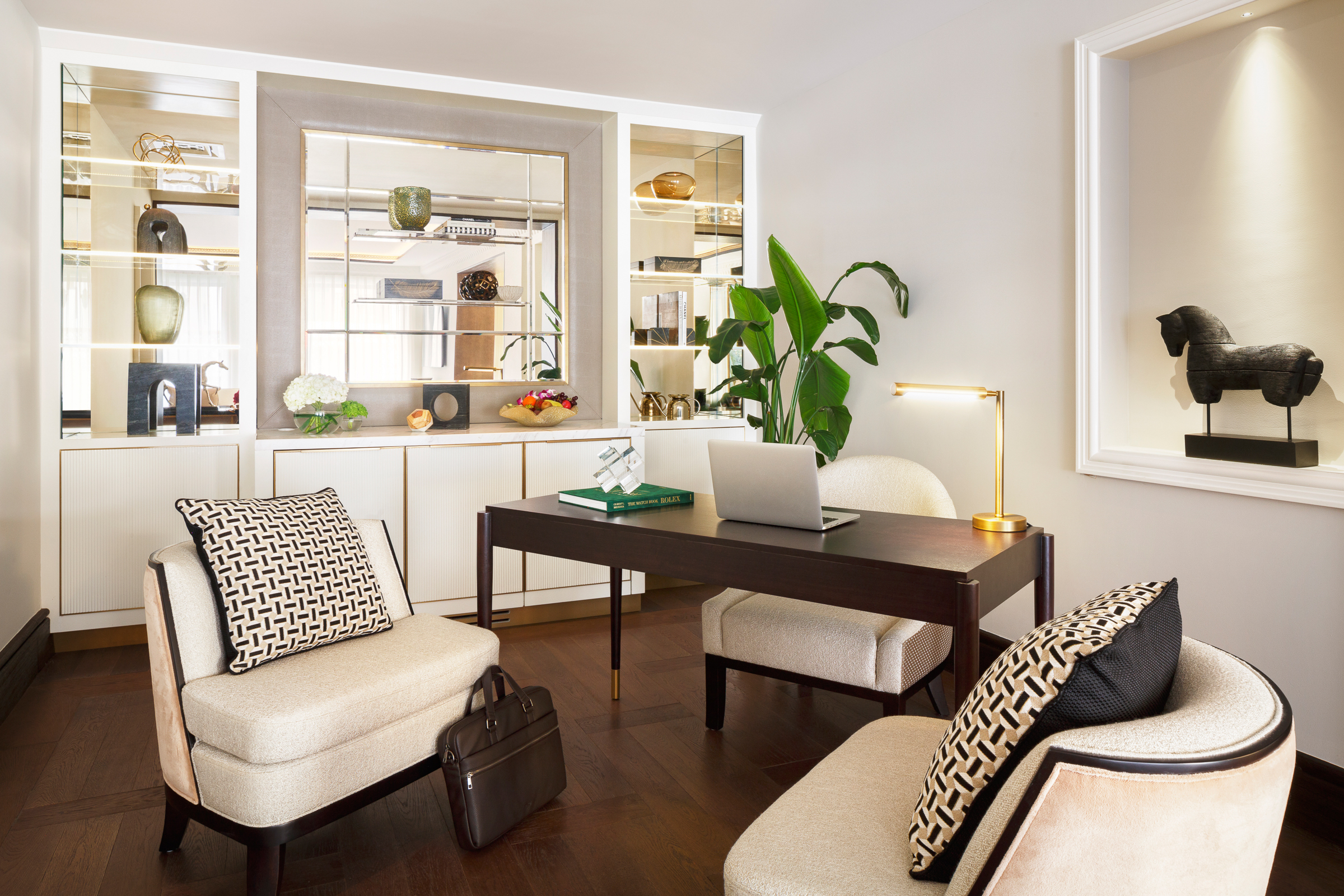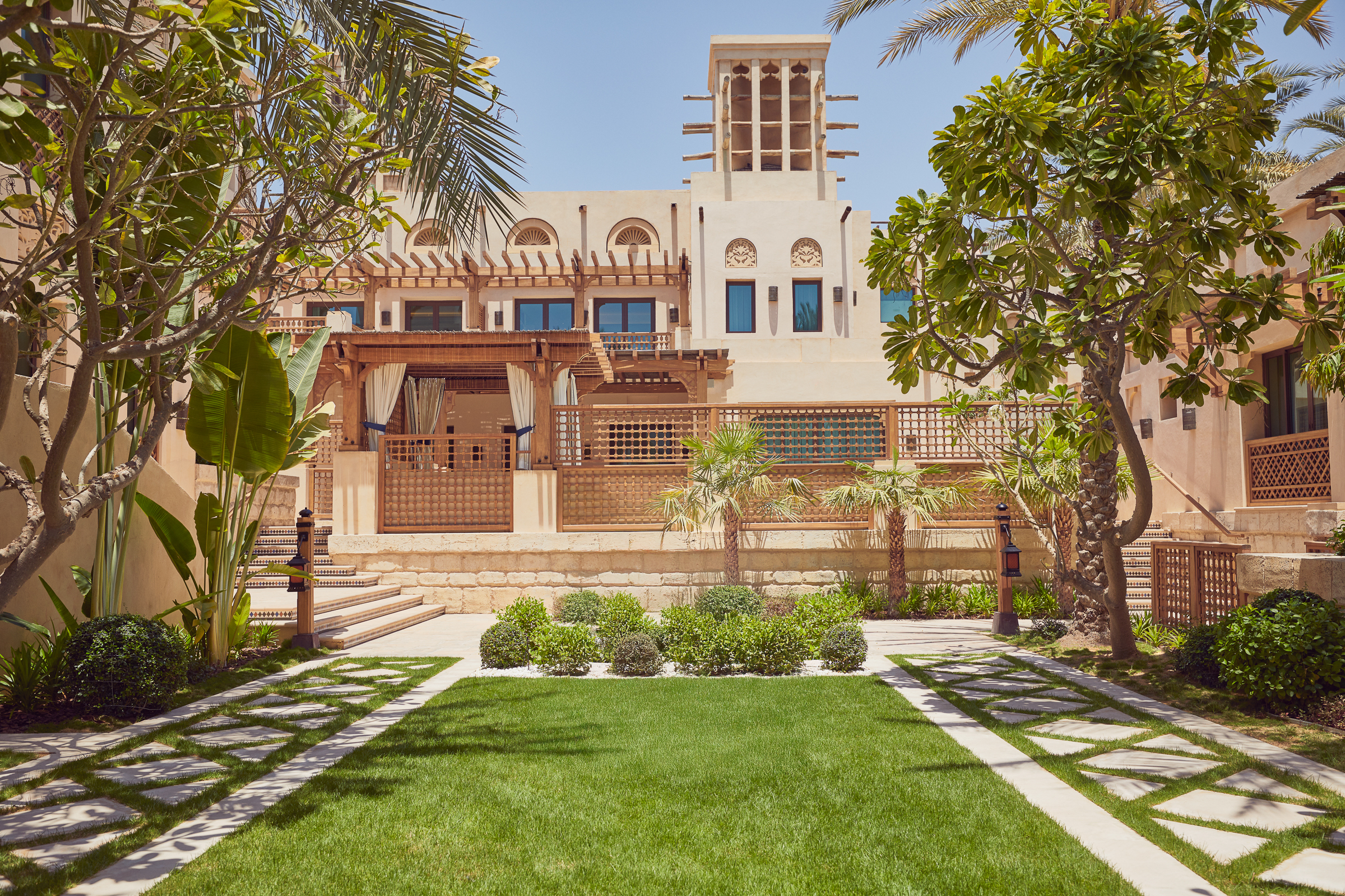 This is reflected in the villa’s design, which has architectural elements that draw inspiration from wind towers and traditional wooden screens. Inside, contemporary interiors create a striking balance of high-end furnishings, sumptuous fabrics, and natural tones.