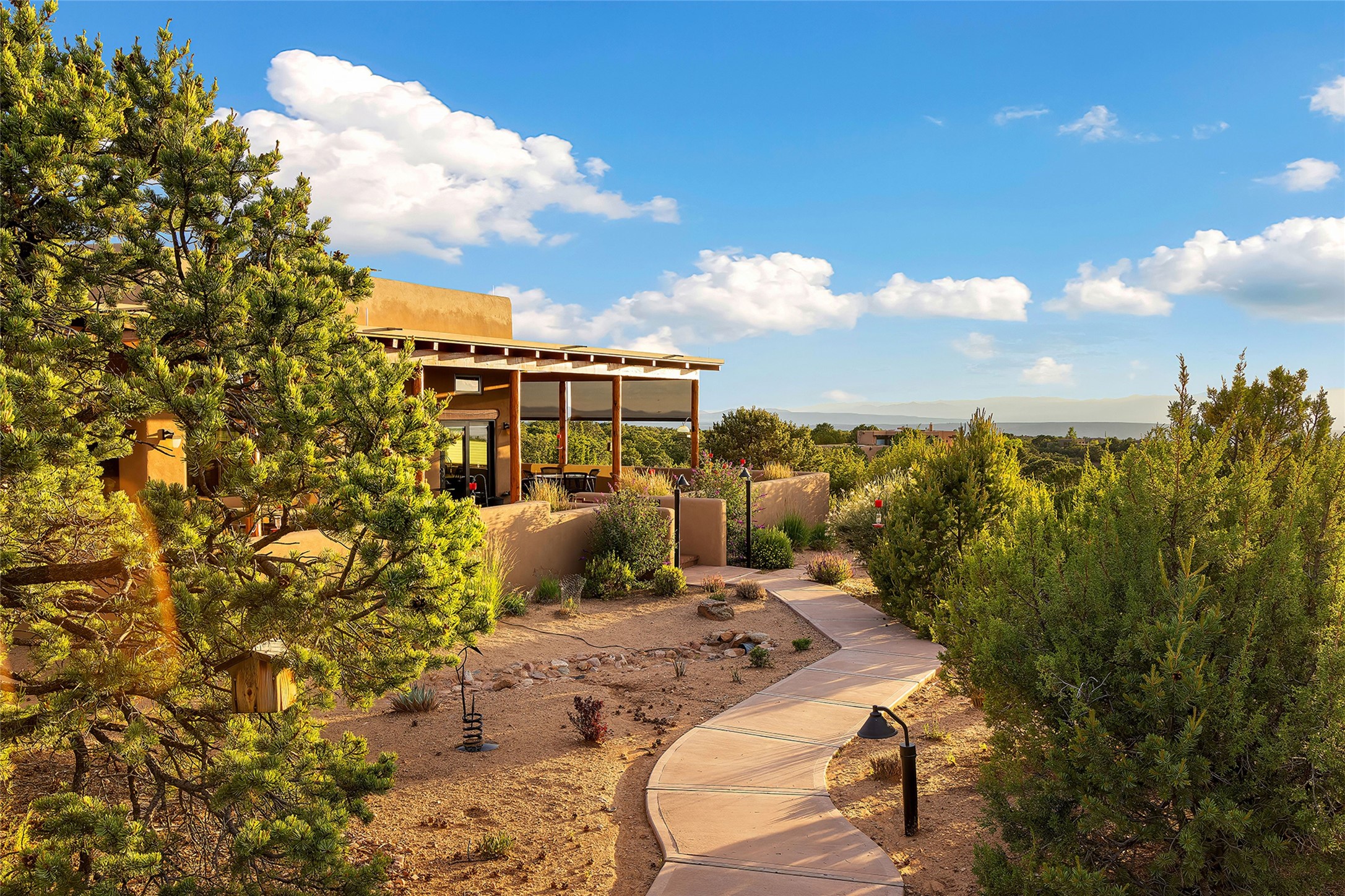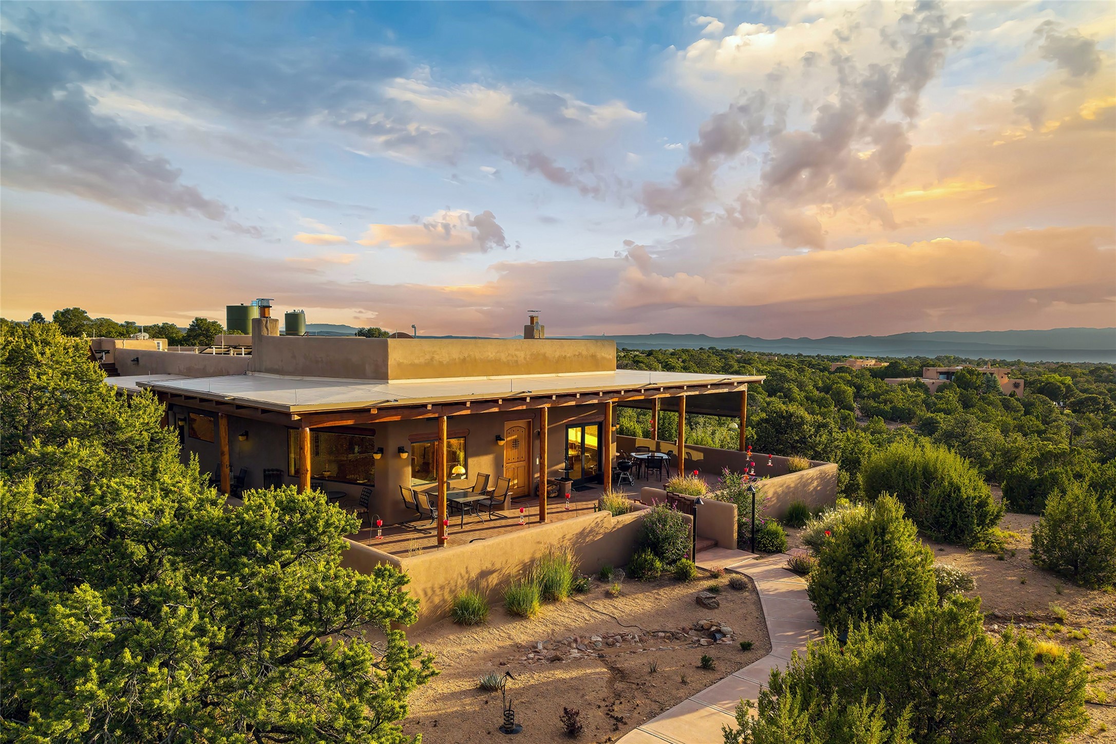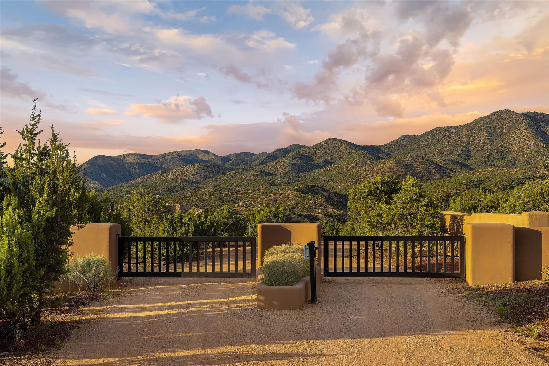 Meticulously designed by its current owners and custom built in 2014 by Tierra Concepts, this exceptional single-level Santa Fe-style residence is perched high (7,200 ft) on a mesa above Tesuque Village in the small gated development of Tesuque Villas. Set on 3.5 secluded acres of beautifully landscaped environs, this all-electric home (partially solar powered) affords panoramic vistas in every direction – from Santa Fe Baldy and the Sangres to the east, to the entire Jemez range across the Rio Grande Valley to the west, with breathtaking sunsets year-around. The front entrance opens into a spacious living and dining “great room,” with corner kiva fireplace and large picture windows to reveal the sweeping views. This majestic space (with conjoining kitchen and pantry) features high viga-latilla ceilings and solid hickory flooring – handsome design elements that recur throughout the home. This space links seamlessly with a wrap-around portal and walled garden – ideal for gatherings large and small, as well as outdoor dining and relaxation. A central galleried corridor fosters engaging passage through the home, past the primary bedroom suite (with luxury bathroom) and two other bedrooms to a private guest suite. These four bedrooms and their three bathrooms are well-suited to multiple purposes. The guest suite bedroom can be a music or other activity room; and another bedroom, with built-in shelving, makes an excellent office. All have stunning Sangre or Jemez vistas, as do a boardwalk, enclosed porch, and roof deck. This gem, in one of Santa Fe’s most coveted settings, blends tranquility, craftsmanship and breathtaking views. Wonderfully secluded from tourists and traffic, it still is only minutes from the Four Seasons Resort and Tesuque Village Market, and not many more to town’s edge.