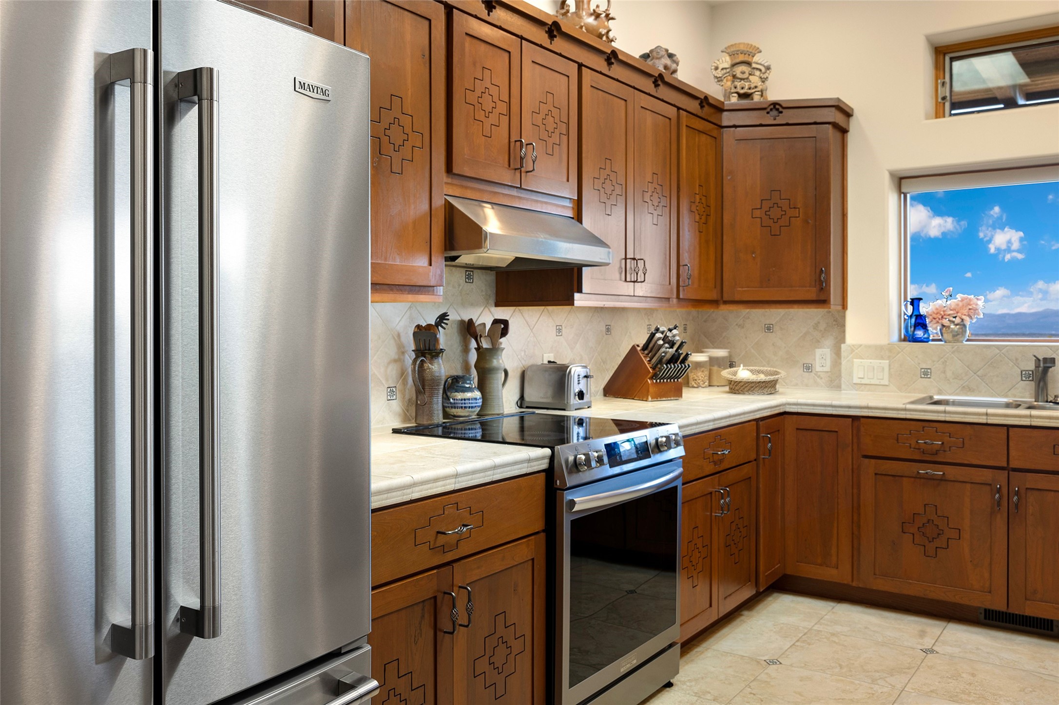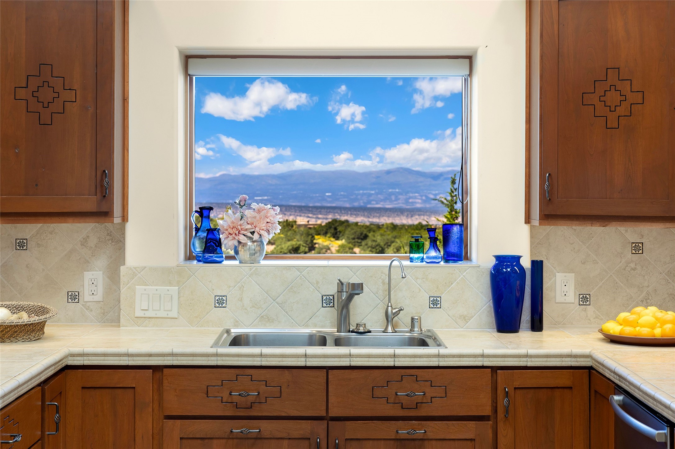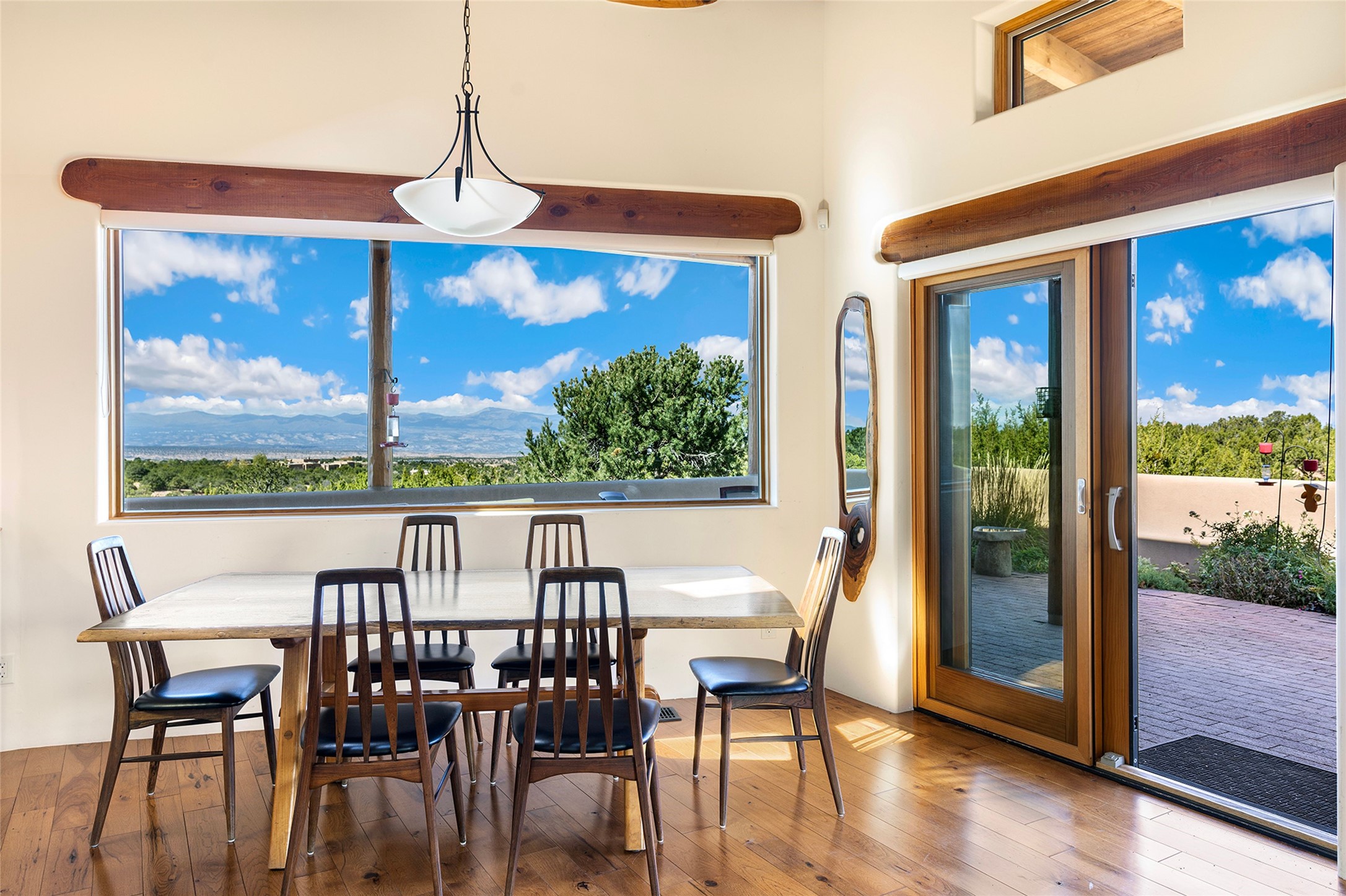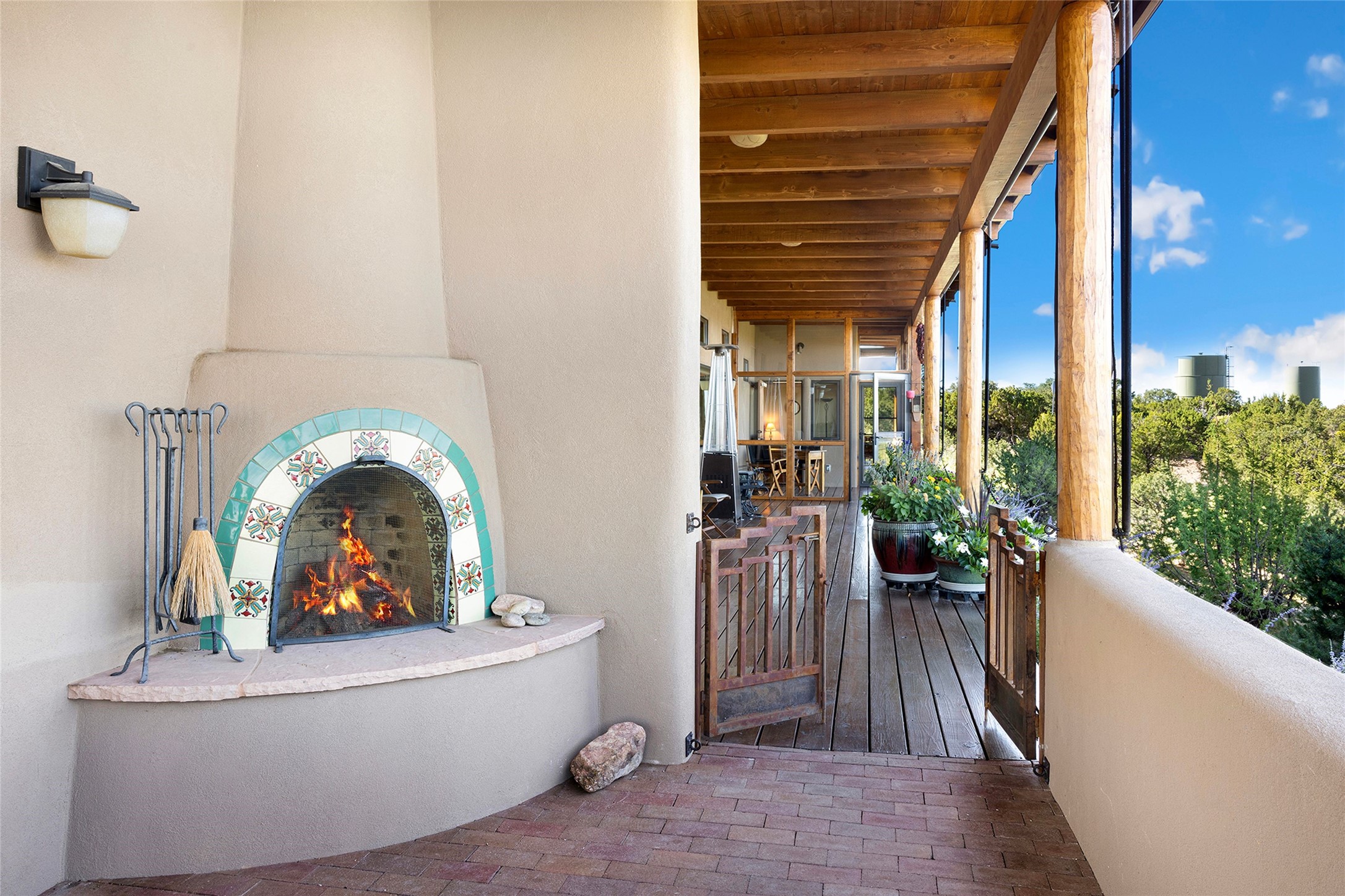 Meticulously designed by its current owners and custom built in 2014 by Tierra Concepts, this exceptional single-level Santa Fe-style residence is perched high (7,200 ft) on a mesa above Tesuque Village in the small gated development of Tesuque Villas. Set on 3.5 secluded acres of beautifully landscaped environs, this all-electric home (partially solar powered) affords panoramic vistas in every direction – from Santa Fe Baldy and the Sangres to the east, to the entire Jemez range across the Rio Grande Valley to the west, with breathtaking sunsets year-around. The front entrance opens into a spacious living and dining “great room,” with corner kiva fireplace and large picture windows to reveal the sweeping views. This majestic space (with conjoining kitchen and pantry) features high viga-latilla ceilings and solid hickory flooring – handsome design elements that recur throughout the home. This space links seamlessly with a wrap-around portal and walled garden – ideal for gatherings large and small, as well as outdoor dining and relaxation. A central galleried corridor fosters engaging passage through the home, past the primary bedroom suite (with luxury bathroom) and two other bedrooms to a private guest suite. These four bedrooms and their three bathrooms are well-suited to multiple purposes. The guest suite bedroom can be a music or other activity room; and another bedroom, with built-in shelving, makes an excellent office. All have stunning Sangre or Jemez vistas, as do a boardwalk, enclosed porch, and roof deck. This gem, in one of Santa Fe’s most coveted settings, blends tranquility, craftsmanship and breathtaking views. Wonderfully secluded from tourists and traffic, it still is only minutes from the Four Seasons Resort and Tesuque Village Market, and not many more to town’s edge.