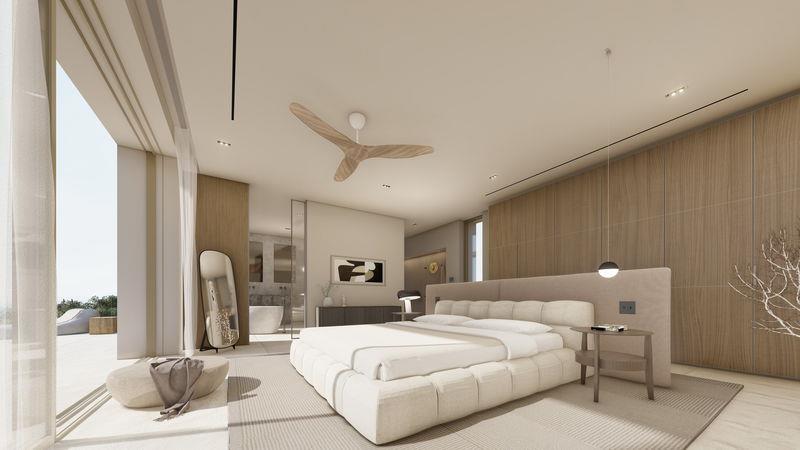 The upper level hosts a magnificent master suite with a private bathroom, along with two additional en-suite bedrooms, each with private balconies offering spectacular sea views. The lower level of the villa includes two more en-suite bedrooms, a TV and playroom, a gym with a sauna, a laundry room, and ample storage space.