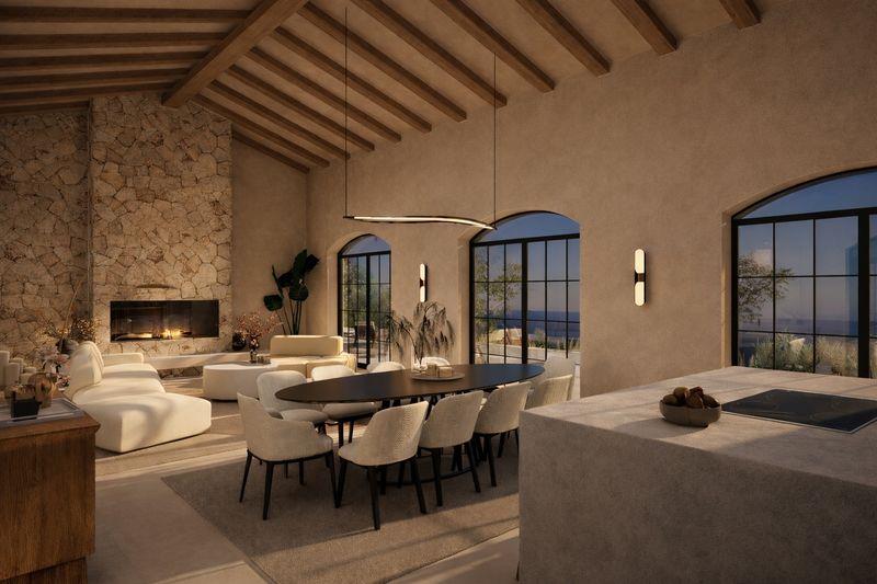 The total built area of 368 sq.m. comprises both the main villa, arranged across a basement and ground floor, and a distinctive cave-style guest house with its own independent entrance. The residence has been thoughtfully designed to blend contemporary elegance with Mediterranean character, placing strong emphasis on natural light, comfort, and seamless indoor–outdoor living. The interior layout features spacious and well-proportioned living areas, including a generous open-plan living and dining space that connects effortlessly to the outdoor terraces, allowing the stunning sea views to become an integral part of everyday living. The kitchen is planned as a modern and functional space, perfectly suited for both daily use and entertaining.