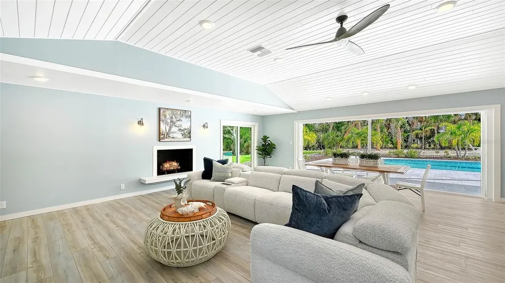 One or more photo(s) has been virtually staged. Location, Privacy, Location, Value, Location. Welcome to the BEST non-Gulf front setting in Sanderling on Siesta Key. This fully updated home sits on a ¾-acre lot with an adjacent co-owned ¾-acre lot, giving you the benefit and privacy of over 1.5 acres on a private island in the middle of Sanderling. It is grandfathered to remain as a one-level home with no steps, allowing you to enjoy it indefinitely as your dream home or design and build a future residence on Plover. Set within the gates of the exclusive Sanderling Club on Siesta Key, this exceptional 3-bedroom, 3.5-bath residence presents a rare opportunity to own in one of the island's most private and storied coastal communities. The Sanderling is a member-owned Gulf-to-Bay enclave celebrated for its low-density design, lush tropical landscape, iconic banyan canopy, and unparalleled access to Siesta Key's world-famous quartz sand beach. Residents enjoy boat slips for lease, both clay and hard tennis courts, pickleball courts, clubhouse amenities, and guard-gated security. Beautifully positioned among mature tropical landscaping, the home blends timeless charm with high-quality upgrades and thoughtful improvements. Impact-rated windows and doors provide security, energy efficiency, and peace of mind. A brand-new roof was installed in 2025, and the home is insulated throughout with Isonene foam insulation for excellent climate control and quieter interiors. Inside, the home is warm, bright, and designed for relaxed coastal living. The main living spaces feature abundant natural light and tranquil garden views through large windows and sliders that connect seamlessly to the surrounding greenery. A rare feature for Siesta Key, the living room includes a fully functioning wood-burning fireplace, creating a cozy focal point for cooler winter evenings. The open living and dining areas offer flexible space for entertaining or everyday comfort, while the kitchen provides generous workspace, ample cabinetry, and excellent flow to the surrounding rooms. In addition to the three bedrooms, the home includes a comfortable office ideal for remote work or quiet reading, along with a large walk-in pantry providing exceptional storage and organization. The primary suite is privately situated and offers peaceful views, generous closet space, and an en-suite bath designed for comfort and functionality. Two additional guest suites, each with their own private bathrooms, provide excellent accommodations for family and visitors, while a convenient half bath serves the main living areas. Outdoor living is one of the home's greatest attributes. Surrounded by mature landscaping and the Sanderling's natural canopy, the grounds feel serene and secluded. A beautifully installed turf lawn creates a low-maintenance outdoor space ideal for pets, play, or lounging, while a dedicated fire pit area offers the perfect place to gather in the evenings and enjoy the soft Gulf breezes. As a resident of the Sanderling Club, you'll enjoy access to a members-only beachfront, clubhouse amenities, tennis and pickleball courts, and boat access. The Sanderling Clubhouse renovation has been approved and is underway, further enhancing the community's already exceptional amenities. This bright and inviting island home is truly a must see, offering an extraordinary combination of privacy, setting, and lifestyle in one of Siesta Key's most cherished communities.