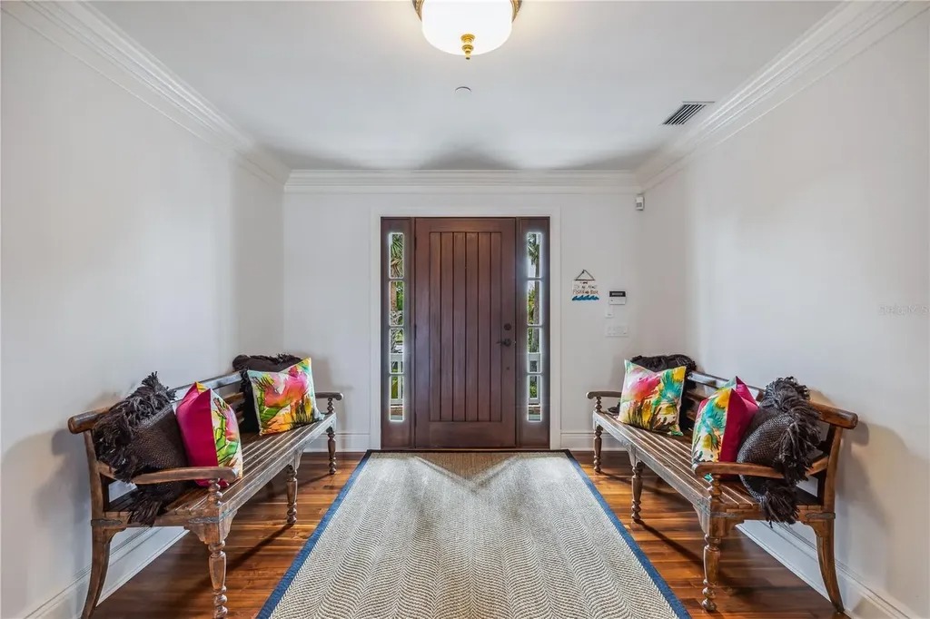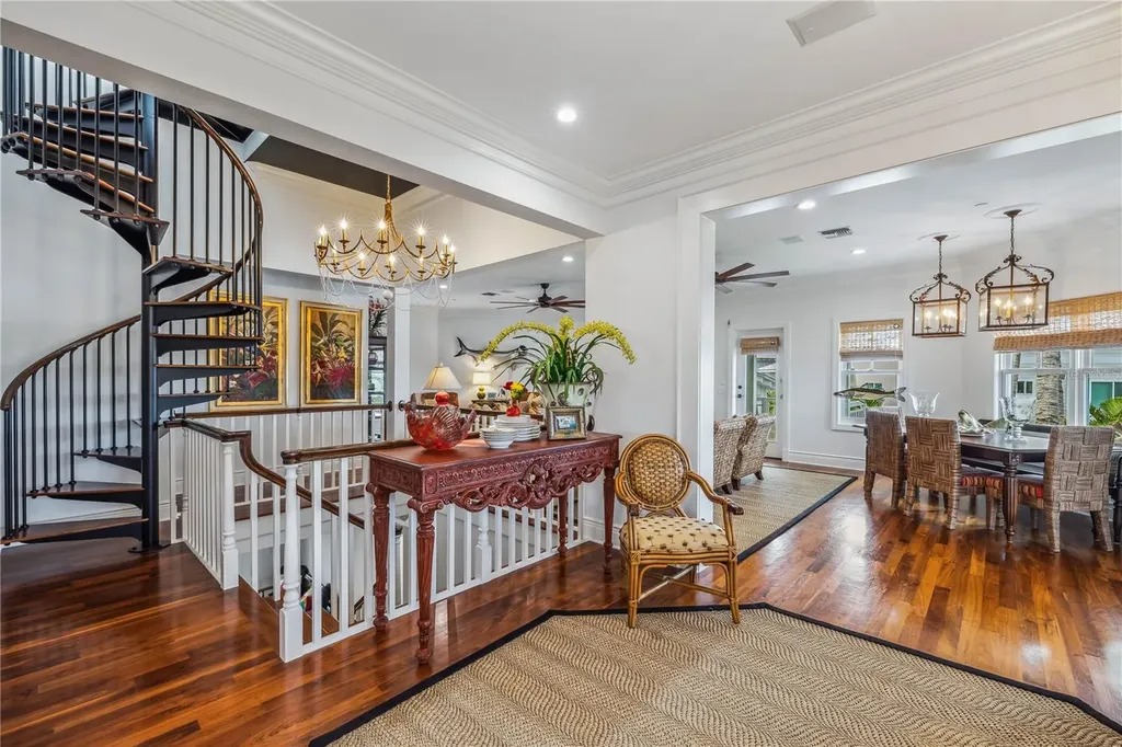 Experience exceptional waterfront living in this Coral Creek Anglers Club residence by Safety Harbor Builders, offering 3,886 sq ft with 4 bedrooms and 4.5 baths. The entry level features a spacious family/media room, two guest suites with en-suite baths, and a charming bunk cubby, plus expanded private guest accommodations above the garage.The main living level includes elegant living and dining areas, a recently updated kitchen, and a luxurious primary suite. Custom details throughout include granite and quartzite countertops, wood floors, crown moldings, and beadboard accents.Waterside decks and porches on every level provide stunning views and sunset enjoyment, while the top-floor office offers panoramic water vistas. Outdoors, a deepwater dock with 16,000 lb. and 8,000 lb. boat lifts delivers outstanding boating access. Located in a gated community with pool and clubhouse, and close to bike trails, fishing, and nearby islands. Sold tastefully furnished and move-in ready.