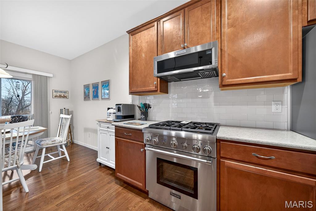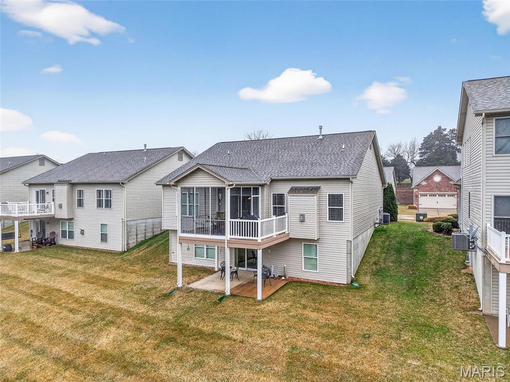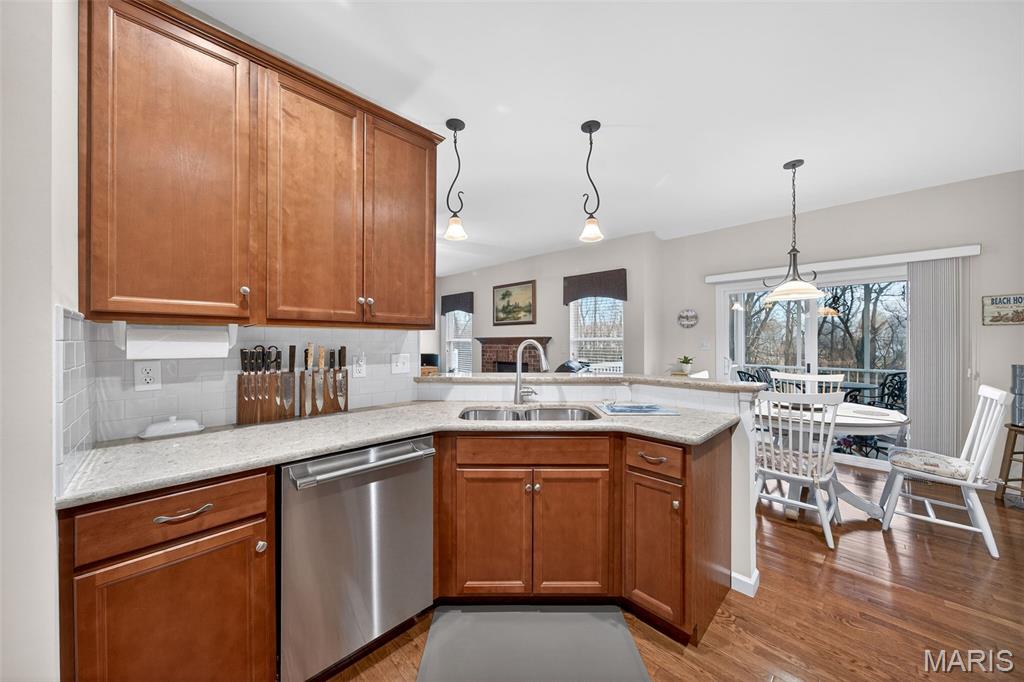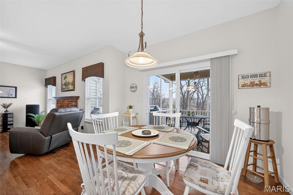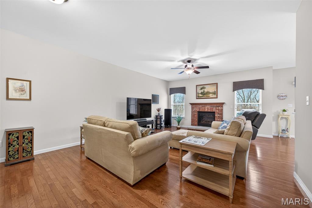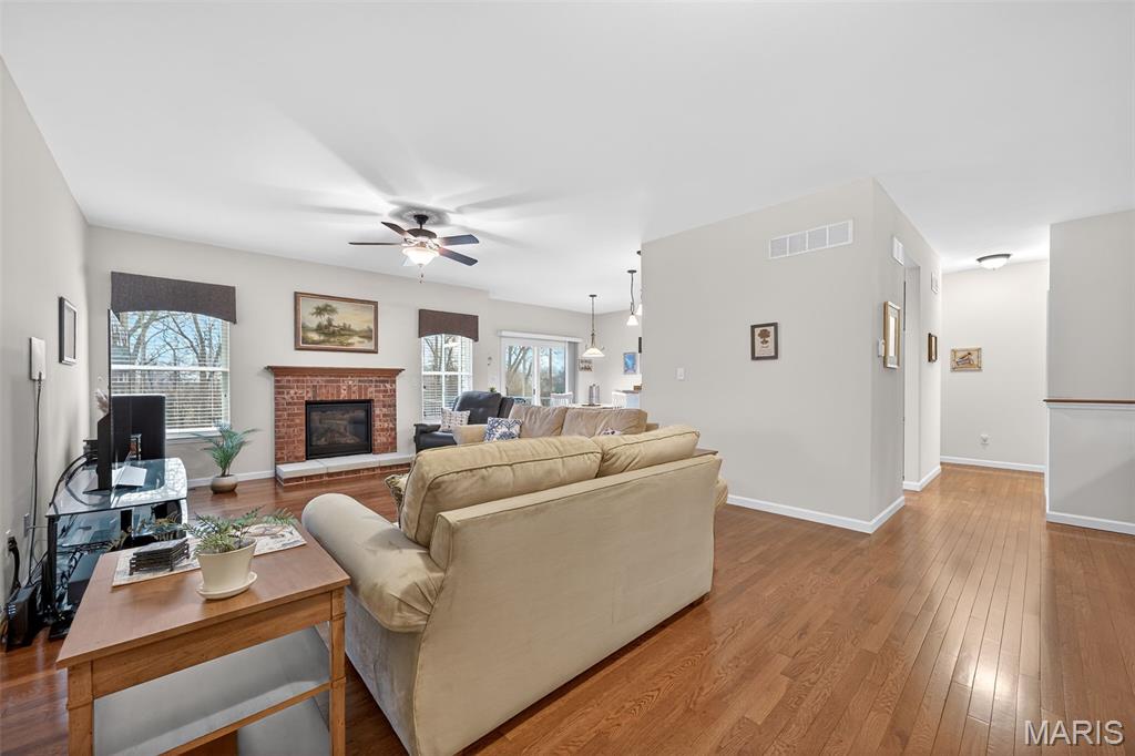 Impeccably maintained, free standing villa in the sought-after St. Andrews neighborhood! This stunning home is immaculate, backs to trees and common ground, has a screened in composite deck, a finished lower level, an oversized 2 car garage and sits on a quiet cul de sac street. The exterior is impressive with a full brick front, stone accents, bay window, carriage style garage doors, address stone, coach lights, architectural shingles, prof landscape and a lawn irrig system. Features include 3 BD, 3 BA, 2,624 sq ft of finished living space (inc the finished lower level), an oversized garage (22.6D), 9 ft ceilings, Great Room, Dining area, gas FP with brick surround, wood flooring, SS appliances, Thermador gas stove and dishwasher, KitchenAid micro, refrigerator, washer, dryer, raised breakfast bar, quartz countertops, 42 inch cabinets with crown, tile backsplash, recessed lighting, breakfast room, main floor laundry, spacious Primary Bedroom, walk in closet, raised height bath vanity, bay window in the secondary bedroom and more. The finished lower level has a walkout, large Family/Rec Room, full bathroom, bedroom with an egress window, two walk in closets and walks out to a large patio. There is a screened in composite deck off the Breakfast Room and an open deck for grilling. A monthly fee takes care of snow removal, lawn care, some exterior maint and more (per C&Rs). There is easy access to Hwys 70, 370 and 364, Lambert Int airport, restaurants and shopping. Enjoy miles of neighborhood walking trails, an incredible lot and an amazing home!