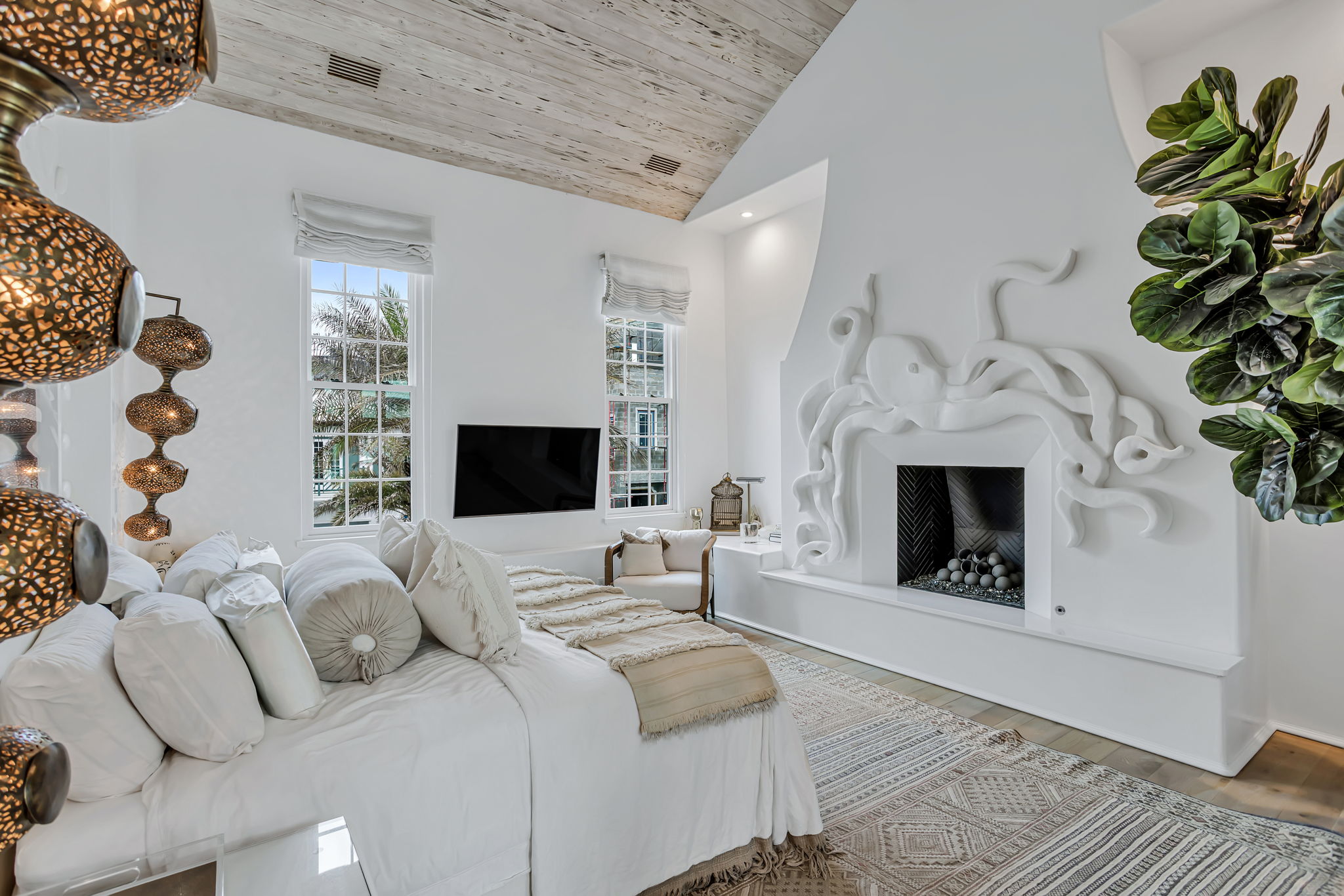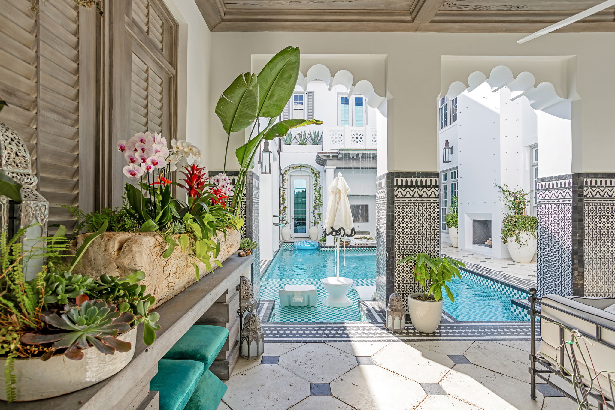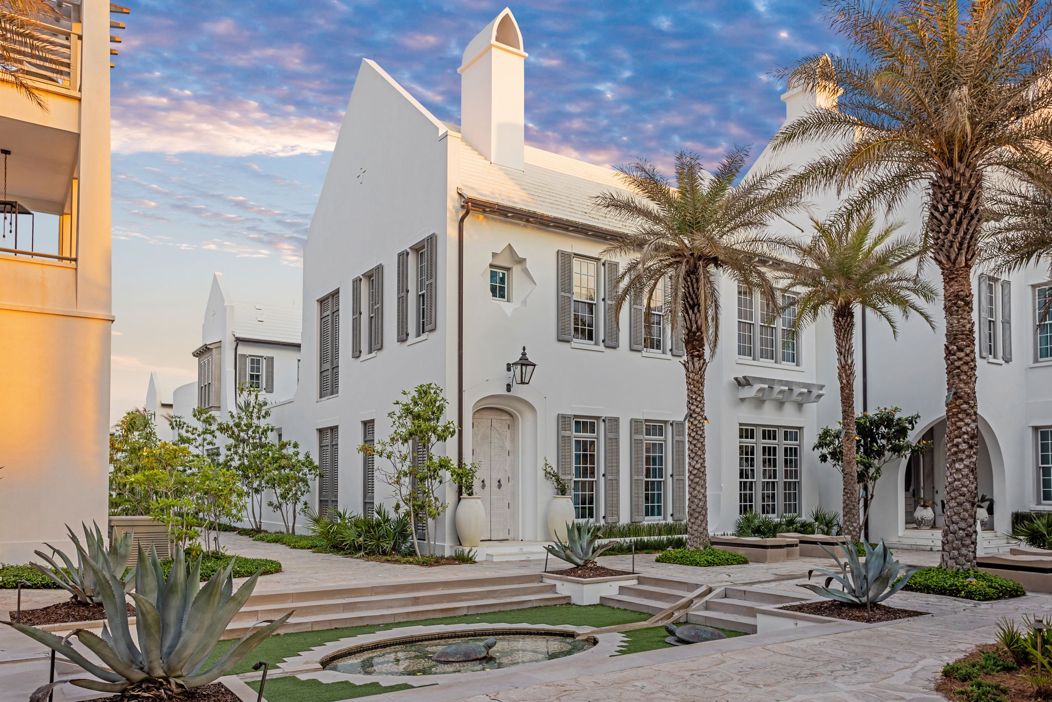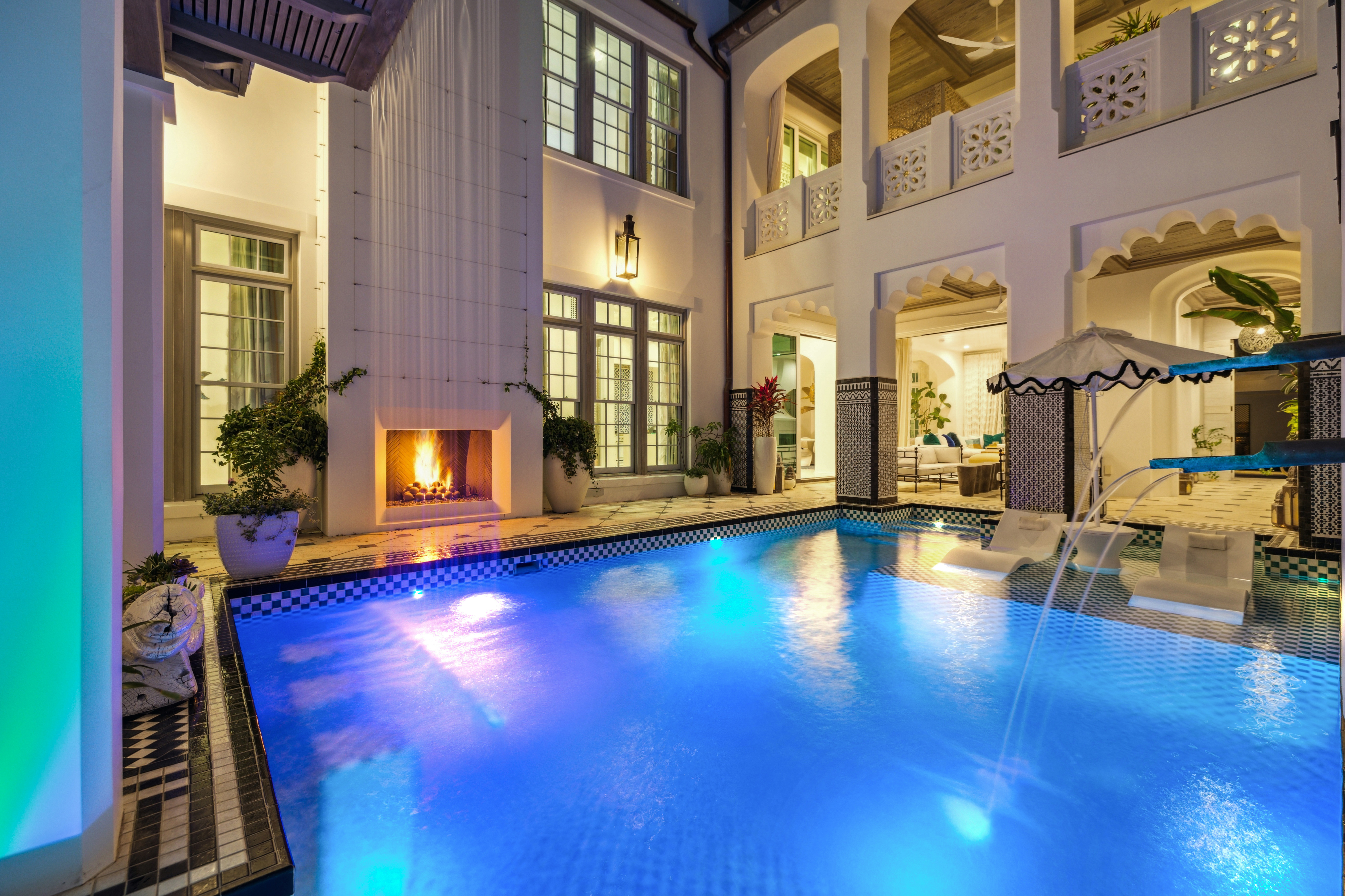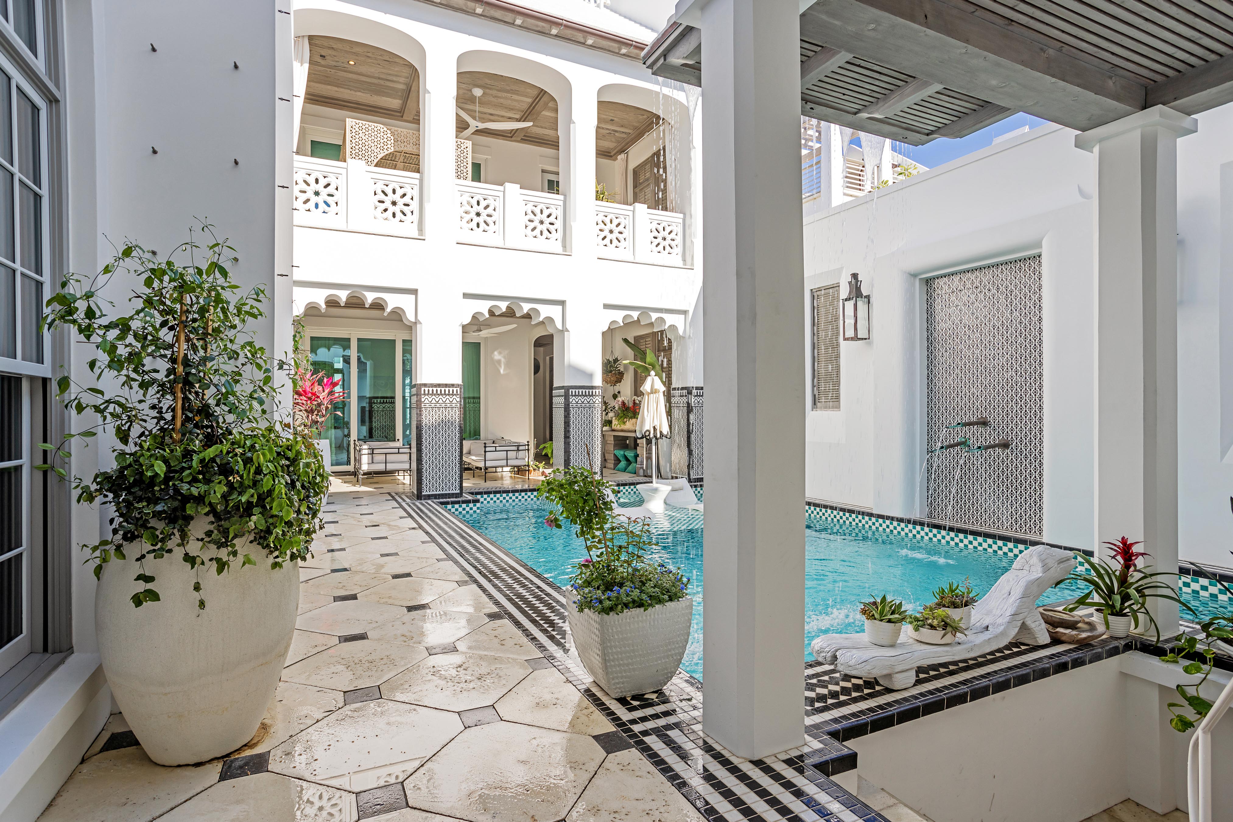 This exceptional residence offers the ultimate entertainer’s dream, blending luxurious design with resort-style amenities to create an unparalleled living experience. Every detail has been carefully curated, drawing inspiration from global influences to create a home that feels both immersive and unforgettable. At the heart of the home, a showstopping kitchen features custom wood cabinetry, a striking blue-and-white tile backsplash, and high-end appliances, setting the stage for culinary creativity. The expansive island, paired with plush, sculptural seating, seamlessly connects the living and dining areas, making it the perfect space for entertaining.The outdoor living spaces are truly one-of-a-kind, featuring two pristine pools and hot tubs that offer endless opportunities for relaxation and entertainment. The central courtyard pool, framed by intricate tilework and elegant archways, includes an integrated bar and grilling area, creating a private oasis perfect for unwinding. Just steps away, a charming casita provides a secluded retreat for guests, complete with a full bath and bedroom. This private sanctuary allows visitors to enjoy their own luxury while staying close to the main home's vibrant spaces.Designed for effortless indoor-outdoor living, expansive doors open wide to reveal a beautifully integrated outdoor area. Guests can flow seamlessly between the indoor lounge and poolside, creating the ideal setting for sophisticated gatherings. The rooftop features a second heated pool, flanked by a fire pit seating area, an outdoor bar, and a grilling station, an elevated escape with breathtaking views of Alys Beach.The owner’s suite is a true masterpiece, featuring custom murals that bring artistry and luxury to the space. These hand-painted details transform the suite into a serene, tranquil retreat. The spa-like bathroom, with gold-accented fixtures and a sculptural soaking tub, enhances the sense of indulgence, while intimate corridors adorned with intricate lanterns elevate the home’s elegance. Off the oversized balcony, a private office offers a quiet retreat with sweeping views of the courtyard, perfect for focused work or peaceful moments. Two additional bedrooms and full baths are located on the second floor, one of which features a Juliet balcony overlooking the courtyard.Effortless luxury continues with an elevator providing easy access to all three floors, offering ultimate convenience. Thoughtfully designed with ample storage, this residence strikes the perfect balance between elegance and practicality, keeping everything organized without sacrificing style.Ideal for those who love to entertain and embrace an elevated lifestyle, this residence is a rare gem, masterfully blending sophistication, comfort, and resort-style indulgence. Dedicated parking for two cars is provided in a rear parking court. Ideally located near Palmera Park, Caliza Pool, and Gulf Green beach access, a short stroll brings you to the owners' Beach Club, offering everything you need to enjoy the stunning white sandy beach.