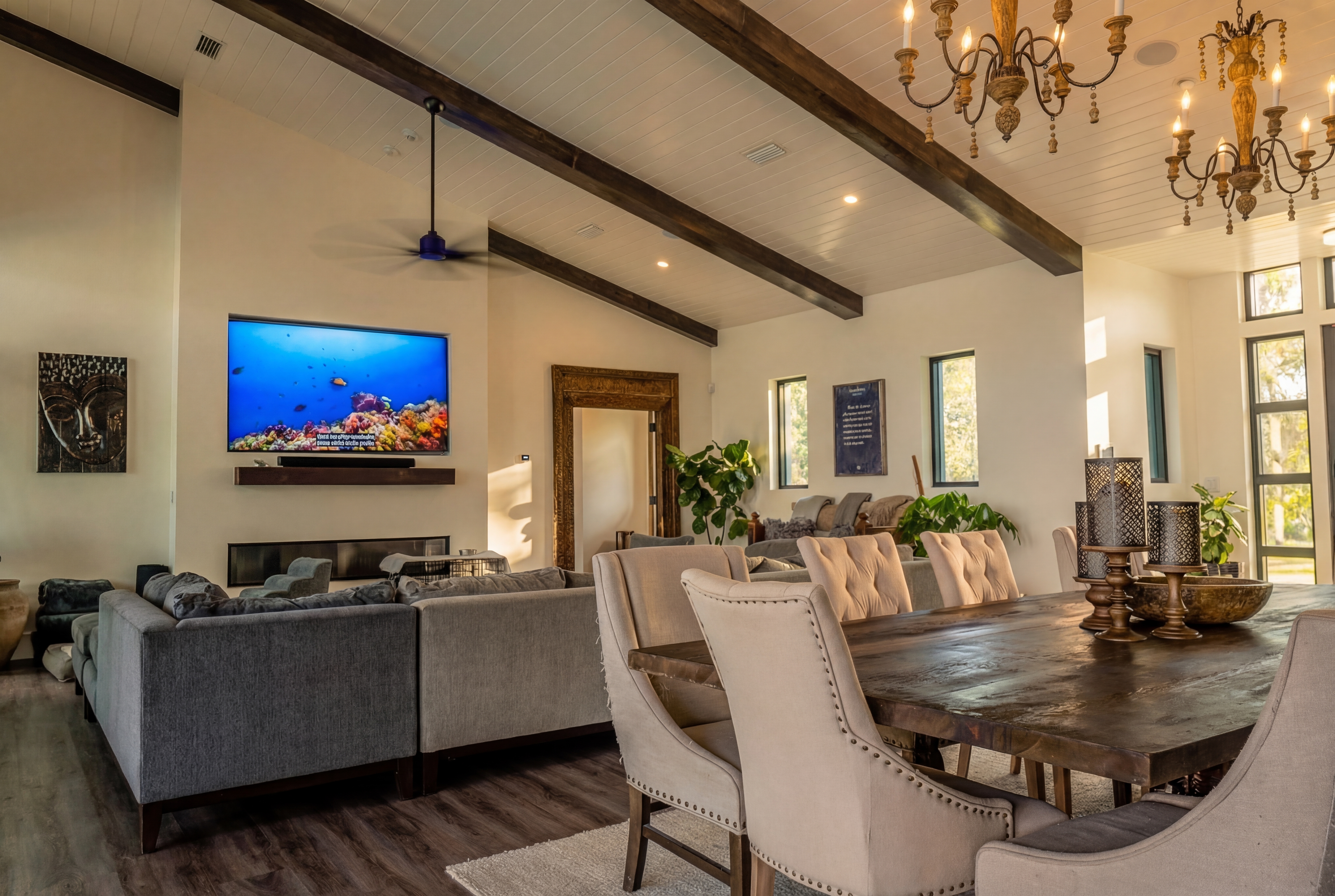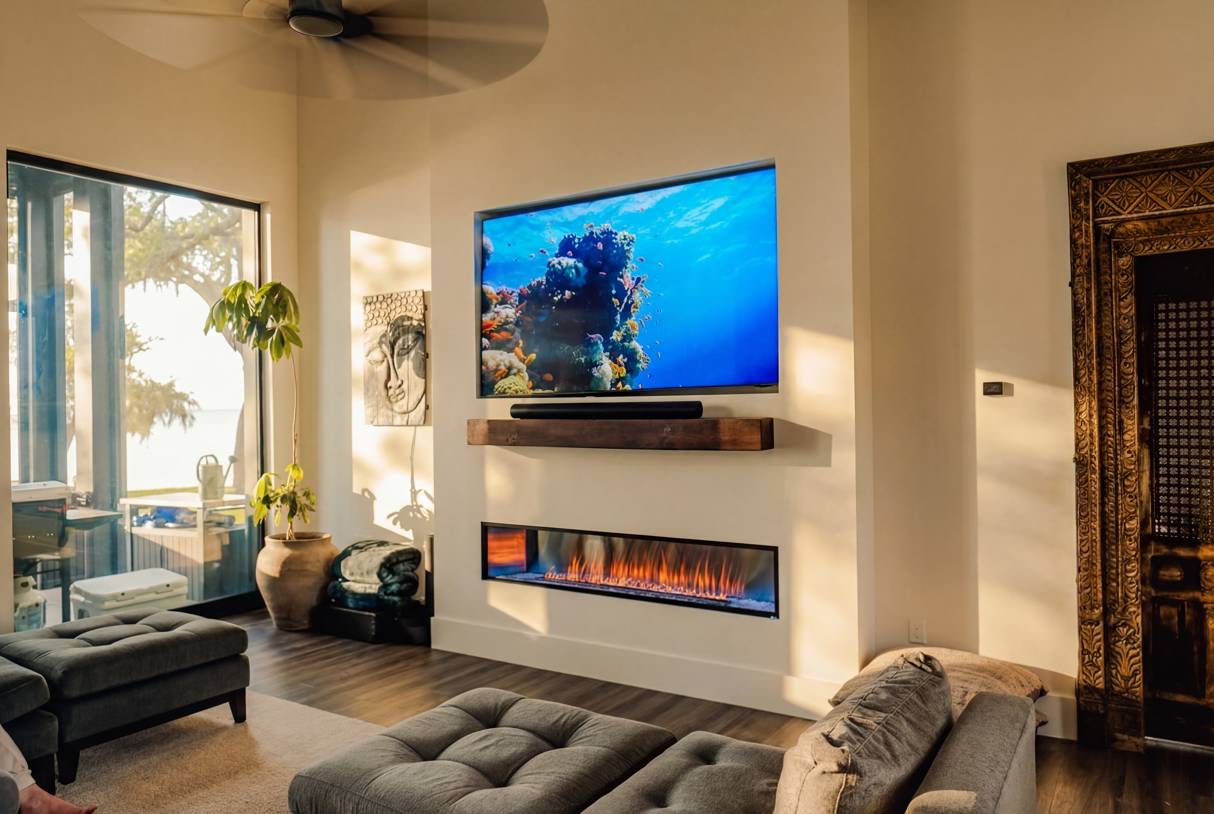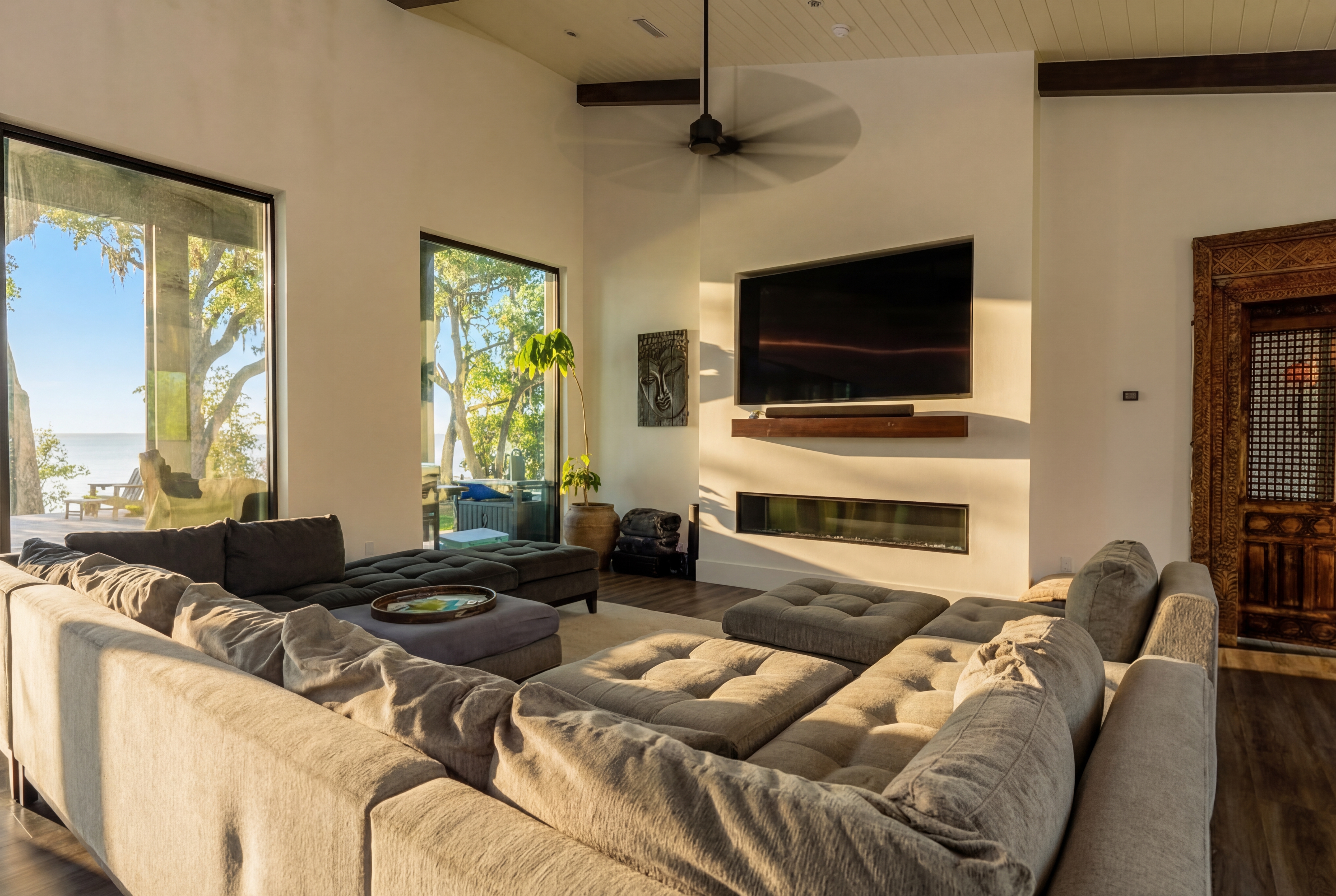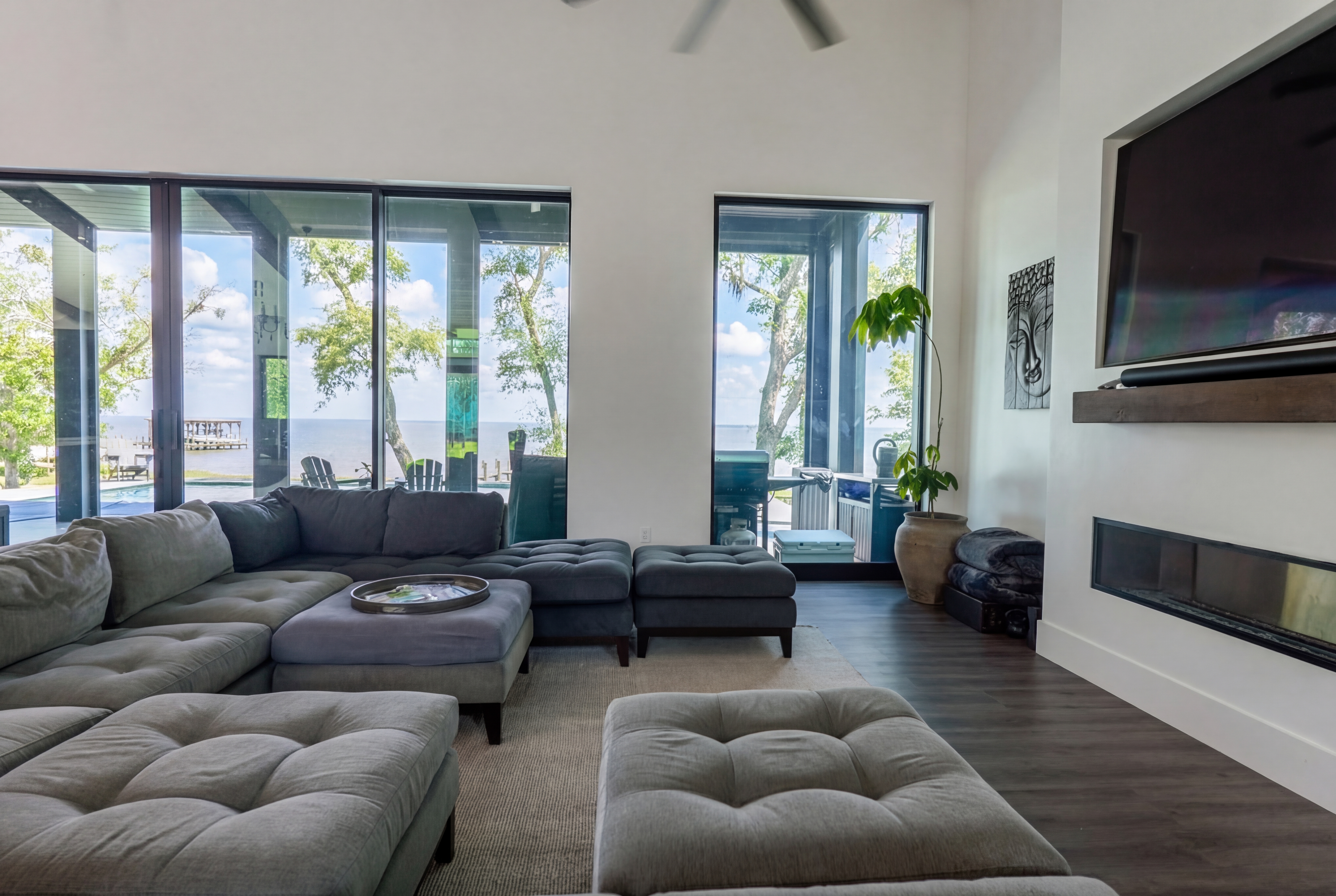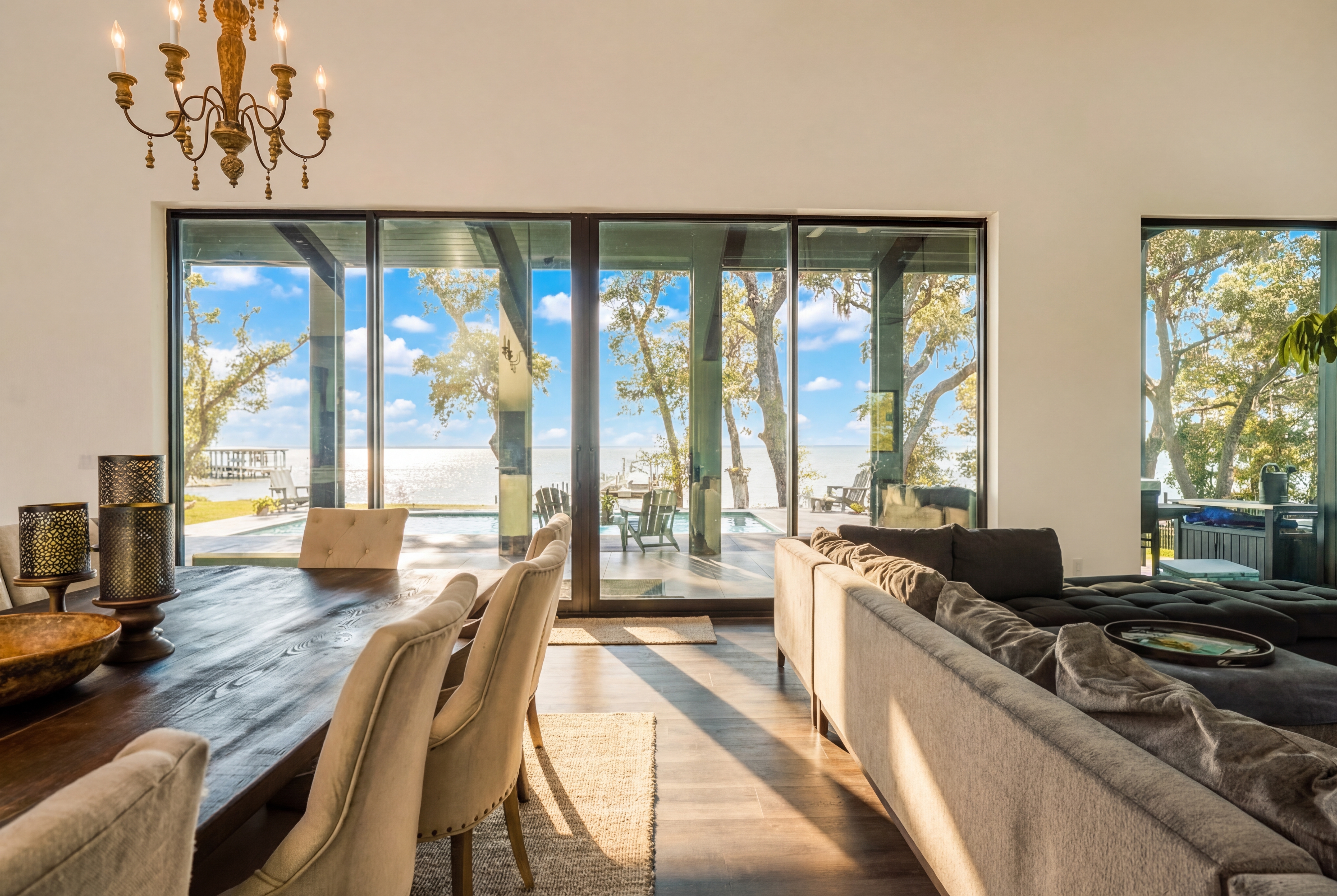 Set on two extraordinary acres and conveying with the adjacent two acre parcel, this four acre estate home and homesite offers discretion and privacy for your family. Set directly on the bay, this luxuriously built fortress-style residence offers a rare opportunity to own four contiguous acres of exceptional waterfront living. Constructed with enduring materials and a commanding architectural presence, the home was designed not simply for beauty, but for permanence, privacy, and strength. The residence features two spacious bedrooms and two and one-half baths, yet lives far larger than its bedroom count suggests.Expansive living areas with soaring ceilings and walls of glass frame sweeping bay views, filling the interiors with natural light and an ever-changing waterfront backdrop. The primary suite feels like a private retreat, offering generous proportions and tranquil water vistas, while the guest accommodations provide comfort and refinement worthy of a luxury resort. Every finish has been thoughtfully selected, blending craftsmanship, scale, and timeless coastal elegance.Outdoor living is equally compelling. A stunning waterfront pool overlooks the bay, creating a seamless connection between home and horizon. The private dock extends confidently into the water, ready for boating, paddleboarding, fishing, or sunset cruises. The grounds are expansive and beautifully positioned, offering remarkable privacy and flexibility rarely found on bayfront property.The additional two-acre parcel significantly enhances the value and versatility of the estate. Whether preserved as a privacy buffer, held for future expansion, or developed into a guest residence or additional structure, this rare offering provides options that are nearly impossible to replicate along the bay.This is more than a home; it is a waterfront compound built for generations. With substantial acreage, commanding construction, a private pool and dock, and endless panoramic views, this property delivers a level of space, strength, and serenity that defines exceptional bay living.