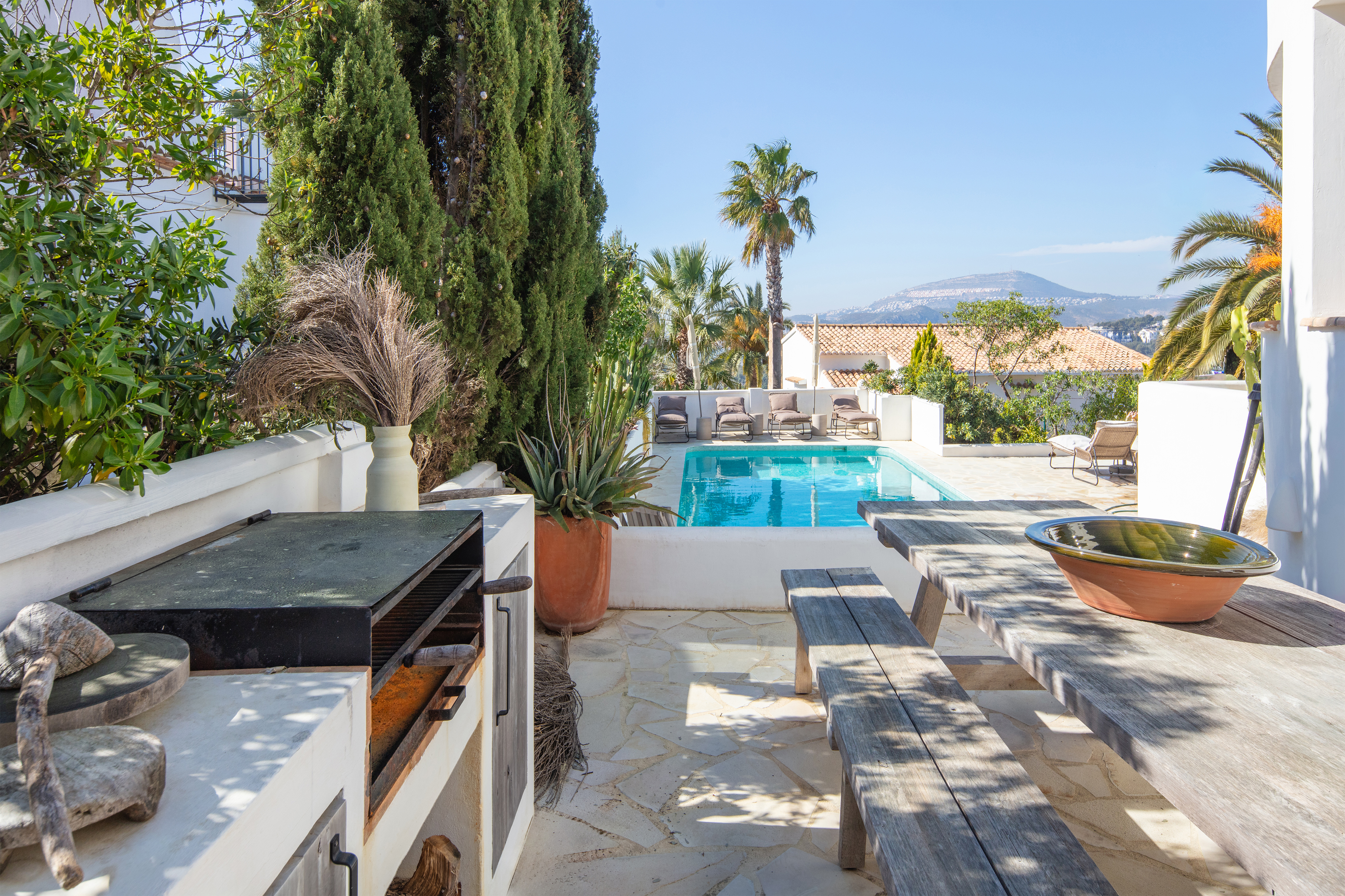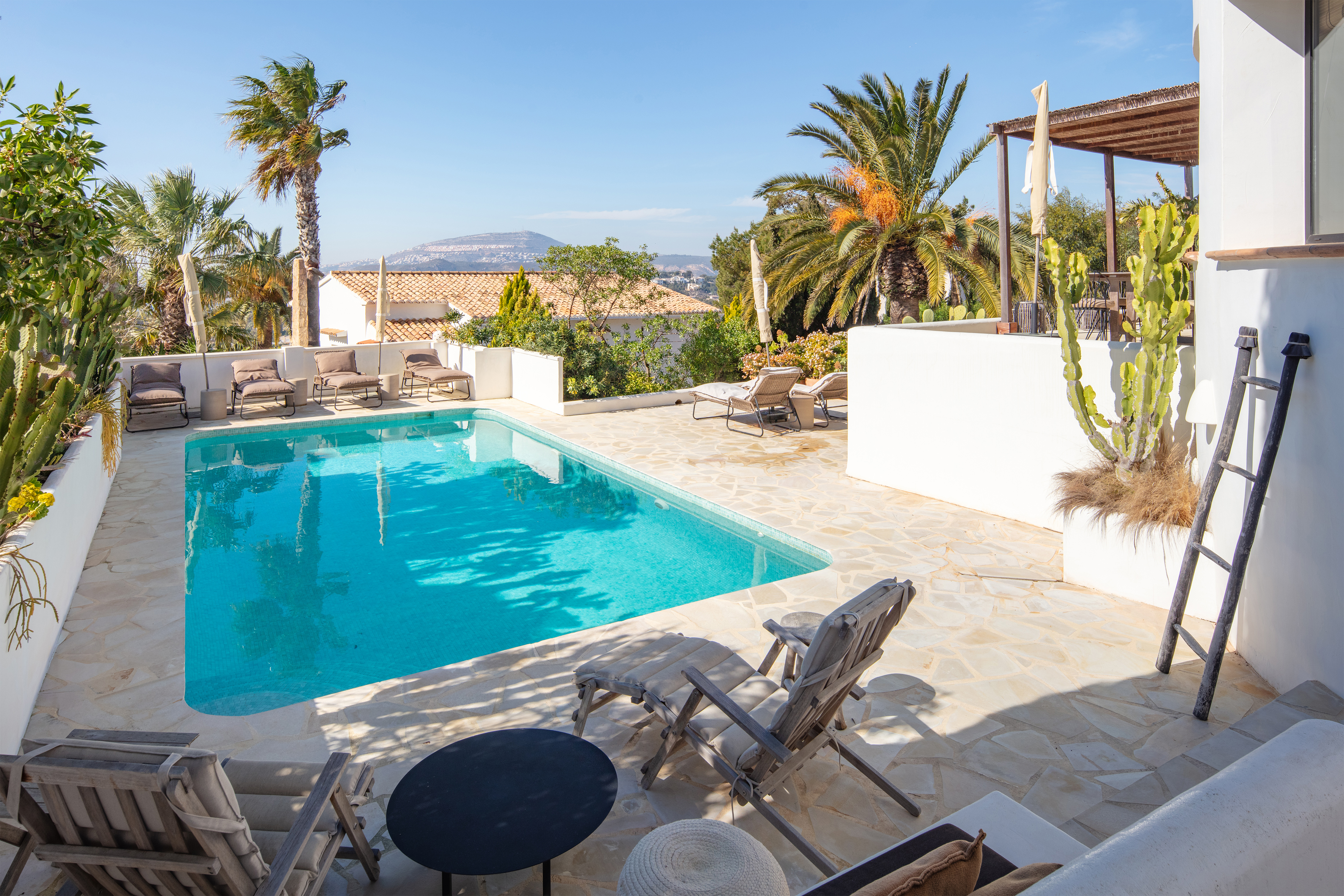 The upper floor is designed as a private level with a generous master suite, featuring an en-suite bathroom and direct access to a spacious terrace. From here, you can enjoy panoramic views over the Mediterranean Sea and the surrounding area, including the distinctive Montgó. Additionally, the villa features a separate solarium, ideal for relaxing in peace and making the most of the views and the Mediterranean climate.