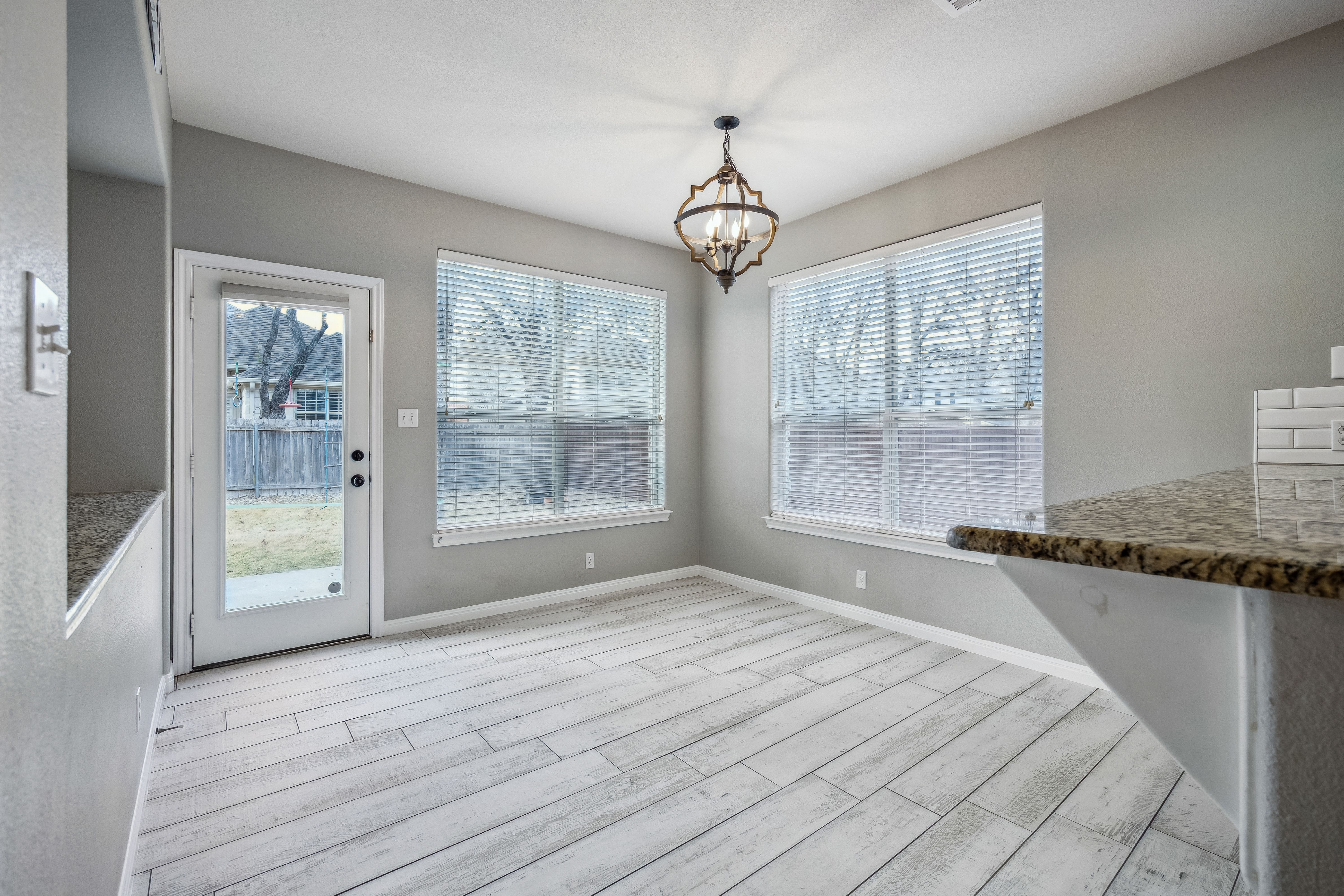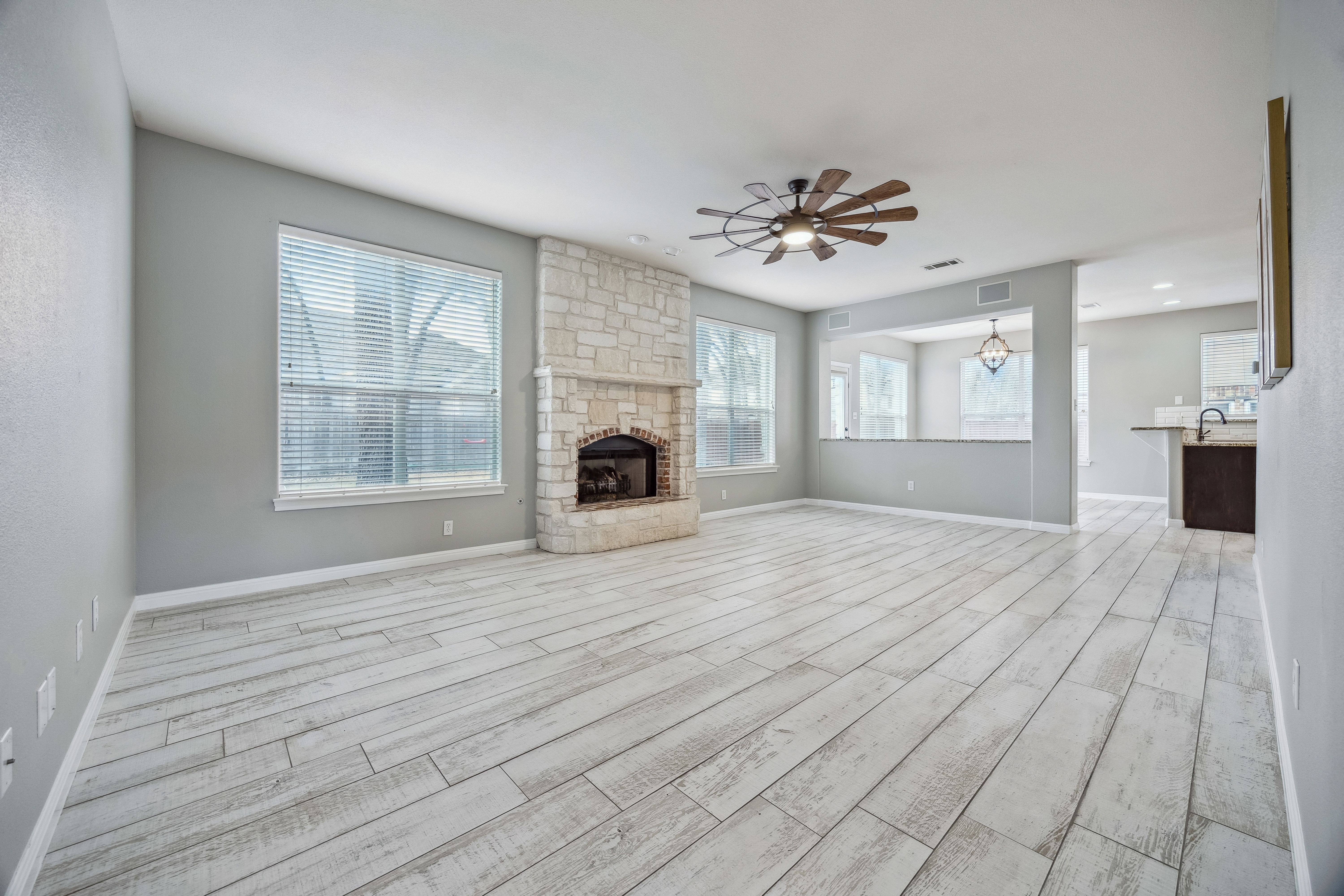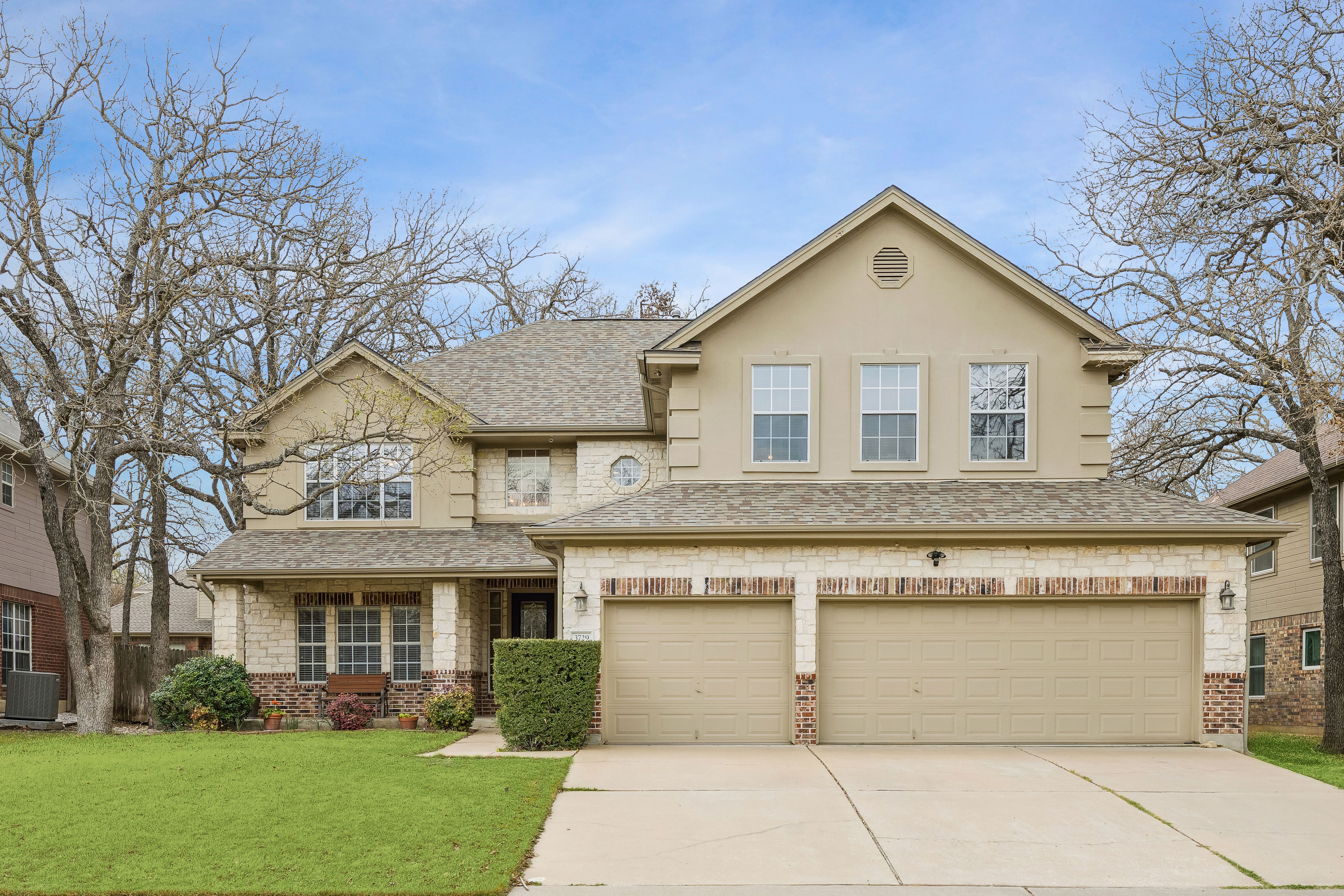 Located in the established Vista Oaks community, this spacious home sits on an oversized, tree-filled lot and offers a flexible layout designed for everyday living and entertaining. The white limestone exterior and covered front porch create inviting curb appeal, while the large fenced backyard provides plenty of room to relax under mature shade trees. Inside, the main level features multiple living and dining spaces that connect easily. The kitchen includes wood cabinetry, granite countertops, stainless steel appliances, under-cabinet lighting, a center island, large pantry, and breakfast bar seating. It opens to the living area with a gas fireplace and two dining spaces, creating an open and functional layout. Upstairs, the oversized primary suite offers abundant natural light and a spacious bath with double vanities, jetted soaking tub, separate shower, and walk-in closets. Three additional bedrooms and a shared bath provide flexibility for a variety of needs. The upper level also features a large game room with wet bar and built-in workspace, offering space for media, recreation, or a home office. Recent updates include fresh paint, updated flooring, roof replaced in 2021, and water heater in 2024. Additional highlights include a three-car extended garage, sprinkler system, covered patio, storage shed, and abundant storage throughout. Residents enjoy access to neighborhood amenities including a pool, playgrounds, greenbelt trails, sports courts, and pavilion. Conveniently located near major highways, shopping and dining, and zoned to Leander Independent School District schools.