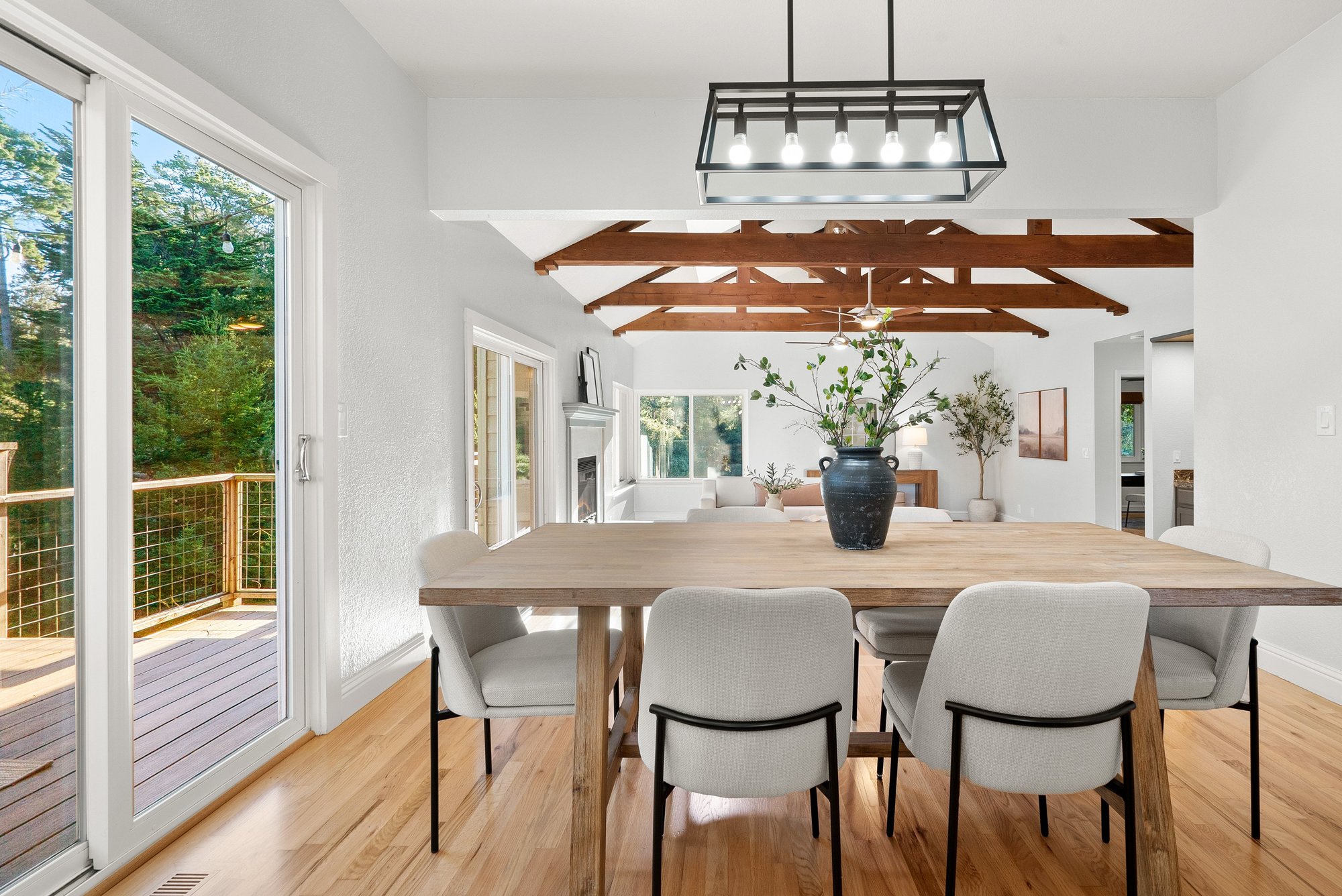 Nestled in the quaint community of Sumner Woods, is a Rio del Mar stunner sure to please. Gorgeous exposed trusses and oak floors grace the main living space, establishing a warm and cozy ambiance. The updated windows and multiple skylights create an abundance of natural light, and allow you to take in views of the lush treeline. An entertainer's dream, the open concept design seamlessly connects the kitchen, living room & generous deck off the dining area, offering a harmonious indoor-outdoor flow for California living at its finest. Chef's kitchen with quartz counters, prep island, pantry and more. A spacious deck off the kitchen is the perfect place to sip your morning coffee, practice your skills on the grill or enjoy your favorite wine in the evening twilight. 4 bedrooms, including primary suite with its own private balcony. The terraced yard maximizes its usage from dining al fresco to relaxing in the hot tub after hitting the links or a day at the beach. Easy access and a short stroll to Hidden Beach, golf, dining and more. Explore miles of sand just minutes from your doorstep, come live the beach life you have been dreaming of.