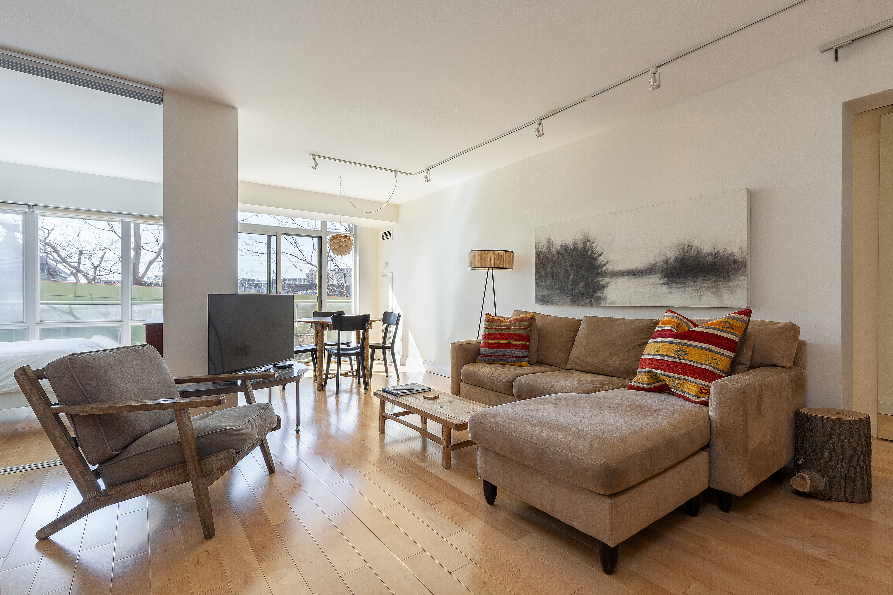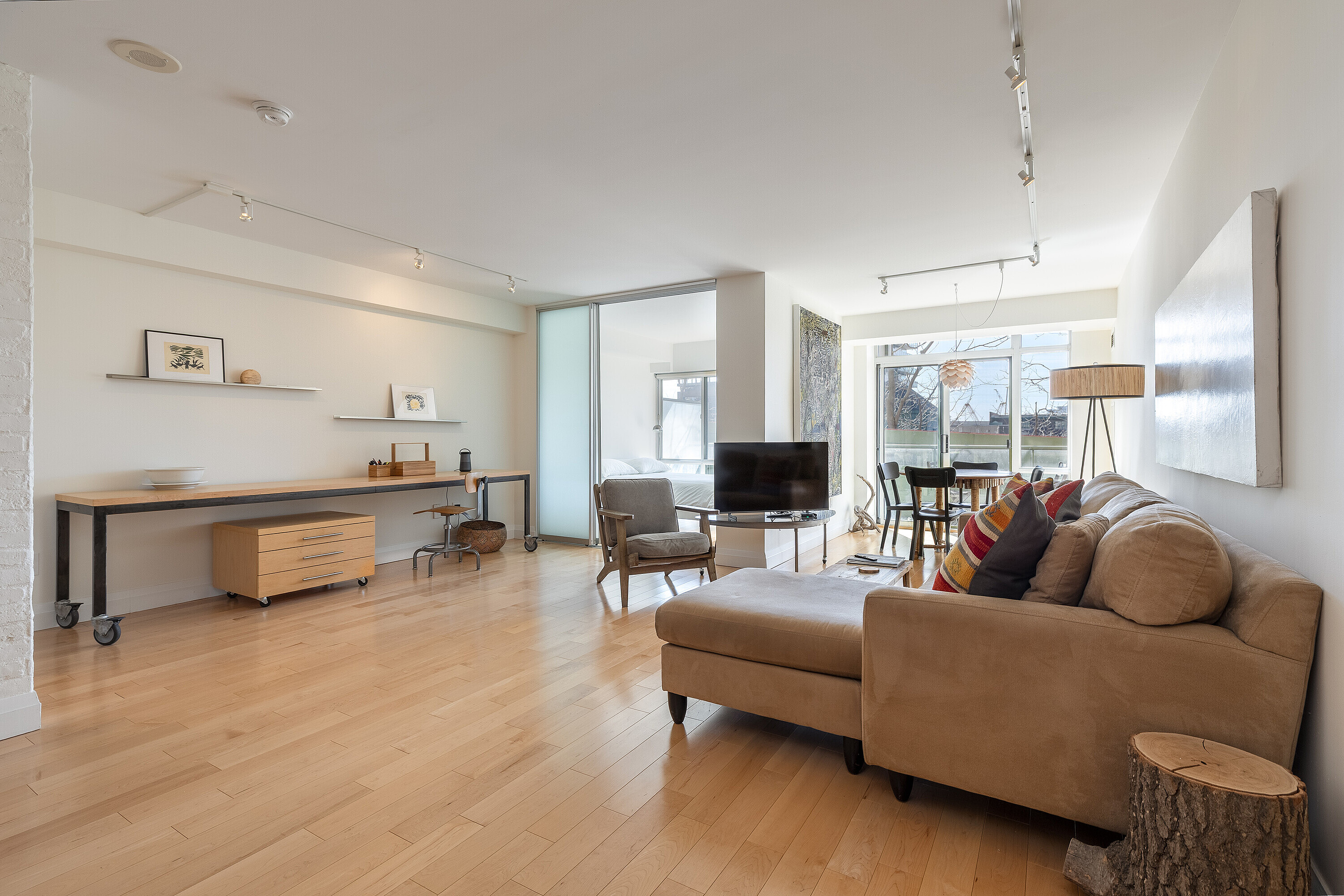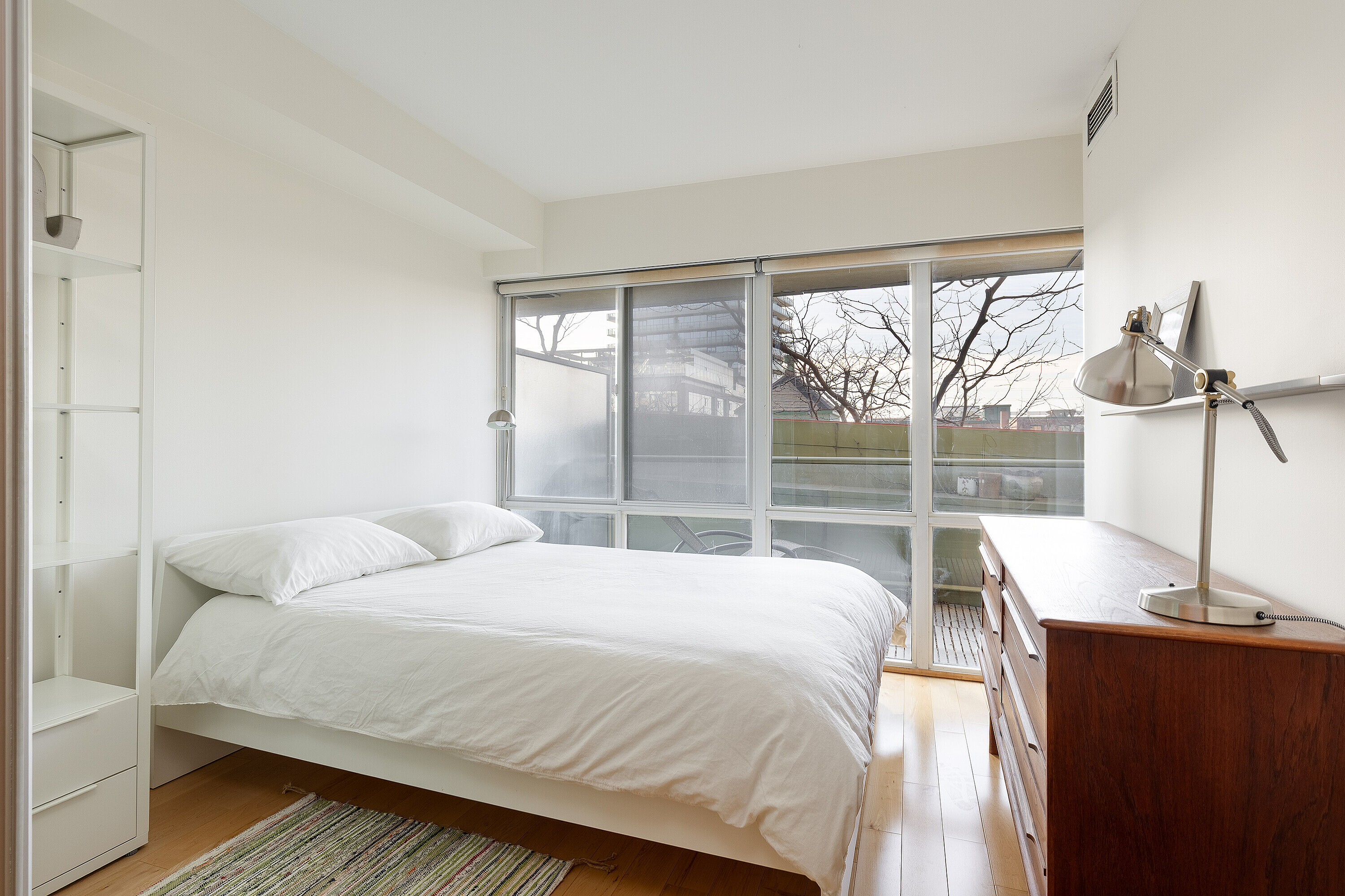 Offering a composed expression of city living within the historic Distillery District, this fully furnished two bedroom, two bathroom suite is thoughtfully arranged as a turnkey short term residence, designed for ease, comfort and flexibility. Hardwood floors and integrated millwork create a cohesive interior, while the updated kitchen anchors the living space with a centre island, bamboo cabinetry, stainless steel appliances, and generous preparation space. Natural light moves easily through the combined living and dining areas, framed by floor to ceiling south facing windows and a walkout to a large private balcony. The suite's split bedroom plan provides both privacy and adaptability. The primary bedroom features a walk-in closet, a well proportioned ensuite bathroom, and a quiet south facing outlook. The second bedroom offers versatility as a guest room, office, or extended living space, also benefiting from southern exposure. Warm materials, refined finishes, and an intuitive layout establish a calm contemporary atmosphere. Offered fully furnished and configured for short term occupancy, the suite is ideally suited for executives, relocations, and professionals seeking a refined, turnkey residence in the city. Positioned within one of Toronto's most distinctive neighbourhoods, the Distillery District's cobblestone streets, galleries, cafés, and restaurants unfold just outside the door. Convenient access to the Financial District, St. Lawrence Market, King East, transit, and major routes further enhances its ease of living. Parking and a bicycle are included.