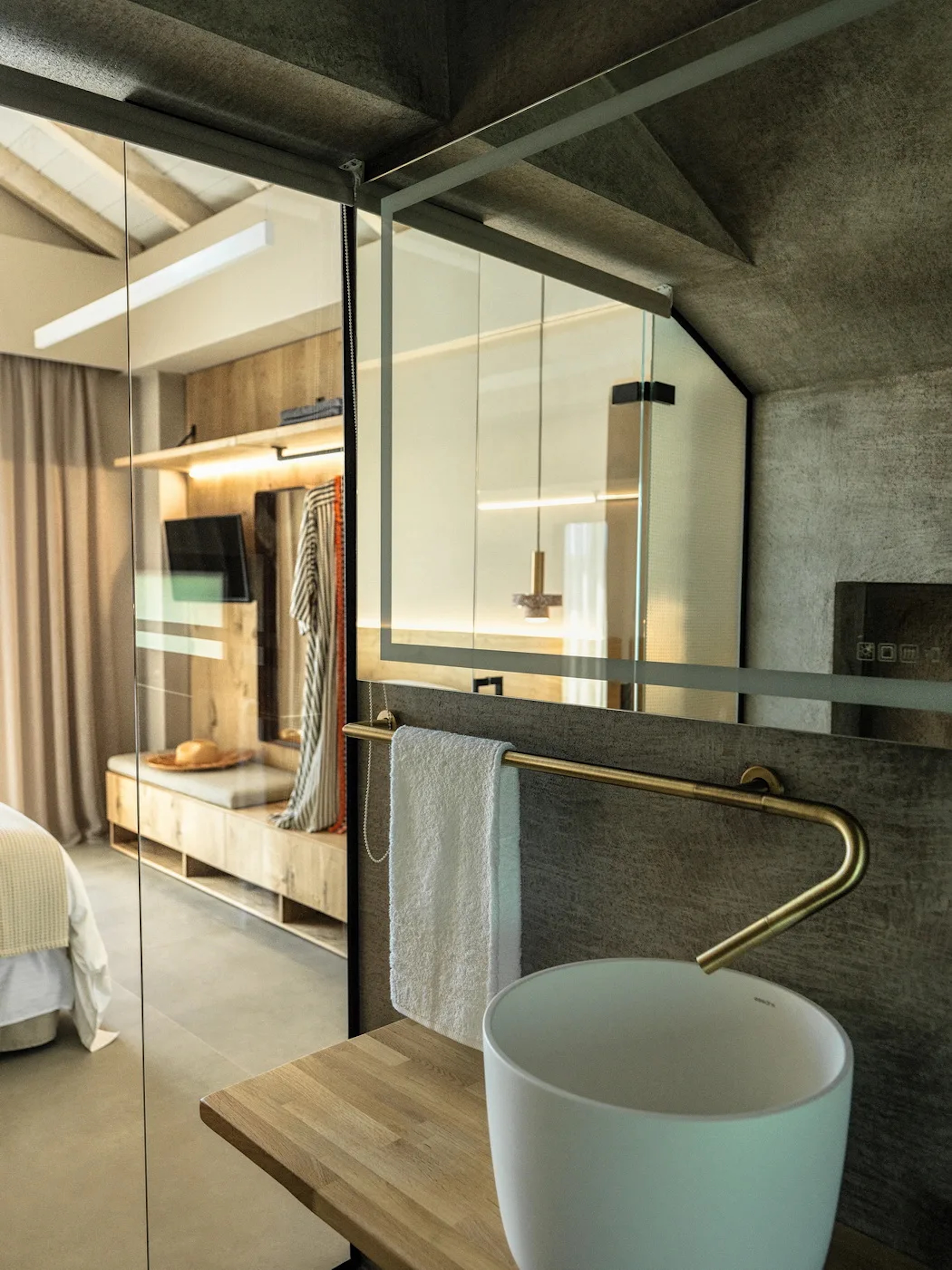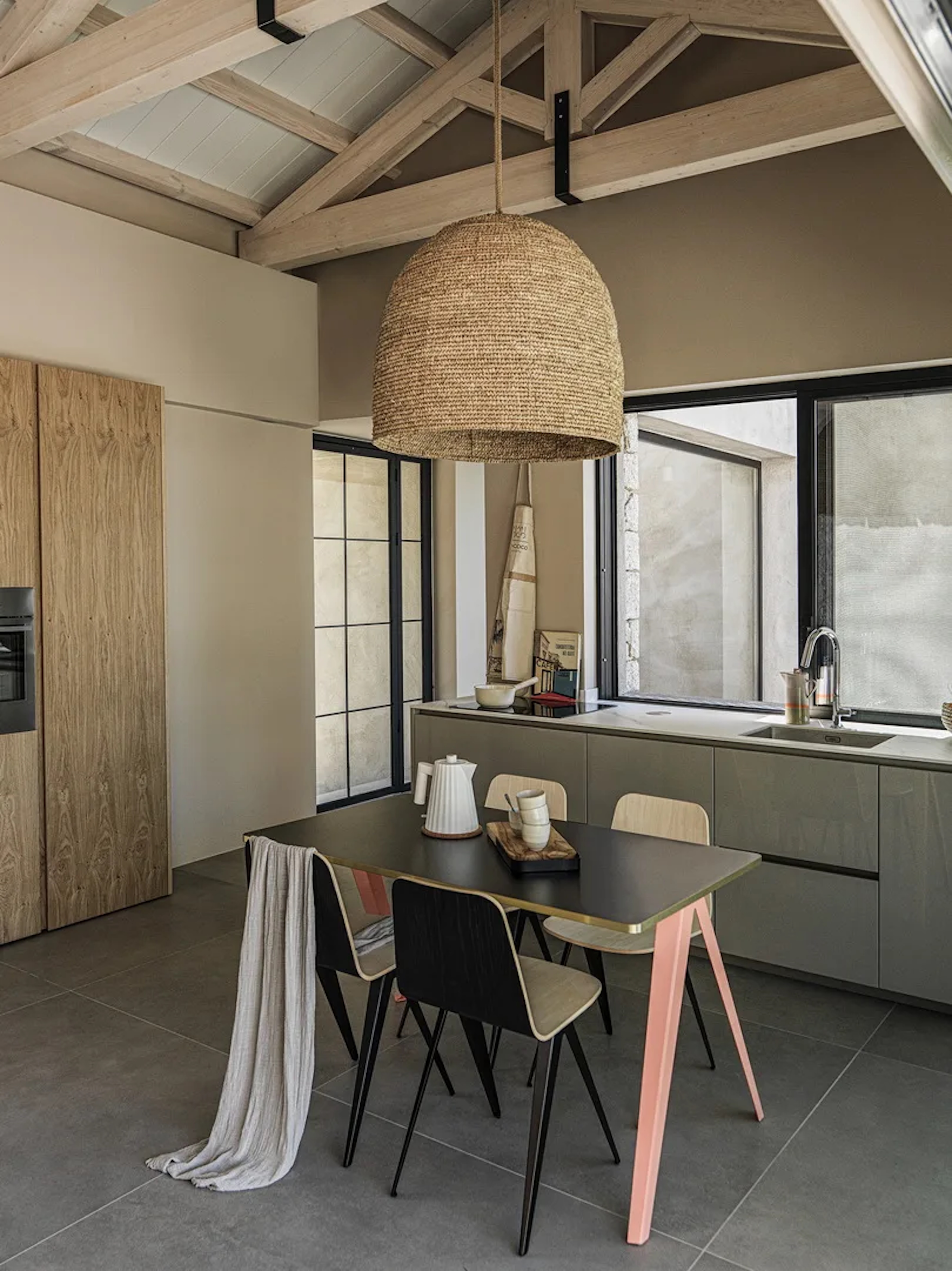 Villa 1 impresses with a high vaulted exposed beam ceiling, open-plan living room, fully fitted kitchen, and a stunning infinity pool. The upper level features a primary bedroom with an ensuite bathroom.