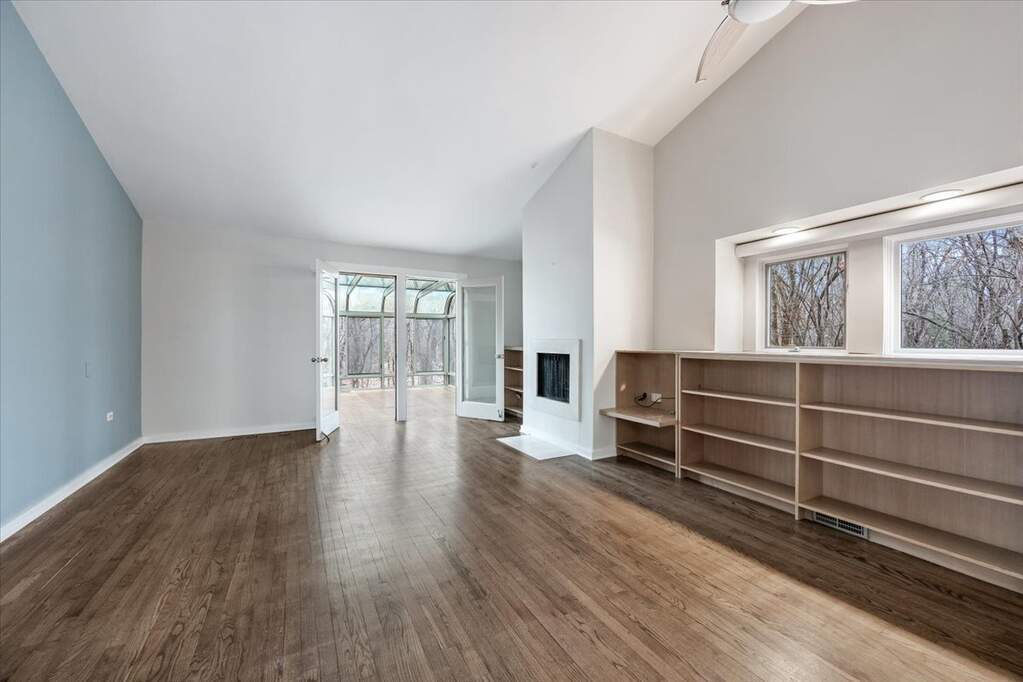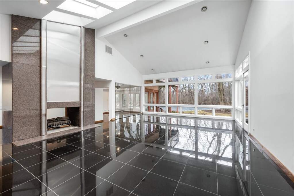 Architect-designed modern home on 1.85 private acres with a pond. A long private driveway leads to this gorgeous property with great potential but in need of renovation. Open floor plan with vaulted ceilings, skylights, and walls of windows overlooking the property. The dining room and step-up living room share a floor-to-ceiling two-sided gas fireplace. The eat-in kitchen with SubZero, Wolf, and Gaggenau appliances offers a spacious breakfast area overlooking the pond. There is direct access to a paver patio from the kitchen, living room, and family room. The primary suite includes a gas fireplace and adjacent walk-out heated sunroom used for exercise, along with a large walk-in closet and updated bath with skylights, jetted tub, and separate shower. Two additional bedrooms and 2 baths on the main level. Upstairs is a dramatic great room with beamed ceiling, wet bar, fourth full bath, large balcony, and expansive pond views. Remarkable setting. Home sold As-Is.