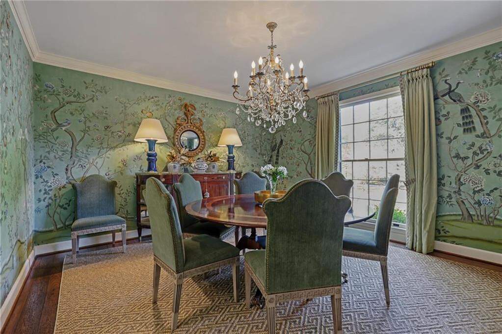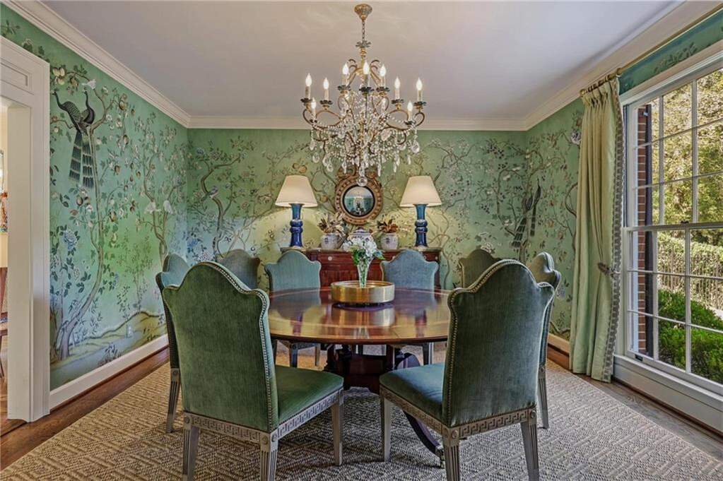 Welcome to this enchanting, historically significant Atlanta residence on prestigious Peachtree Battle Avenue. A gracious entrance foyer-with a conveniently located powder room-opens to an array of beautifully scaled living spaces ideal for both entertaining and everyday living. Enjoy a fireside formal living room, an elegant dining room adorned with hand-painted de Gournay wallpaper, and a handsome wood-paneled den complete with its own fireplace and bar. The light-filled, renovated kitchen is a chef's delight, featuring stainless steel appliances, marble countertops, an oversized island with seating, and a cheerful breakfast area. It flows seamlessly into the bright, sun-drenched family room overlooking the pool. A well-designed mudroom with bluestone flooring provides a convenient side entry and leads to the attached three-car garage, which also doubles as a superb outdoor entertaining area with direct access to the pool. Upstairs, five bedrooms and four full baths offer comfort and privacy for family and guests. The serene primary suite features its own charming fireplace, while the renovated primary bath includes a double vanity, soaking tub, separate shower, and a custom walk-in closet. An upstairs laundry room enhances the home's everyday convenience. Outside, the meticulously landscaped, level backyard is an entertainer's dream. A sparkling pool, outdoor powder bath, and covered patio create a resort-like oasis perfect for relaxing, gathering, and hosting unforgettable events.