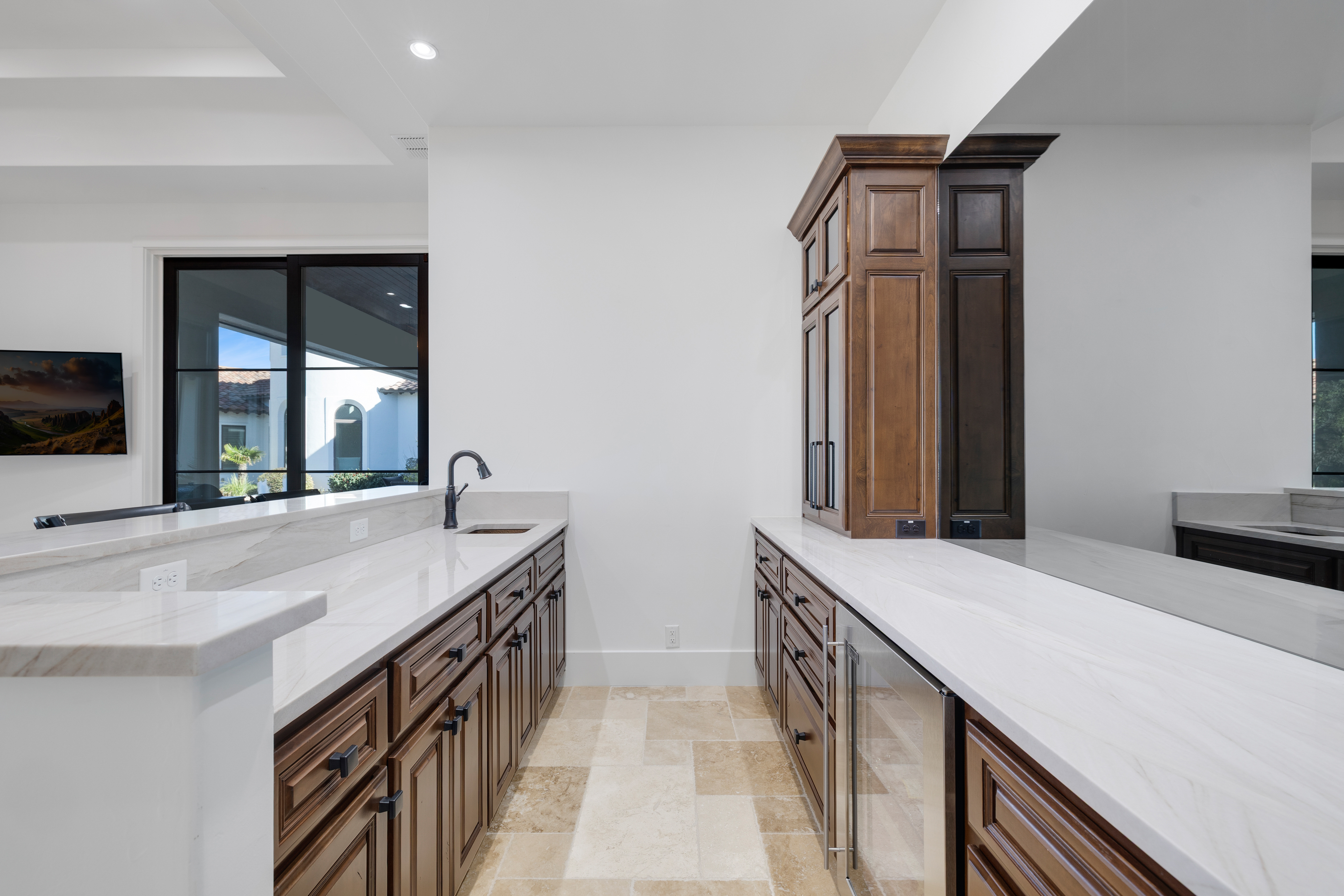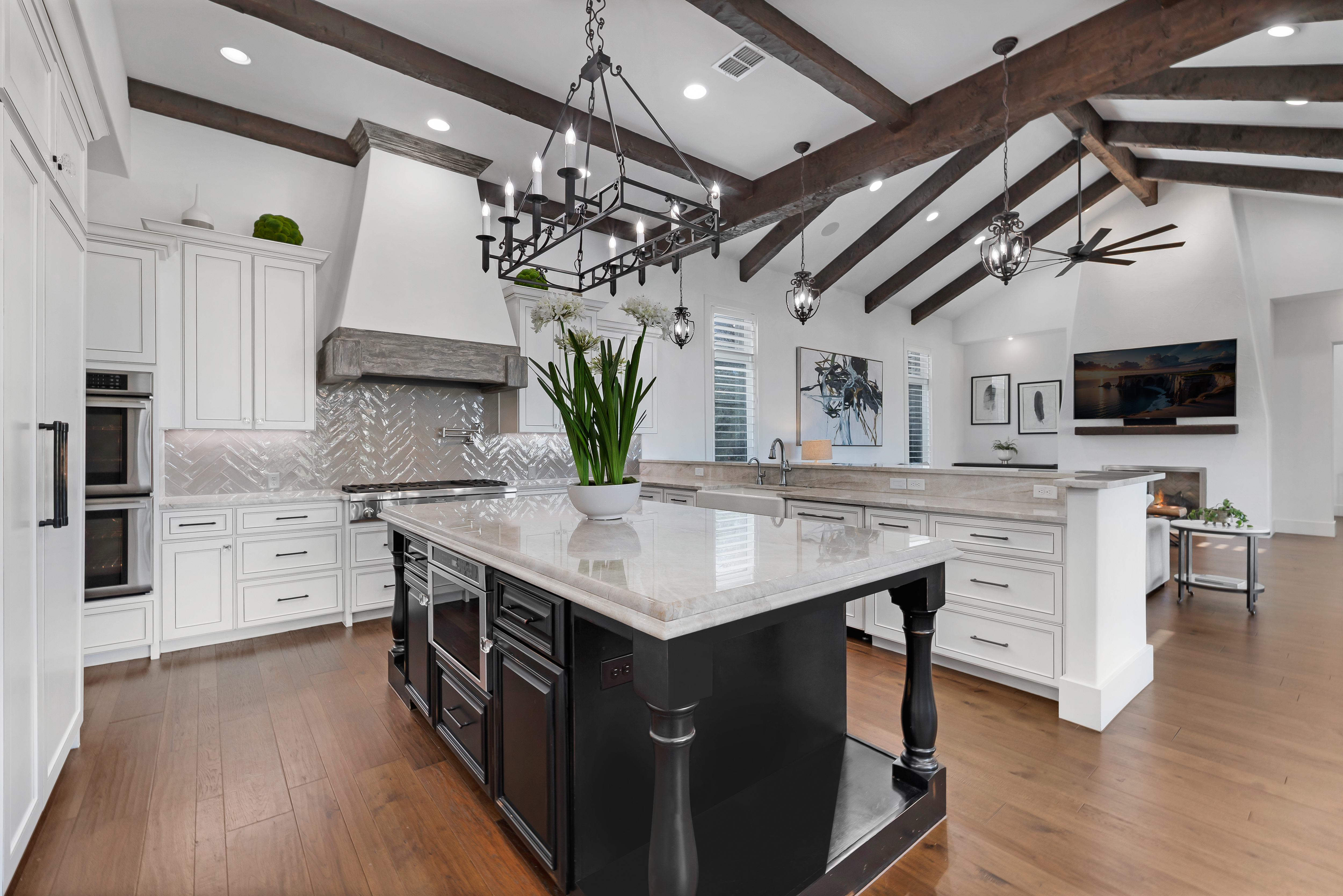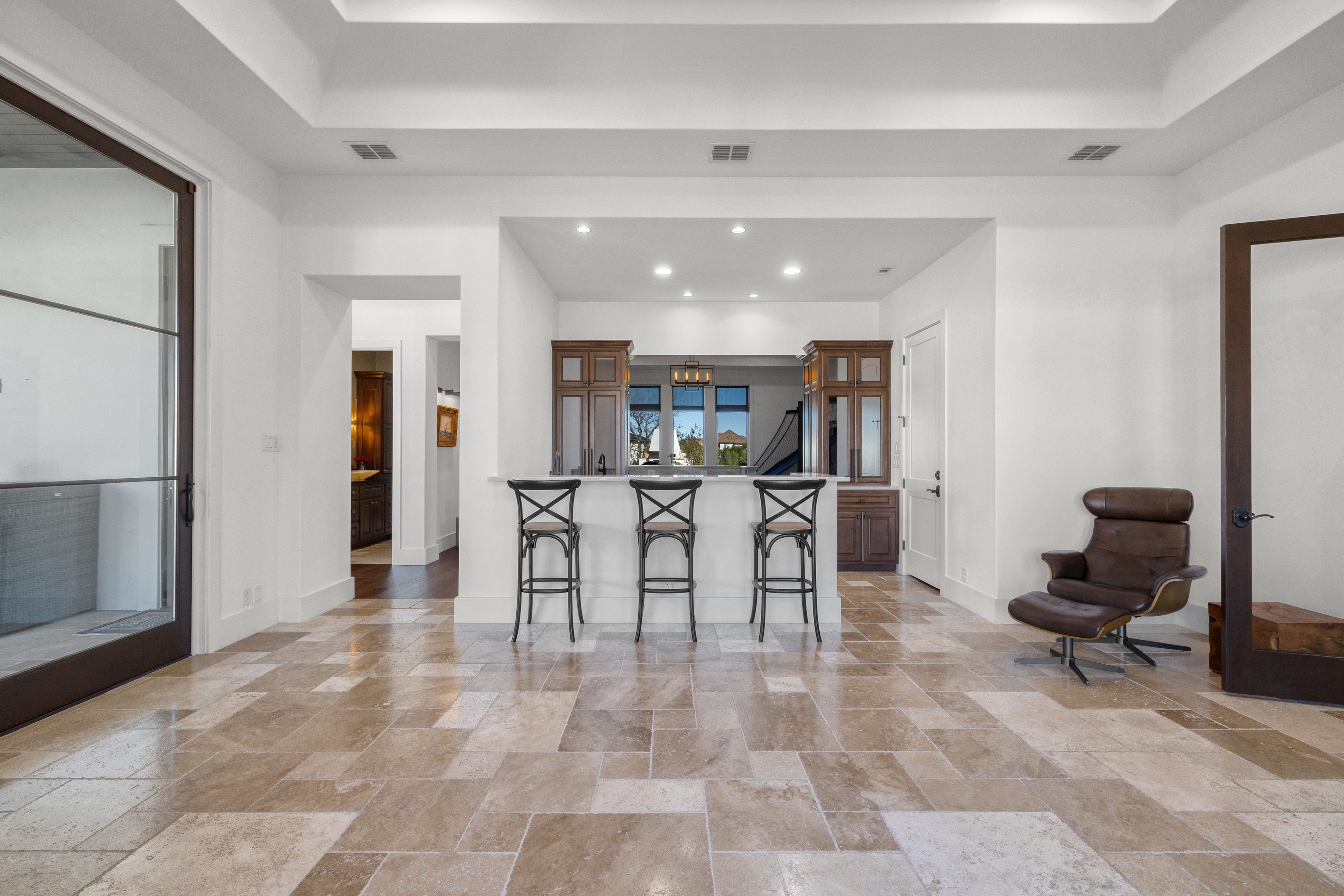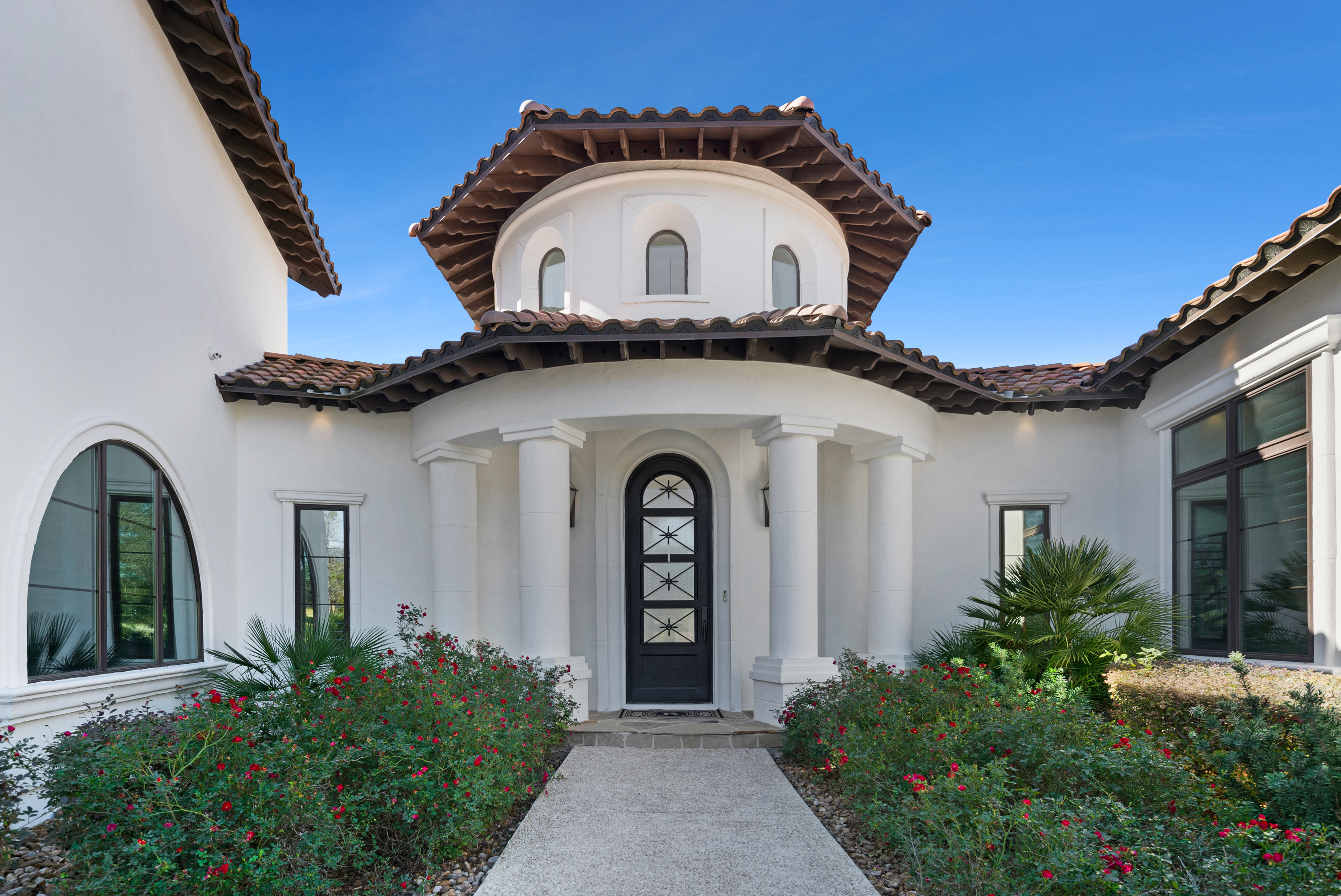 Situated within the gated enclave of The Huntington at Shavano Park, this exceptional Burdick Homes estate offers privacy, scale, and architectural refinement on 1.14 acres backing to a tranquil greenbelt setting. Thoughtfully designed for both elevated entertaining and everyday living, the residence blends timeless craftsmanship with a seamless indoor and outdoor connection. The interior is defined by generous proportions, soaring ceilings, and an effortless flow between living spaces. At the center of the home, the chef's kitchen is both striking and functional, featuring Taj Mahal quartzite countertops, professional-grade stainless steel appliances, custom cabinet-paneled refrigeration, double ovens, gas cooking, pot filler, farmhouse sink, and an oversized walk-in pantry. The kitchen opens directly to the main living area, where wood beam accents and expansive windows create warmth while framing serene views of the grounds beyond. Large sliding glass doors extend the living experience outdoors, revealing a resort-style setting anchored by a Keith Zars pool and spa. A covered patio, full summer kitchen, and outdoor fireplace create an ideal environment for both intimate gatherings and larger scale entertaining, all overlooking the natural greenbelt backdrop. The primary suite is positioned as a private retreat, offering a spa-inspired bath with an oversized walk-in shower, soaking tub, dual vanities, and a custom-designed walk-in closet. A spacious secondary suite on the main level provides flexibility for guests or multigenerational living while maintaining privacy. Additional living spaces include a secondary lounge with built-in bar and Perlick wine refrigeration, along with a dedicated pilates studio and gym overlooking the backyard. Extensive storage, a private safe room, and thoughtfully executed architectural details throughout further elevate the home's functionality and long-term livability. An exceptional offering within The Huntington at Shavano Park, where privacy, design, and setting align to create a residence of enduring quality.