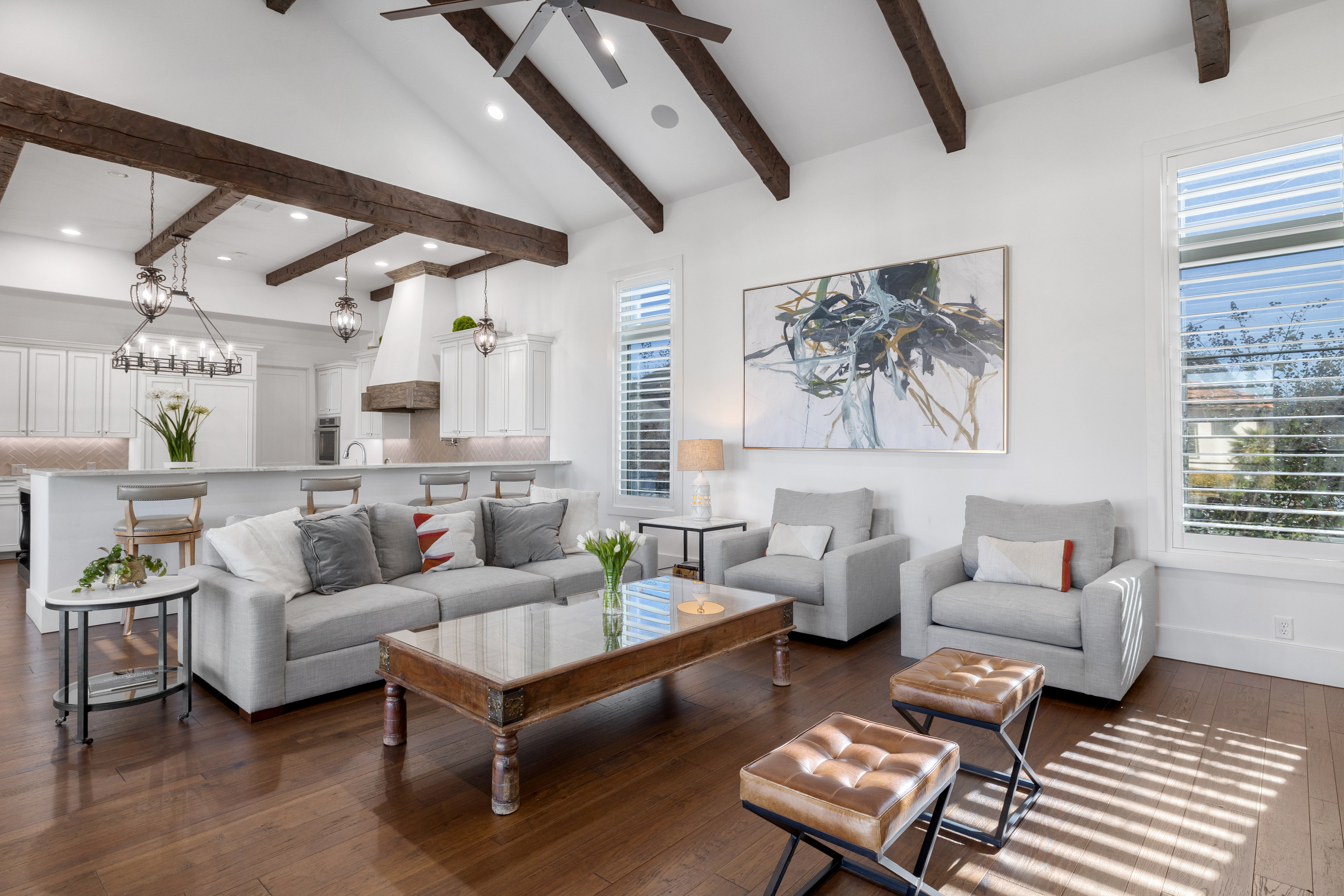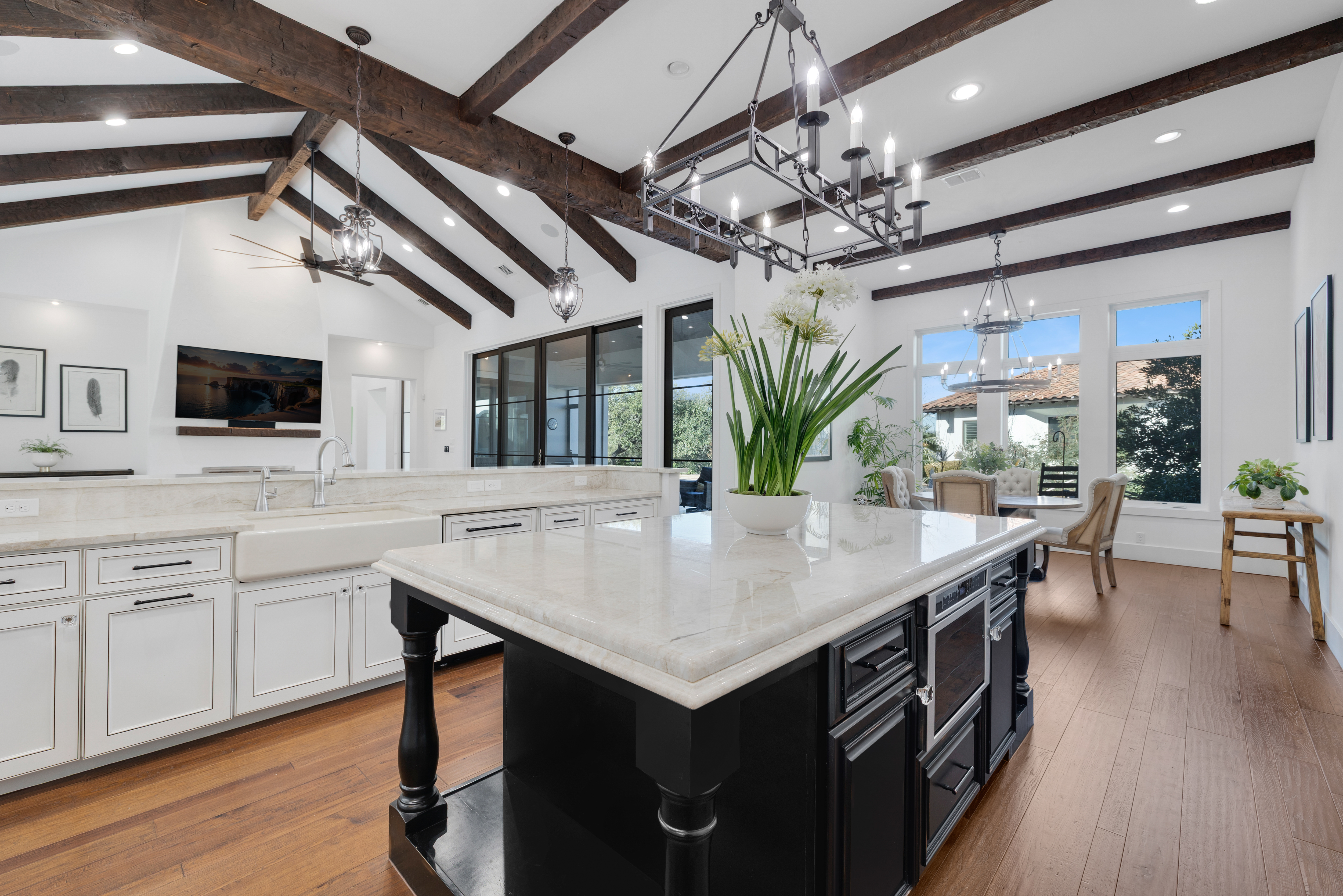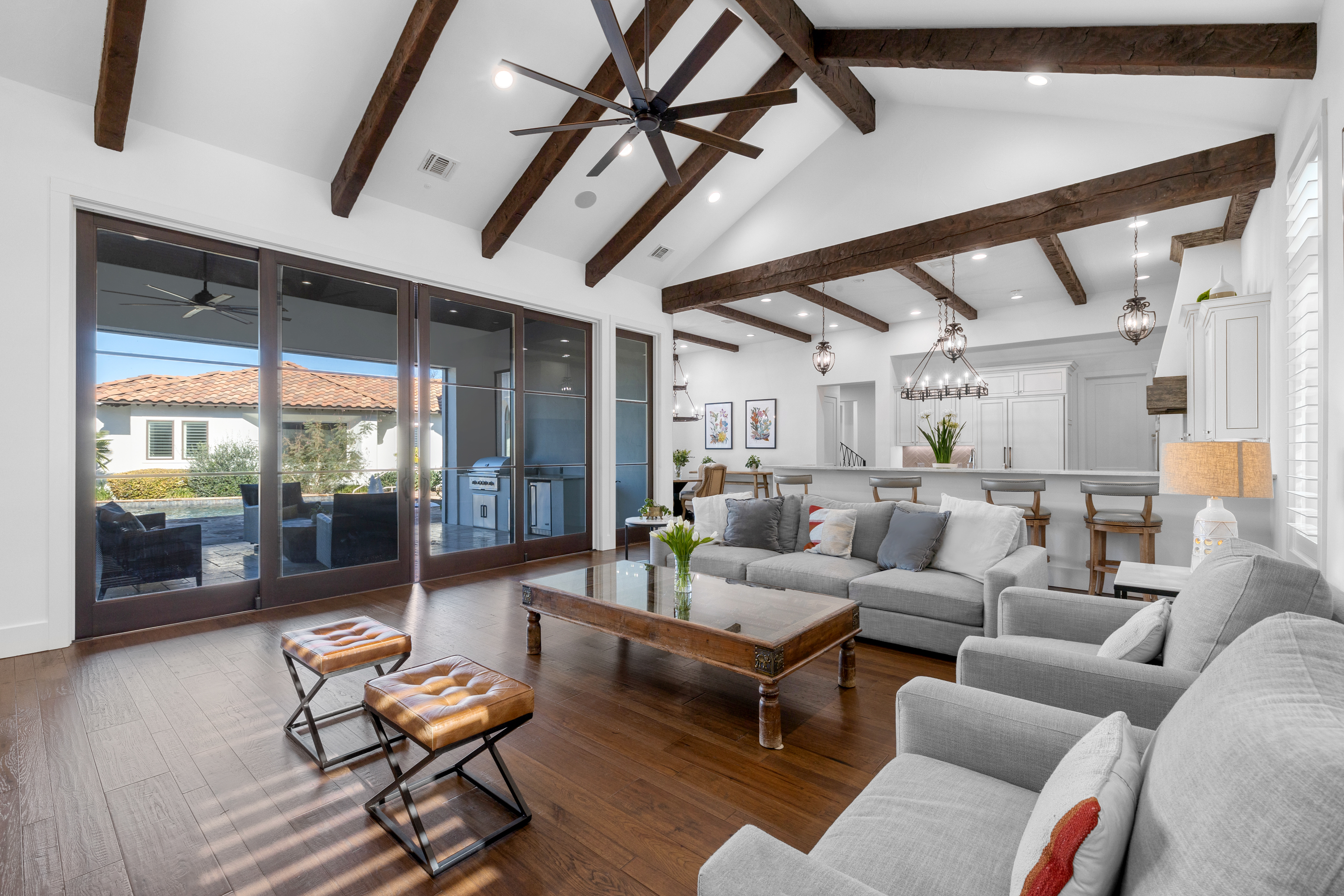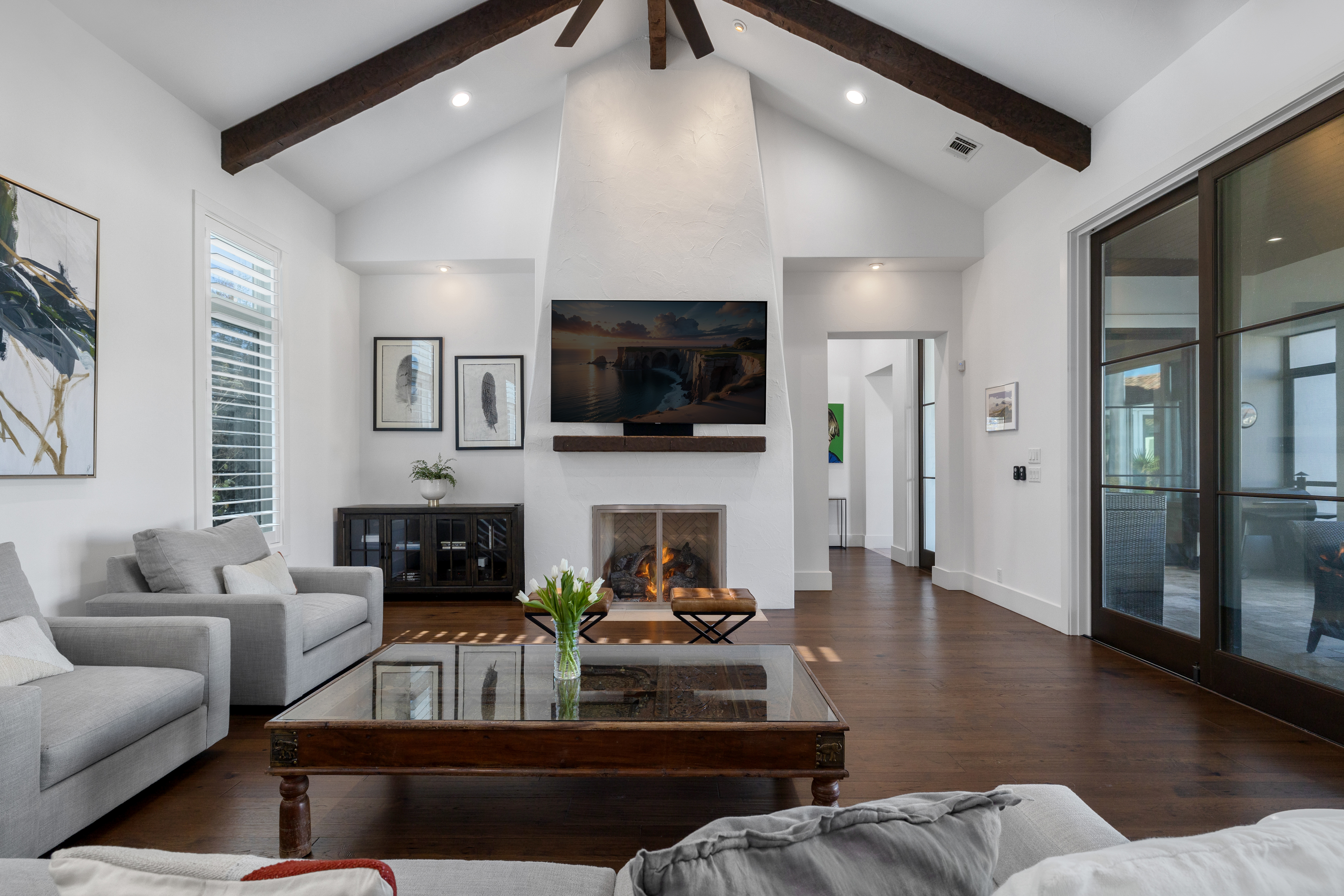 Situated within the gated enclave of The Huntington at Shavano Park, this exceptional Burdick Homes estate offers privacy, scale, and architectural refinement on 1.14 acres backing to a tranquil greenbelt setting. Thoughtfully designed for both elevated entertaining and everyday living, the residence blends timeless craftsmanship with a seamless indoor and outdoor connection. The interior is defined by generous proportions, soaring ceilings, and an effortless flow between living spaces. At the center of the home, the chef's kitchen is both striking and functional, featuring Taj Mahal quartzite countertops, professional-grade stainless steel appliances, custom cabinet-paneled refrigeration, double ovens, gas cooking, pot filler, farmhouse sink, and an oversized walk-in pantry. The kitchen opens directly to the main living area, where wood beam accents and expansive windows create warmth while framing serene views of the grounds beyond. Large sliding glass doors extend the living experience outdoors, revealing a resort-style setting anchored by a Keith Zars pool and spa. A covered patio, full summer kitchen, and outdoor fireplace create an ideal environment for both intimate gatherings and larger scale entertaining, all overlooking the natural greenbelt backdrop. The primary suite is positioned as a private retreat, offering a spa-inspired bath with an oversized walk-in shower, soaking tub, dual vanities, and a custom-designed walk-in closet. A spacious secondary suite on the main level provides flexibility for guests or multigenerational living while maintaining privacy. Additional living spaces include a secondary lounge with built-in bar and Perlick wine refrigeration, along with a dedicated pilates studio and gym overlooking the backyard. Extensive storage, a private safe room, and thoughtfully executed architectural details throughout further elevate the home's functionality and long-term livability. An exceptional offering within The Huntington at Shavano Park, where privacy, design, and setting align to create a residence of enduring quality.