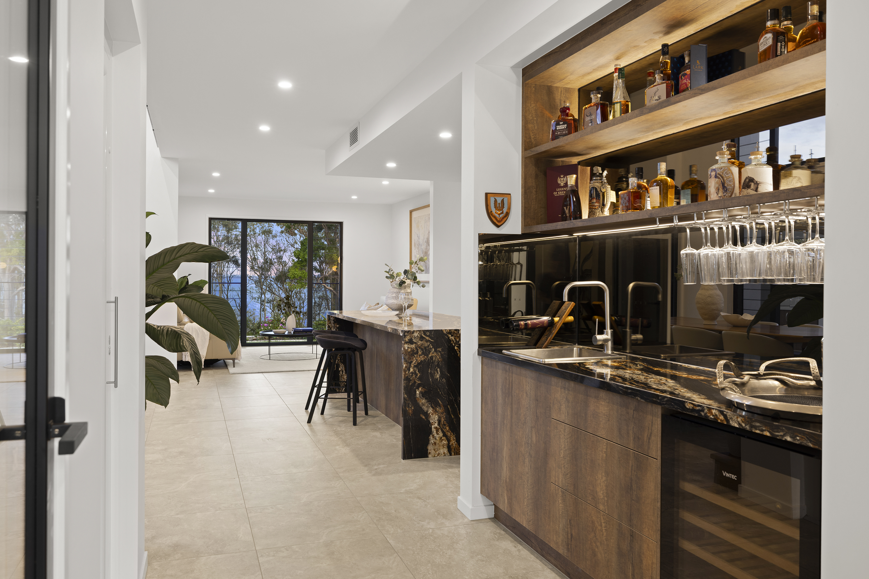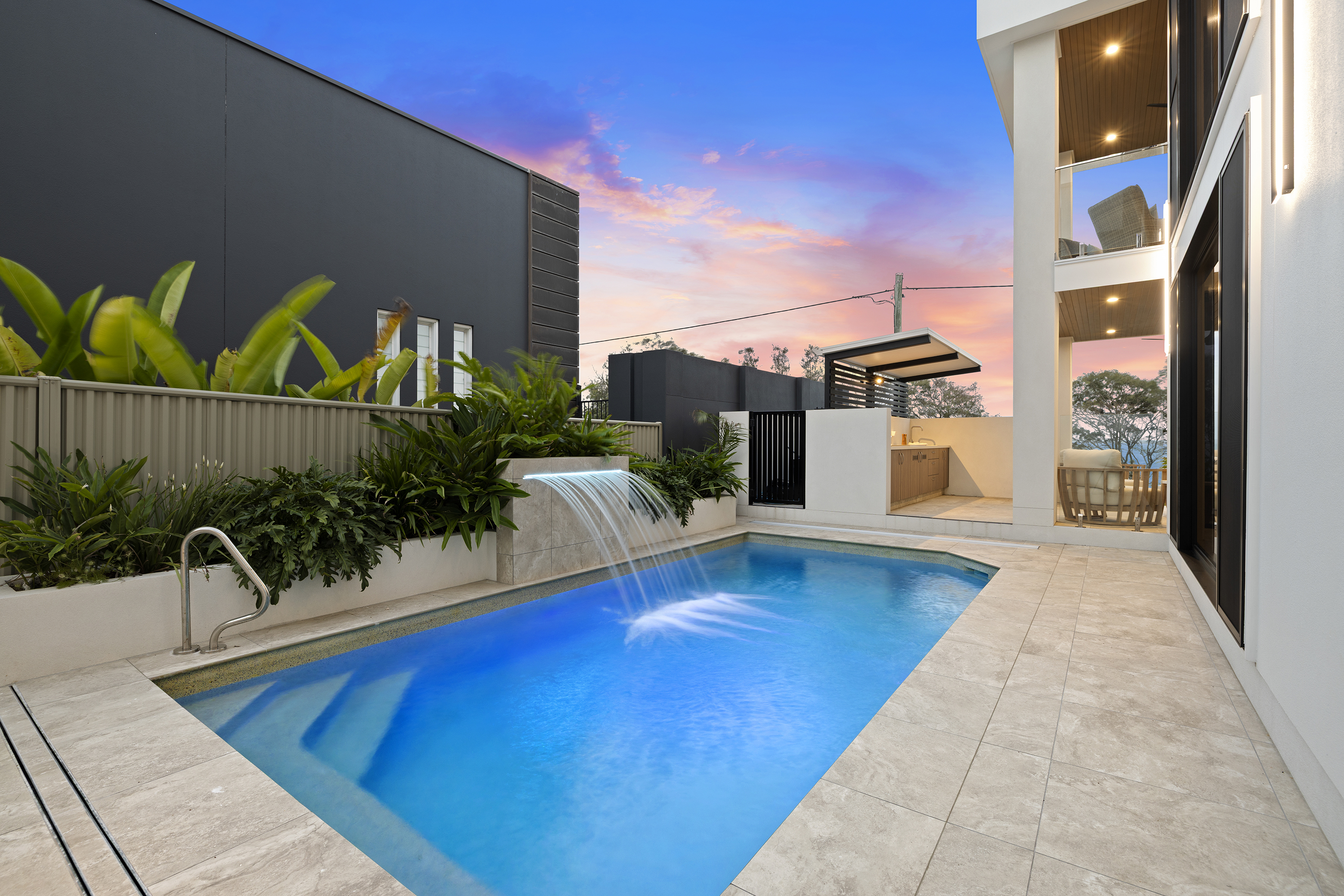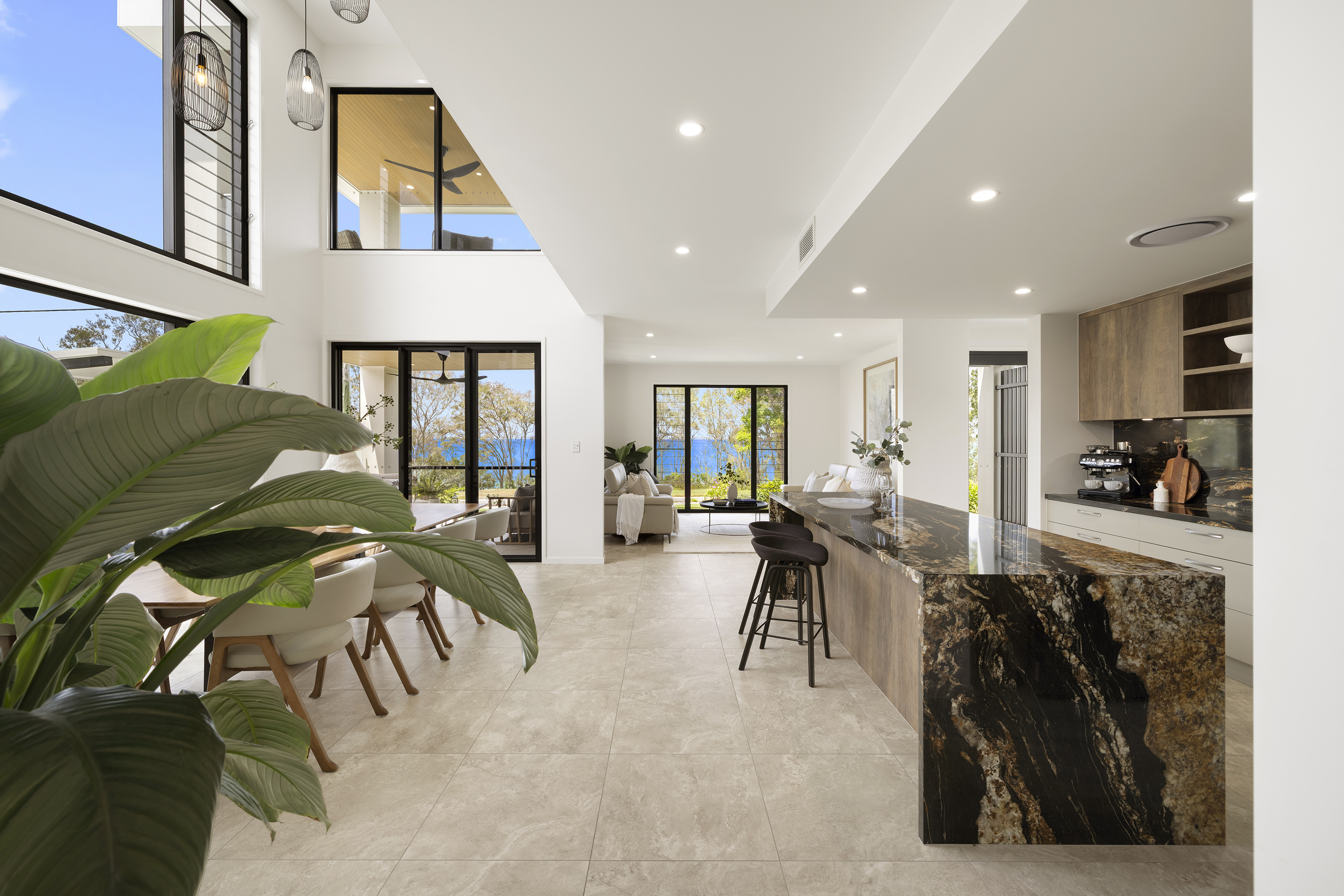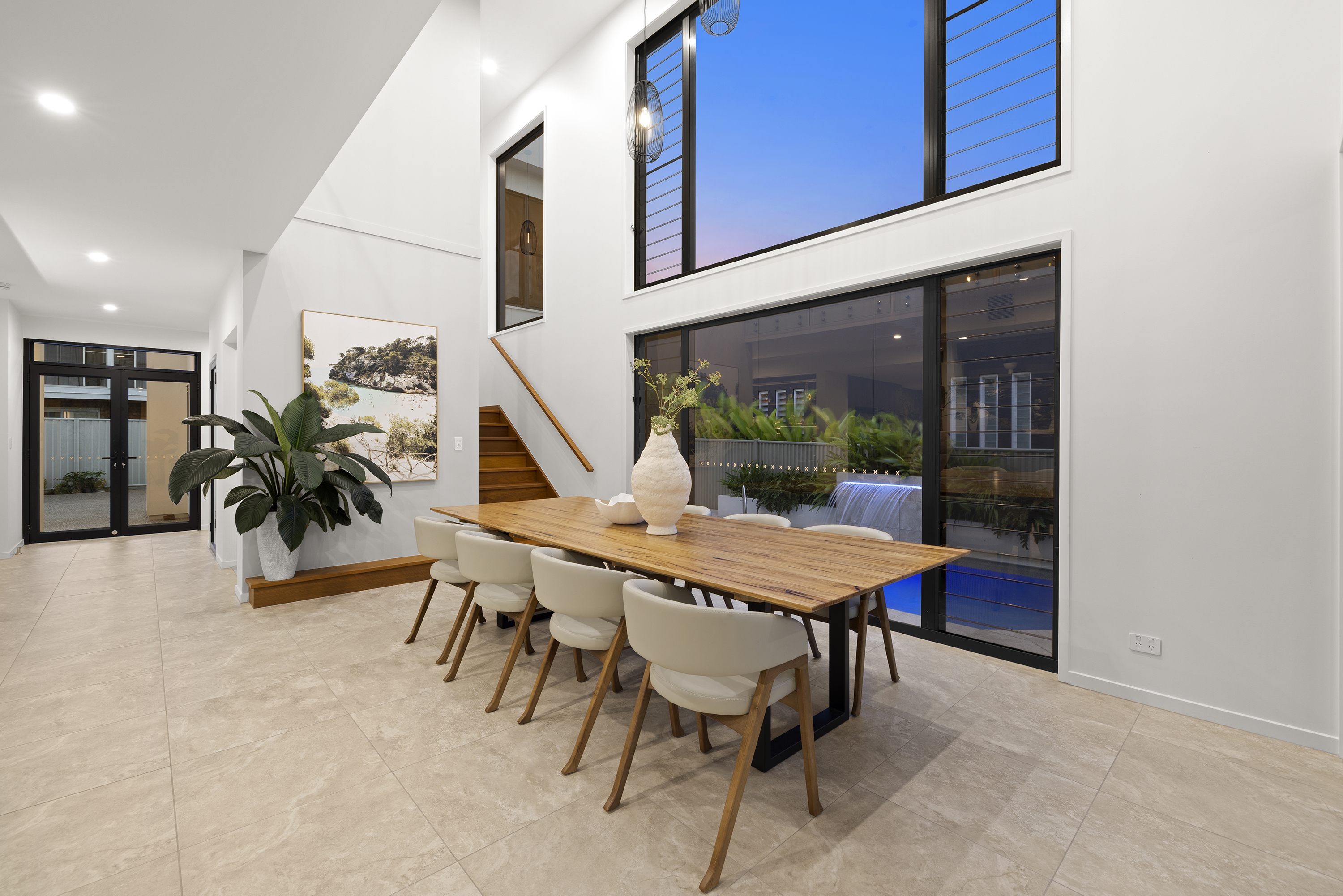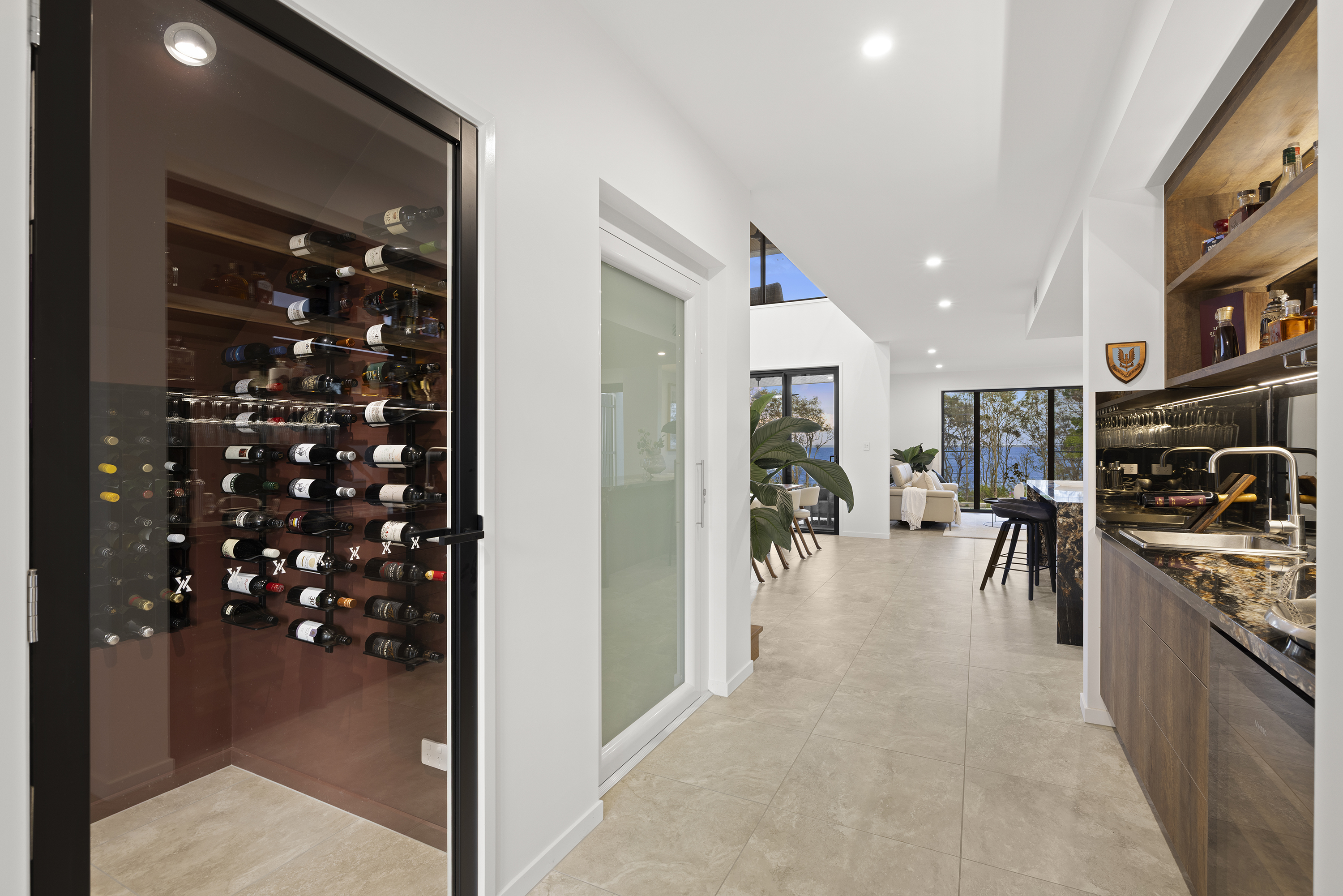 Commanding one of the most sought-after waterfront locations on the Hervey Bay Esplanade, this newly completed executive residence offers exceptional luxury and liveability. Built by master builder Aspiring Homes, the dual-level home with an internal lift sits on a prized 613 sqm waterfront block, providing panoramic views across the turquoise waters of Hervey Bay to World Heritage–listed K'gari. With three ensuite bedrooms, a heated swimming pool, a walk-in wine cellar, a media room, and multiple living areas, every detail and finish has been thoughtfully considered. Step inside, and the bay views unfold through double-height glazing, filling the ground-floor living spaces with natural light and inviting cool bay breezes. The open-plan kitchen, dining, and living area centres on a Black-Fusion granite island that serves as both a practical serving space and a sculptural piece of art. Beyond the main kitchen, a dedicated skylit work kitchen with integrated appliances, double refrigerators, and a double sink enables effortless entertaining without disrupting the pristine aesthetics. A bespoke solid timber staircase with a handcrafted handrail ascends as an architectural statement, leading to the upper level. For wine enthusiasts, a walk-in cellar with glass walls showcases the collection and elevates the home's entertainment appeal. Outside, the heated swimming pool with a cascading water feature is bordered by lush tropical plants and natural stone paving, with an adjacent alfresco kitchen equipped with a built-in barbecue and cabinetry. Glass pool fencing preserves the uninterrupted view. At the same time, the covered ground-level terrace extends the entertainment space, creating a sheltered spot to watch the sunset over the bay or spot seasonal migrating humpback whales. Each of the three bedrooms has an ensuite, providing resort-style comfort for residents and guests alike. One spacious ground-floor bedroom with an ensuite offers both accessibility and privacy, making it ideal for a family home or as a self-contained guest retreat. Upstairs, two ensuite bedrooms enjoy uninterrupted bay views, serviced by a kitchenette with sink and under-bench refrigerator, so the upper level functions as a self-sufficient private wing. A dedicated study nook with a built-in desk and cabinetry provides an efficient home-office environment with a leafy outlook. The upper level also includes a media room and a second covered balcony with a timber-lined ceiling and a ceiling fan, capturing elevated bayfront views of the Coral Sea and toward K'gari. Select amenities • Internal lift connecting both levels • 10kW solar panel system • Fully automated irrigation for gardens and lawns • Two-car garage with motorised door and remote control • Fully gated and fenced • Separate laundry with integrated appliances and an outdoor drying area • Ducted air conditioning throughout • Operable windows to regulate sea breezes • Built-in wardrobes and premium cabinetry throughout • Large-format floor tiles and plush carpet in bedrooms