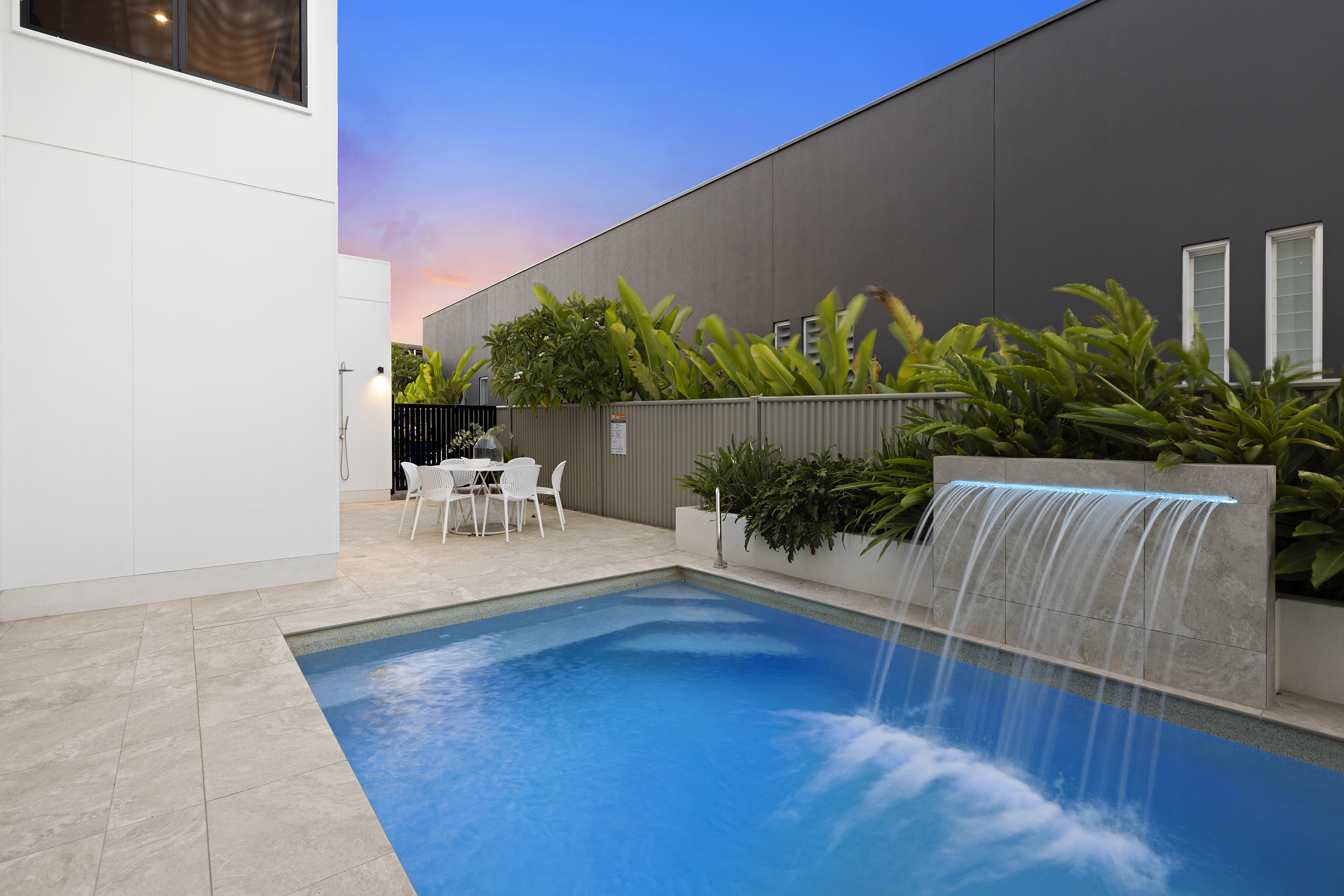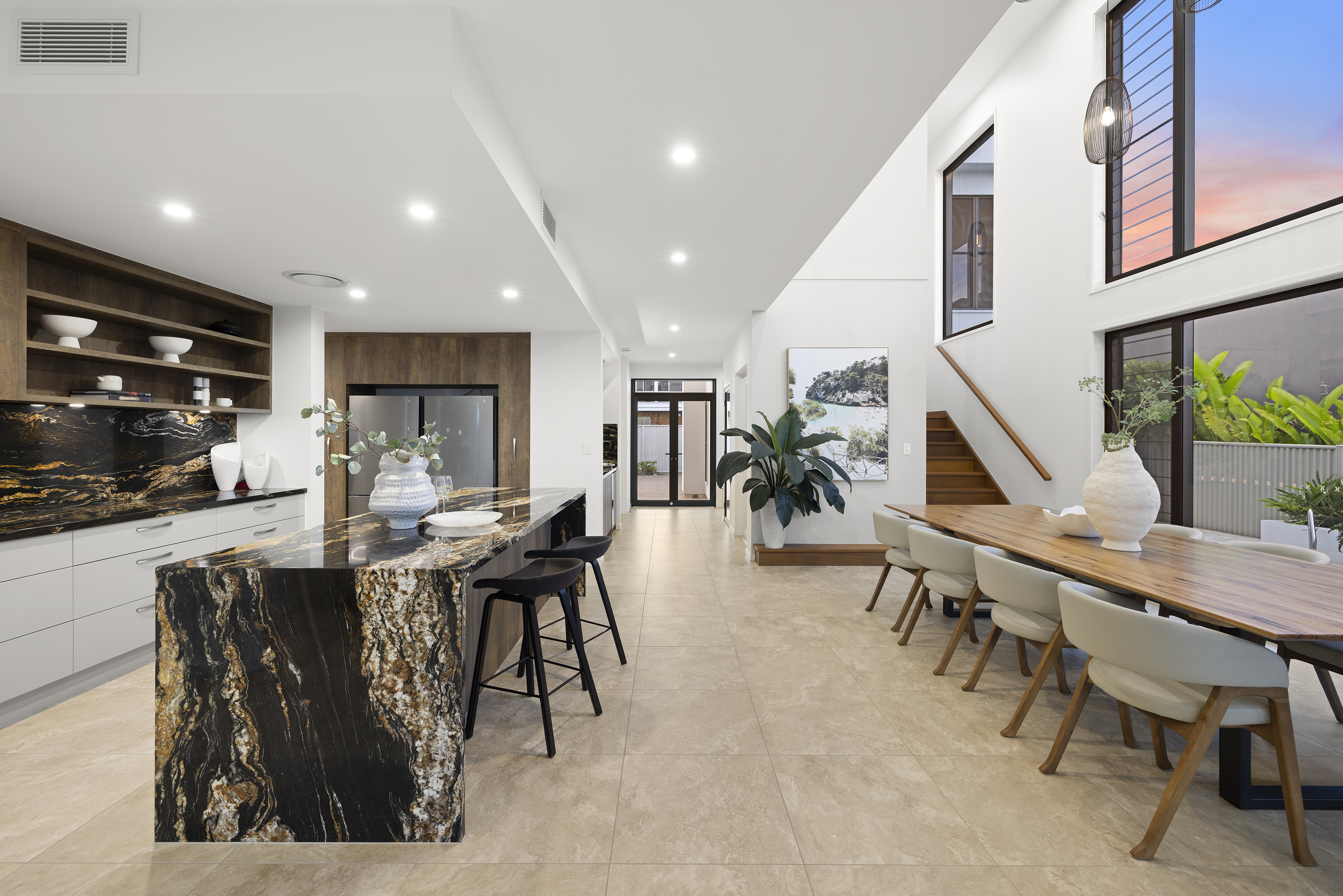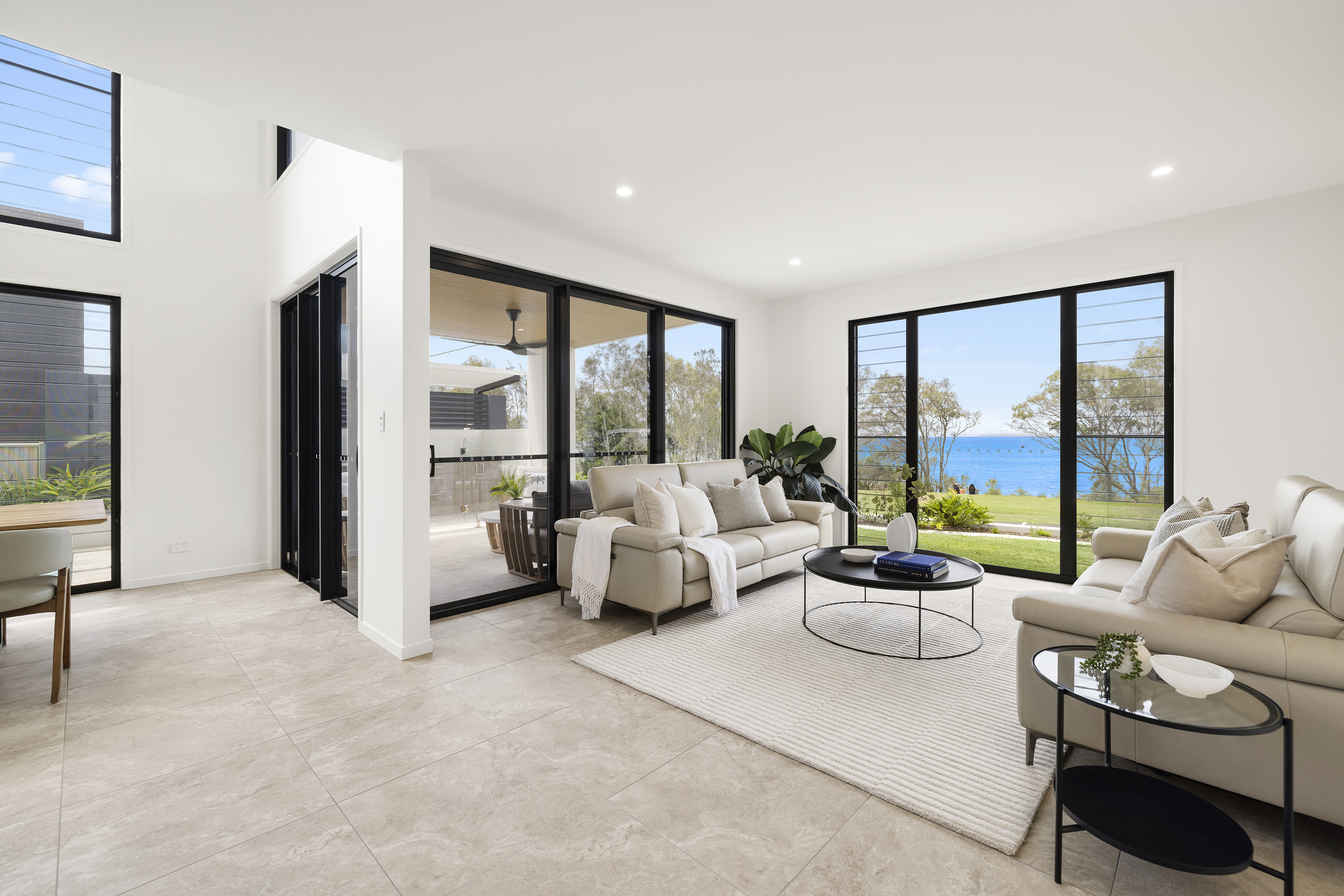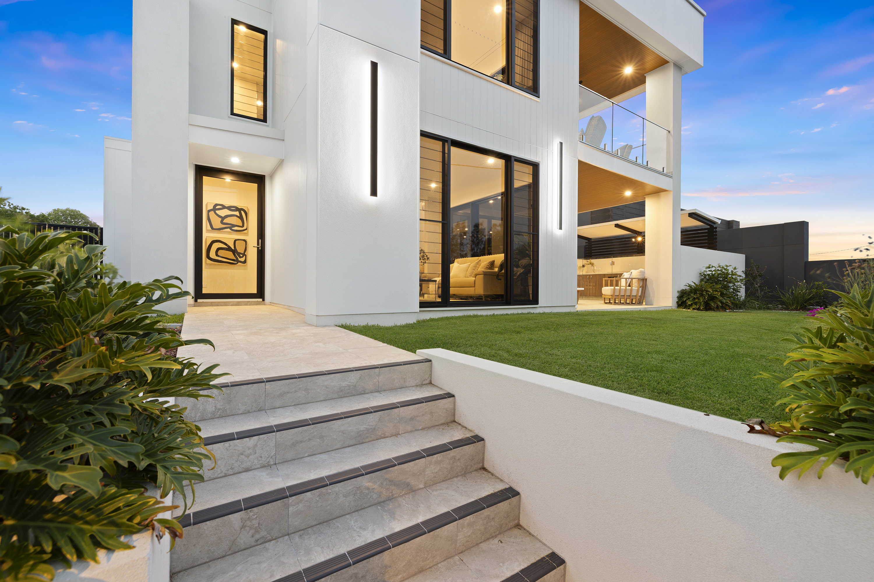 Commanding one of the most sought-after waterfront locations on the Hervey Bay Esplanade, this newly completed executive residence offers exceptional luxury and liveability. Built by master builder Aspiring Homes, the dual-level home with an internal lift sits on a prized 613 sqm waterfront block, providing panoramic views across the turquoise waters of Hervey Bay to World Heritage–listed K'gari. With three ensuite bedrooms, a heated swimming pool, a walk-in wine cellar, a media room, and multiple living areas, every detail and finish has been thoughtfully considered. Step inside, and the bay views unfold through double-height glazing, filling the ground-floor living spaces with natural light and inviting cool bay breezes. The open-plan kitchen, dining, and living area centres on a Black-Fusion granite island that serves as both a practical serving space and a sculptural piece of art. Beyond the main kitchen, a dedicated skylit work kitchen with integrated appliances, double refrigerators, and a double sink enables effortless entertaining without disrupting the pristine aesthetics. A bespoke solid timber staircase with a handcrafted handrail ascends as an architectural statement, leading to the upper level. For wine enthusiasts, a walk-in cellar with glass walls showcases the collection and elevates the home's entertainment appeal. Outside, the heated swimming pool with a cascading water feature is bordered by lush tropical plants and natural stone paving, with an adjacent alfresco kitchen equipped with a built-in barbecue and cabinetry. Glass pool fencing preserves the uninterrupted view. At the same time, the covered ground-level terrace extends the entertainment space, creating a sheltered spot to watch the sunset over the bay or spot seasonal migrating humpback whales. Each of the three bedrooms has an ensuite, providing resort-style comfort for residents and guests alike. One spacious ground-floor bedroom with an ensuite offers both accessibility and privacy, making it ideal for a family home or as a self-contained guest retreat. Upstairs, two ensuite bedrooms enjoy uninterrupted bay views, serviced by a kitchenette with sink and under-bench refrigerator, so the upper level functions as a self-sufficient private wing. A dedicated study nook with a built-in desk and cabinetry provides an efficient home-office environment with a leafy outlook. The upper level also includes a media room and a second covered balcony with a timber-lined ceiling and a ceiling fan, capturing elevated bayfront views of the Coral Sea and toward K'gari. Select amenities • Internal lift connecting both levels • 10kW solar panel system • Fully automated irrigation for gardens and lawns • Two-car garage with motorised door and remote control • Fully gated and fenced • Separate laundry with integrated appliances and an outdoor drying area • Ducted air conditioning throughout • Operable windows to regulate sea breezes • Built-in wardrobes and premium cabinetry throughout • Large-format floor tiles and plush carpet in bedrooms