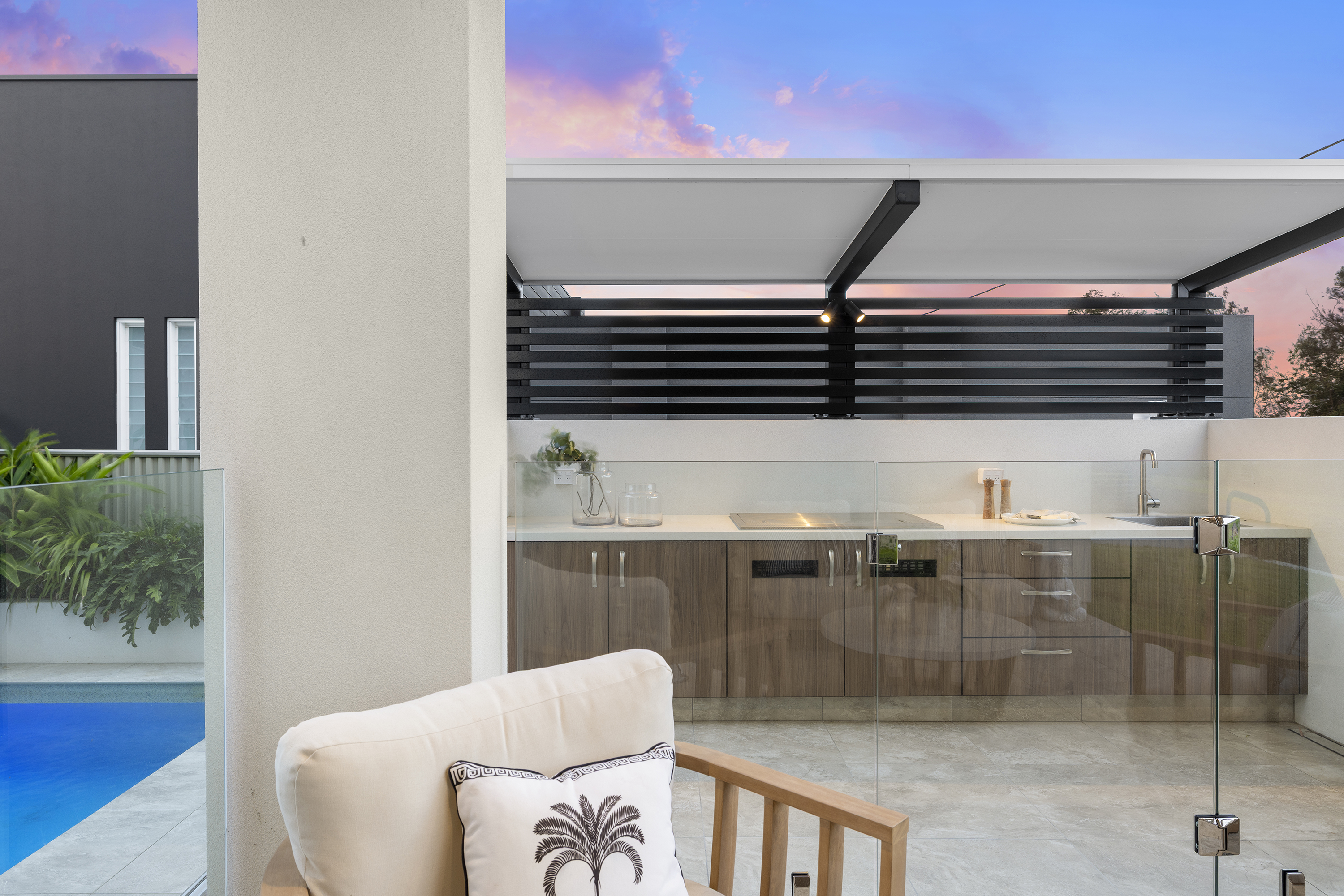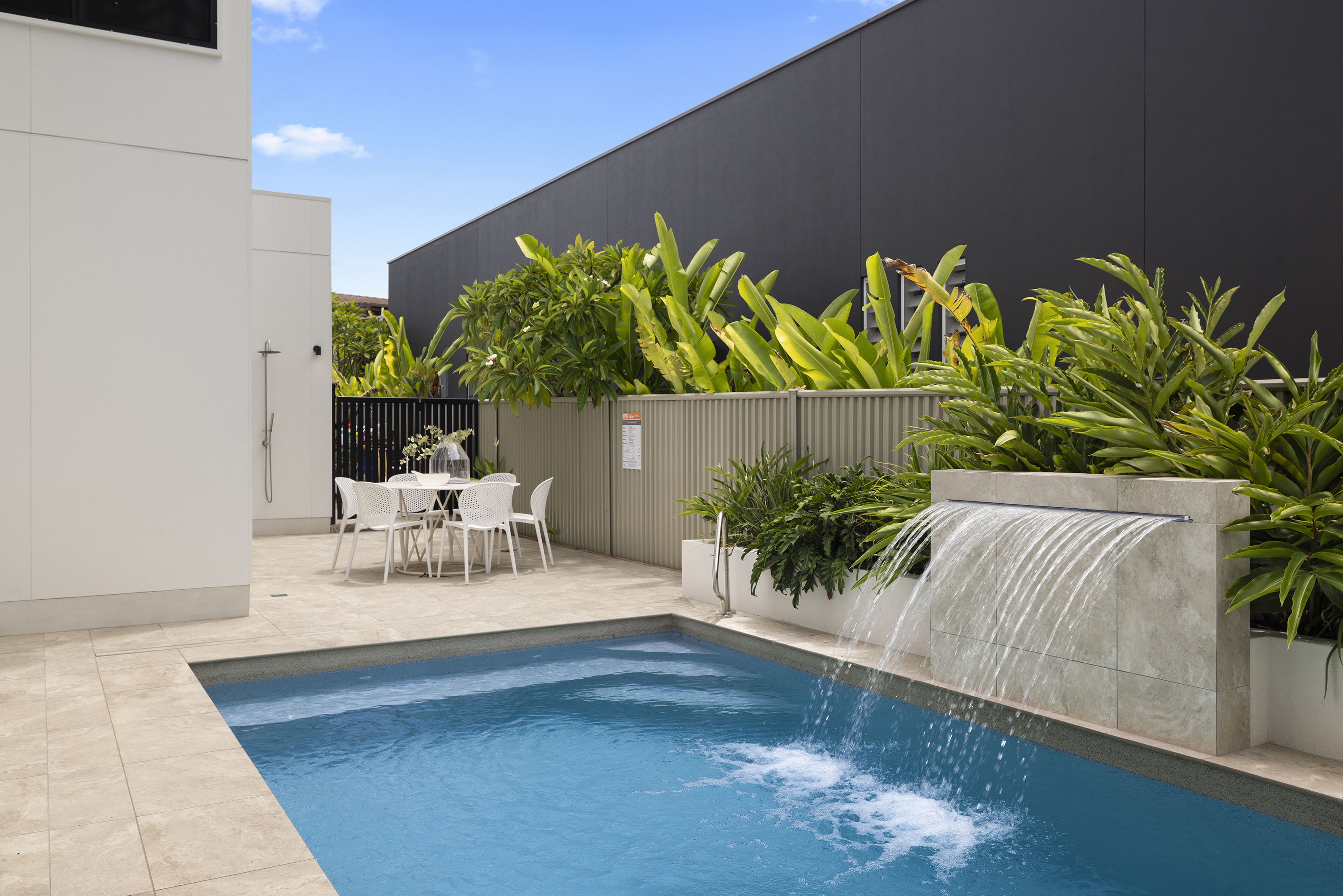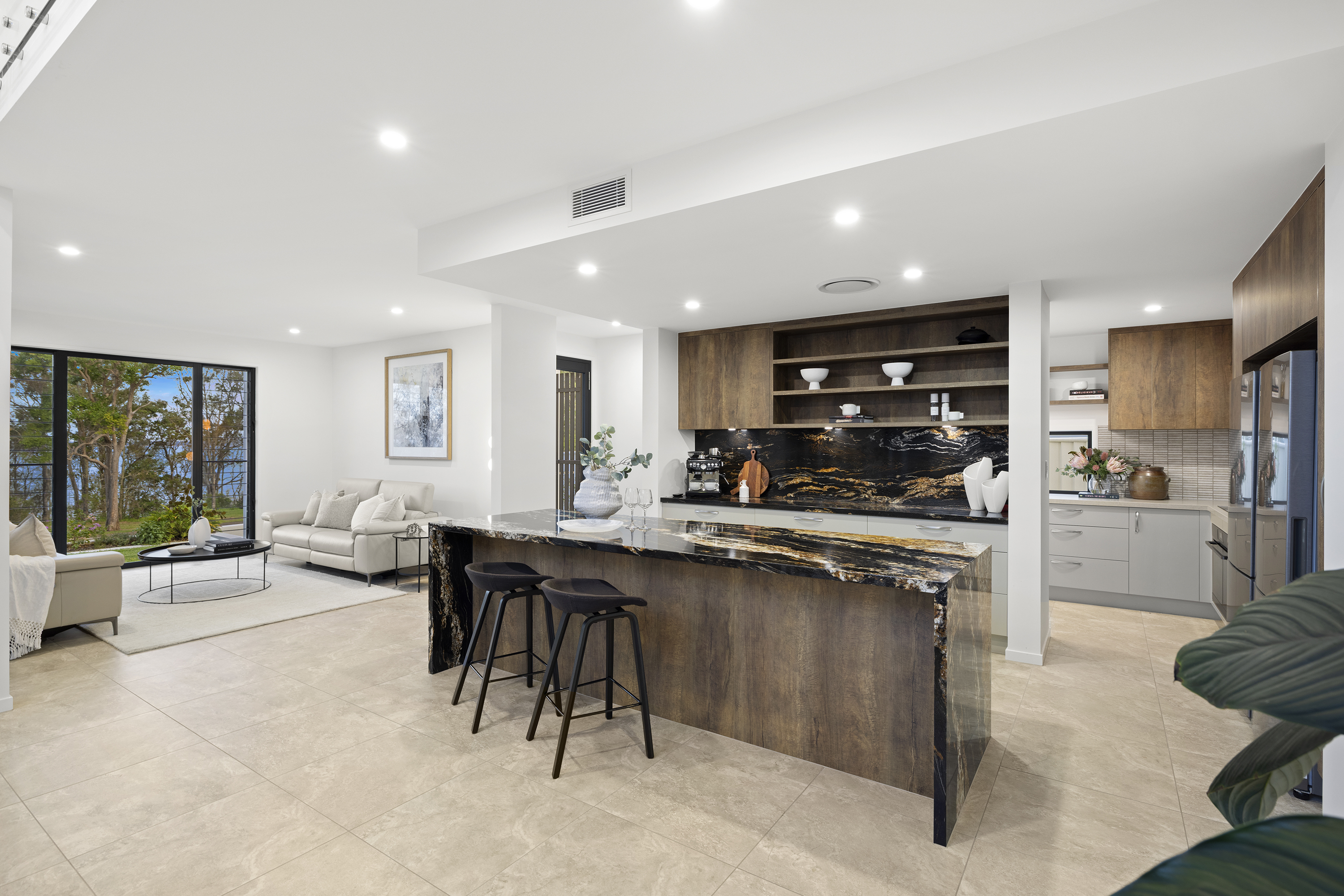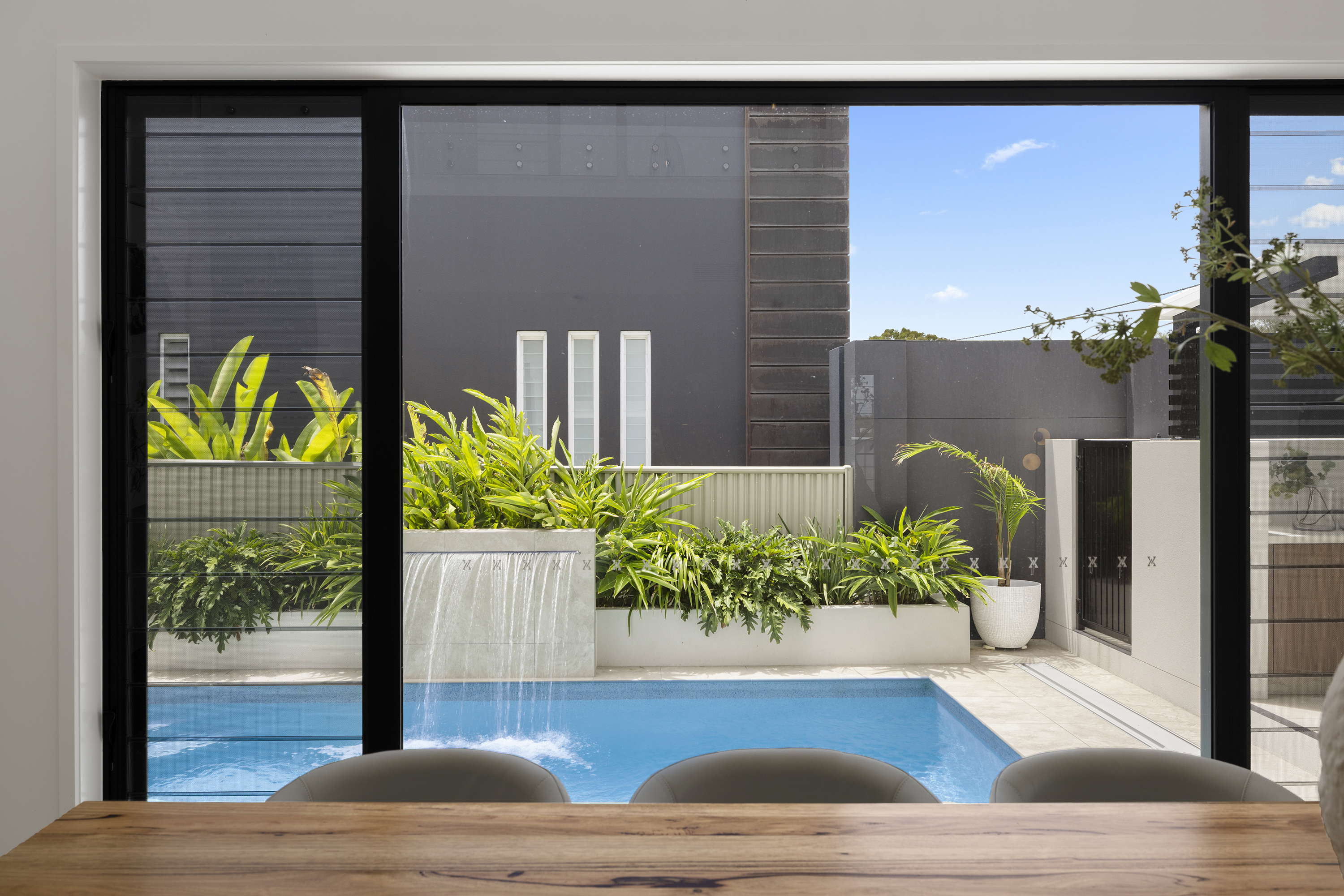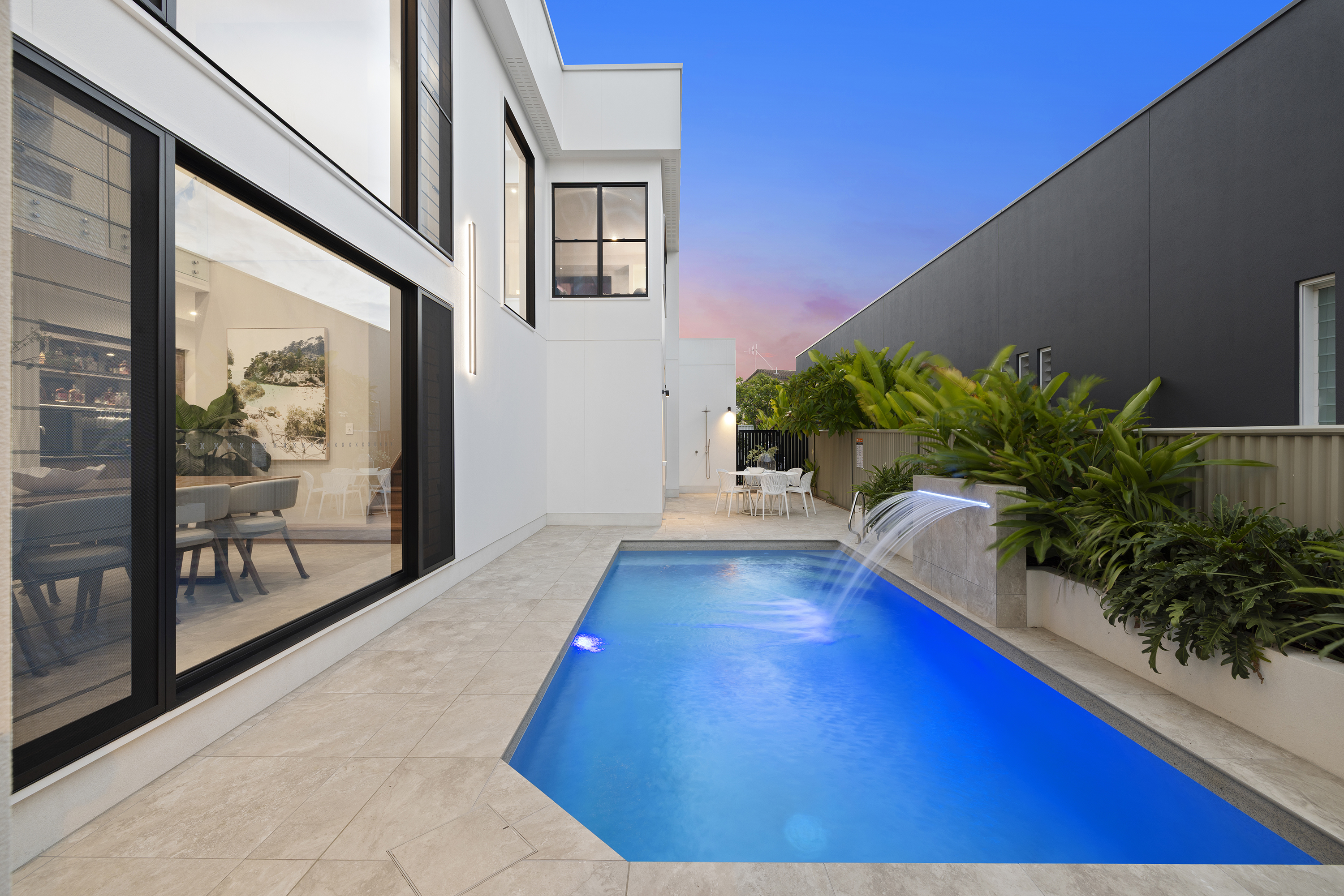 Commanding one of the most sought-after waterfront locations on the Hervey Bay Esplanade, this newly completed executive residence offers exceptional luxury and liveability. Built by master builder Aspiring Homes, the dual-level home with an internal lift sits on a prized 613 sqm waterfront block, providing panoramic views across the turquoise waters of Hervey Bay to World Heritage–listed K'gari. With three ensuite bedrooms, a heated swimming pool, a walk-in wine cellar, a media room, and multiple living areas, every detail and finish has been thoughtfully considered. Step inside, and the bay views unfold through double-height glazing, filling the ground-floor living spaces with natural light and inviting cool bay breezes. The open-plan kitchen, dining, and living area centres on a Black-Fusion granite island that serves as both a practical serving space and a sculptural piece of art. Beyond the main kitchen, a dedicated skylit work kitchen with integrated appliances, double refrigerators, and a double sink enables effortless entertaining without disrupting the pristine aesthetics. A bespoke solid timber staircase with a handcrafted handrail ascends as an architectural statement, leading to the upper level. For wine enthusiasts, a walk-in cellar with glass walls showcases the collection and elevates the home's entertainment appeal. Outside, the heated swimming pool with a cascading water feature is bordered by lush tropical plants and natural stone paving, with an adjacent alfresco kitchen equipped with a built-in barbecue and cabinetry. Glass pool fencing preserves the uninterrupted view. At the same time, the covered ground-level terrace extends the entertainment space, creating a sheltered spot to watch the sunset over the bay or spot seasonal migrating humpback whales. Each of the three bedrooms has an ensuite, providing resort-style comfort for residents and guests alike. One spacious ground-floor bedroom with an ensuite offers both accessibility and privacy, making it ideal for a family home or as a self-contained guest retreat. Upstairs, two ensuite bedrooms enjoy uninterrupted bay views, serviced by a kitchenette with sink and under-bench refrigerator, so the upper level functions as a self-sufficient private wing. A dedicated study nook with a built-in desk and cabinetry provides an efficient home-office environment with a leafy outlook. The upper level also includes a media room and a second covered balcony with a timber-lined ceiling and a ceiling fan, capturing elevated bayfront views of the Coral Sea and toward K'gari. Select amenities • Internal lift connecting both levels • 10kW solar panel system • Fully automated irrigation for gardens and lawns • Two-car garage with motorised door and remote control • Fully gated and fenced • Separate laundry with integrated appliances and an outdoor drying area • Ducted air conditioning throughout • Operable windows to regulate sea breezes • Built-in wardrobes and premium cabinetry throughout • Large-format floor tiles and plush carpet in bedrooms