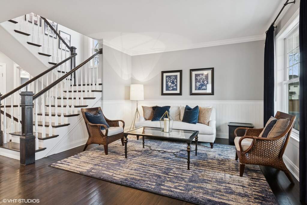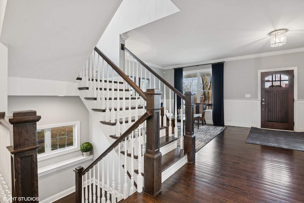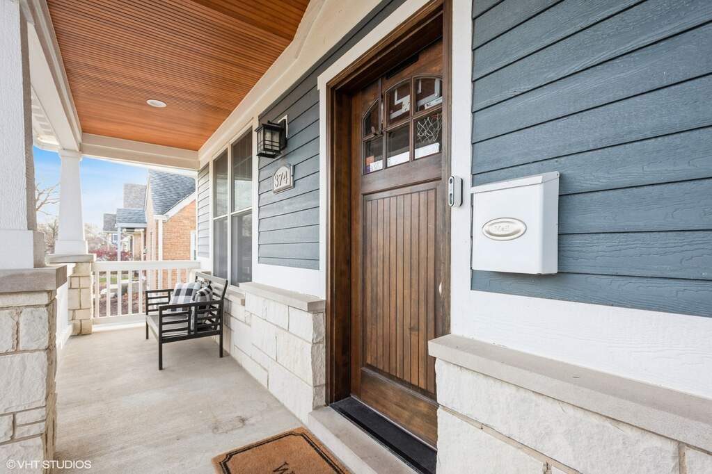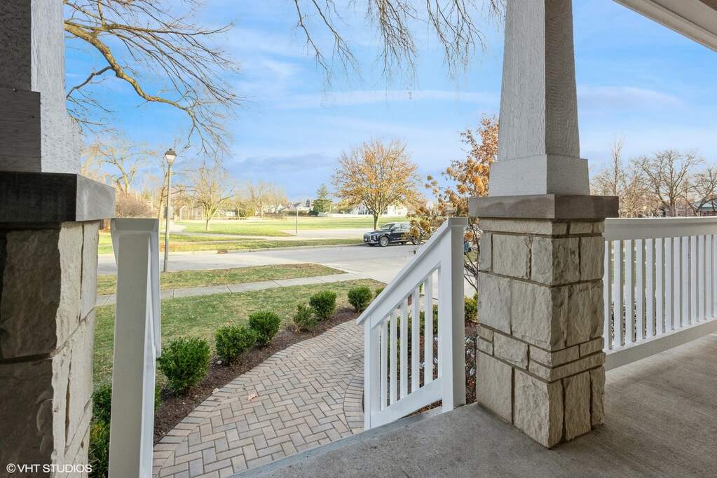 A true beauty from the inside and out! This stunning rebuild blends modern inspiration with timeless elegance in a prime location across from a modern park inclusive of baseball field, garden, and 1/4 mile track for runners & dog walkers too! The schools, shopping, downtown, and major roads are within short distance. Watch the children play at the park across the street from the large front porch or through the sunfilled front windows, enjoying a serene, neighborhood setting. Designed to entertain seemlessly with a growing family both indoors and outdoors. The home sits on a huge 58 x 170 lot on a quiet dead end street offering extensive parking with a long driveway that accommodates multiple cars, plus a massive outdoor 550 square foot shed for exceptional storage or hobby space. Inside, an open floor plan with generous room sizes is enhanced by rich hardwood floors, detailed wainscoting, trim, crown molding, and custom built-ins throughout, creating a warm yet refined atmosphere. The spacious kitchen features a large island, marble countertops, abundant cabinetry, and newer appliance flowing seamlessly into the dining and family rooms anchored by a cozy wood-burning gas fireplace, with so many windows and tasteful window treatments that invite abundant natural light into every corner. Upstairs, the second floor offers four bedrooms in which all just had new carpeting installed, including an en suite primary retreat with walk-in closet and spa-like bath with double vanities, private commode, and steam shower, along with an additional full bath and a separate laundry room for everyday convenience. The finished basement with tall ceilings extends the living space with a huge recreational area, highlighted by an expansive cabinet wall for organized storage, plus a fifth bedroom, full bath, and a versatile bonus room to tailor to your lifestyle. Outdoor entertaining is truly stress free and comfortable in the thoughtfully designed backyard oasis, which showcases an outdoor kitchen with granite countertops, built in grill with natural gas line, refrigerator and generous prep space, along with a large paver patio and sitting wall that easily hosts gatherings of family and friends especially sitting by the fire pit layered with glass rocks powered by a natural gas line. With its blend of luxury finishes, smart functionality, and outstanding indoor/outdoor living, this is a move-in, turnkey ready home with tons of storage that will be easy to enjoy upon moving in.