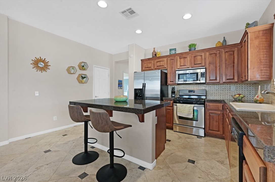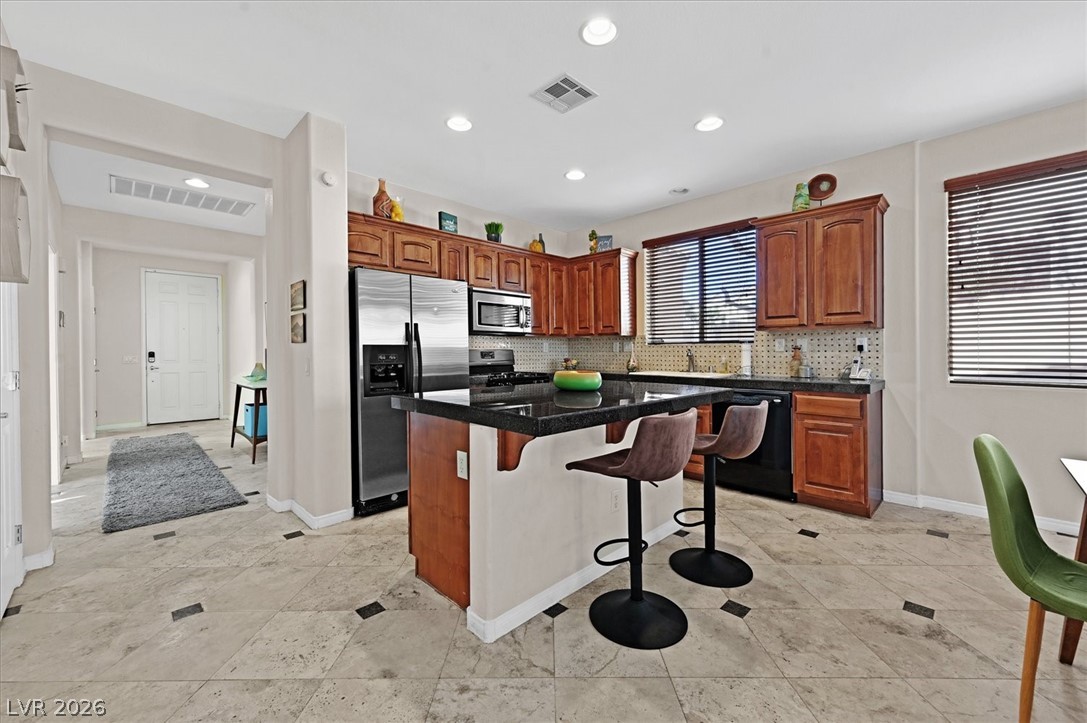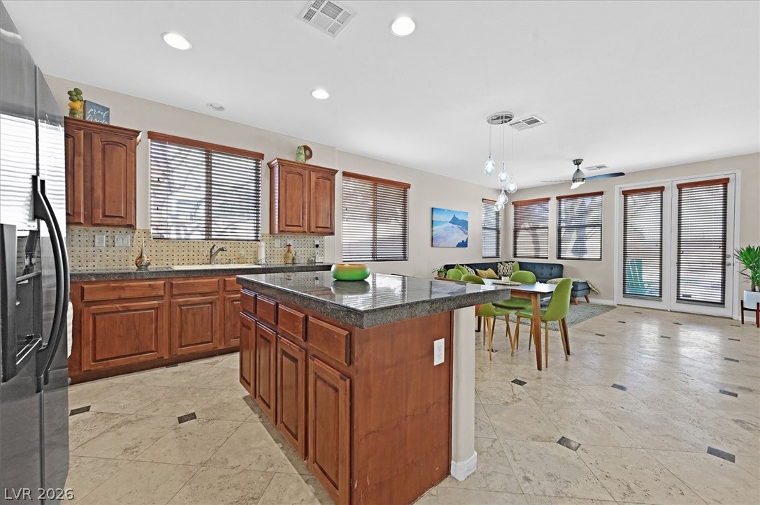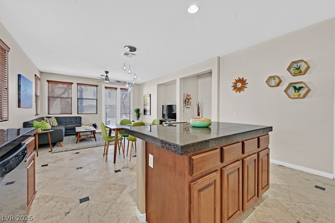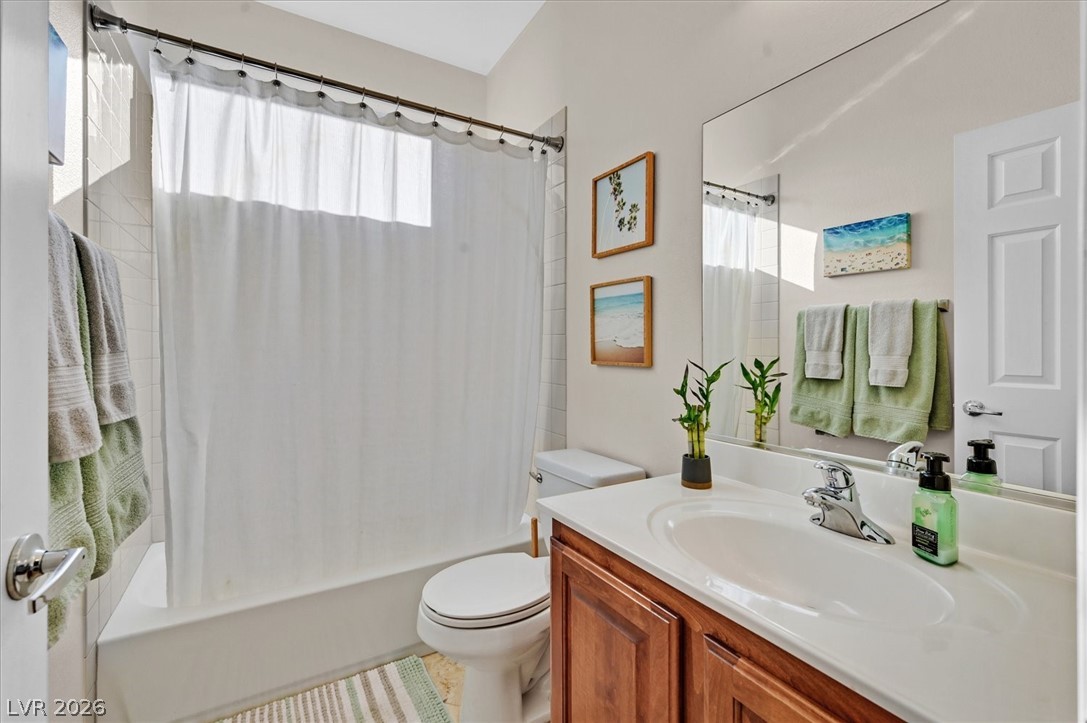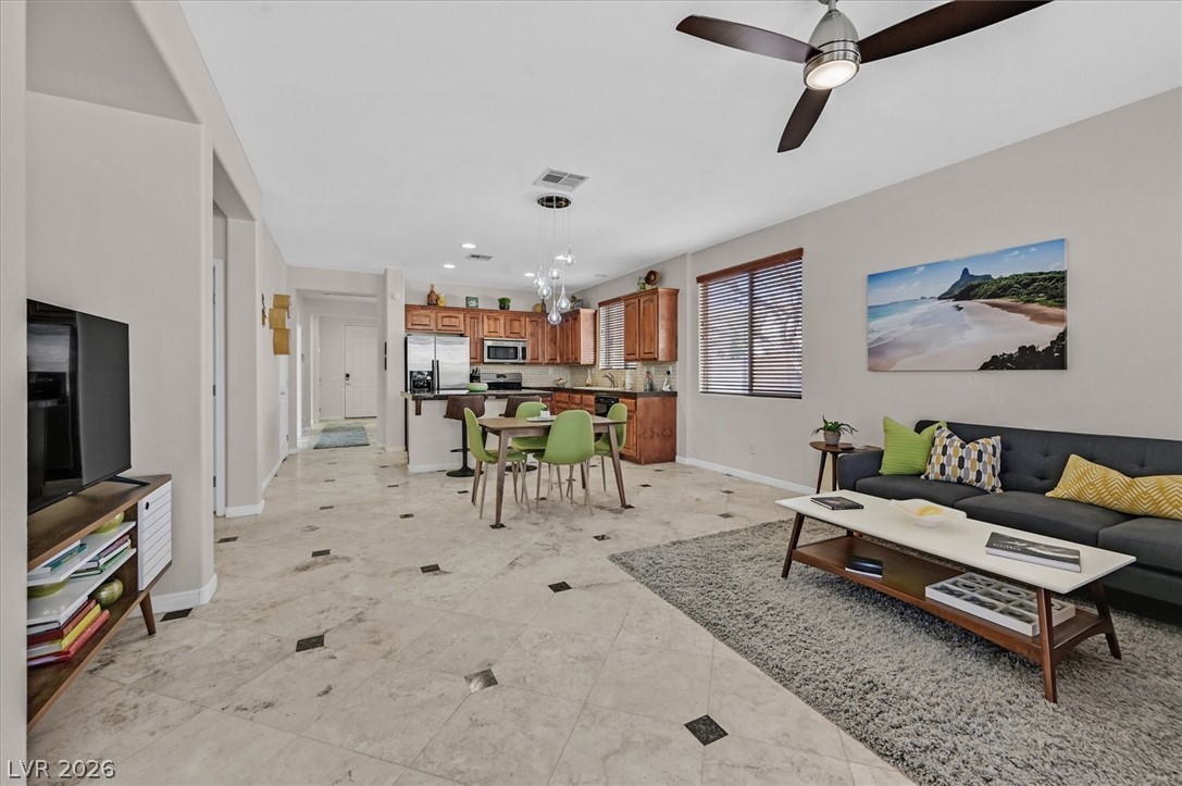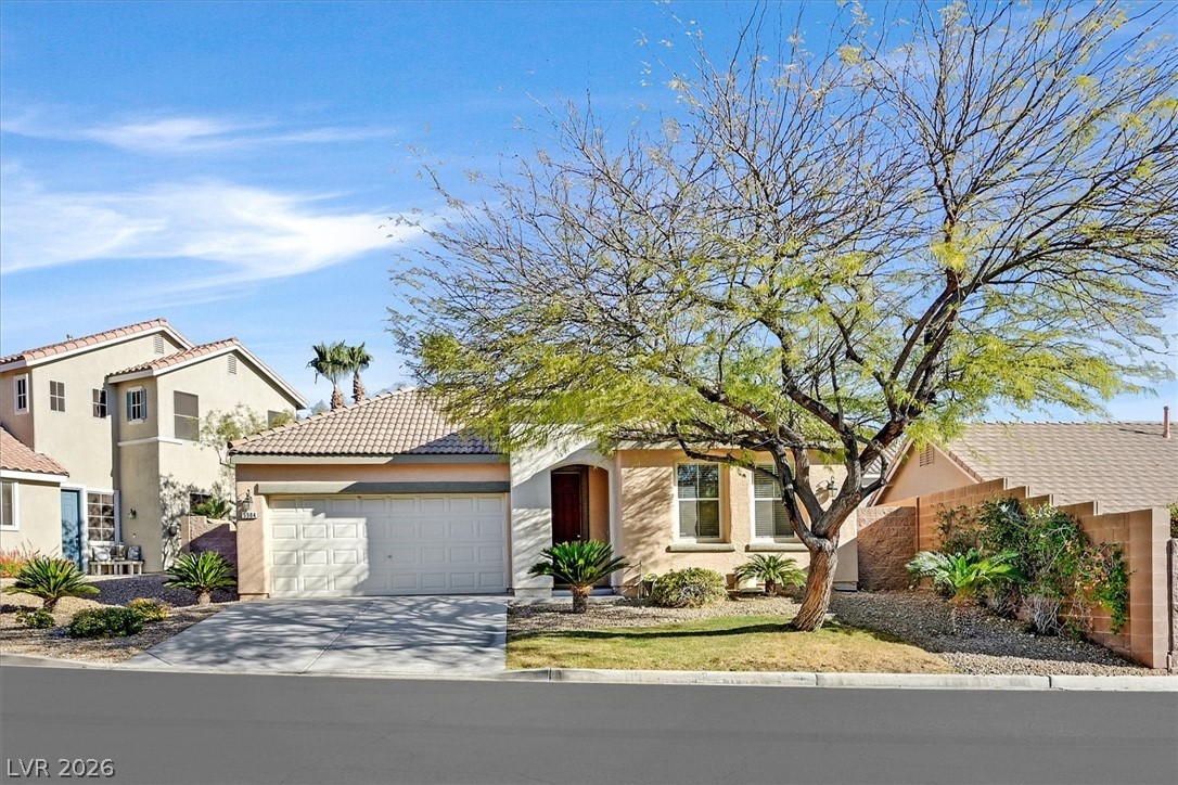 This well-maintained, single-story home - located on a quiet cul-de-sac in the charming Solara neighborhood of Southern Highlands - radiates pride of ownership! The interior features tile flooring throughout the main living areas, complemented by wood blinds and upgraded lighting in every room. The open-concept kitchen is a chef's delight, boasting stainless steel appliances, a large island, and a pantry. Relax in the spacious primary suite, which offers a custom "California Closet" style walk-in with mirrored doors, dual sinks, and a large walk-in shower. Both secondary bedrooms have been tastefully updated with wood-laminate flooring and new closet doors. Outside, the oversized lot provides ample space to add a pool or create your dream outdoor oasis. Plus, the finished two-car garage features durable epoxy floors and convenient backyard access. This home truly stands out from the crowd!