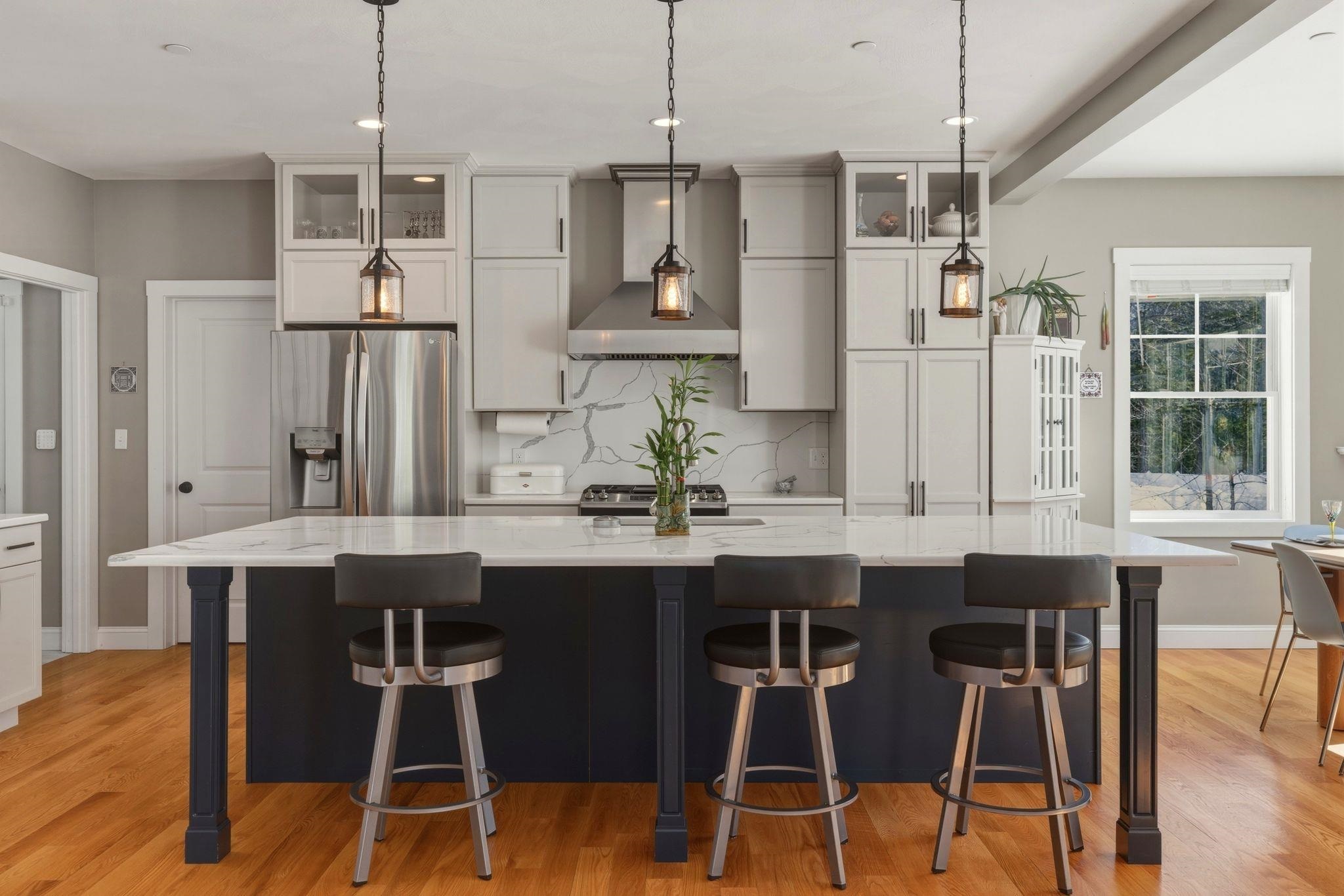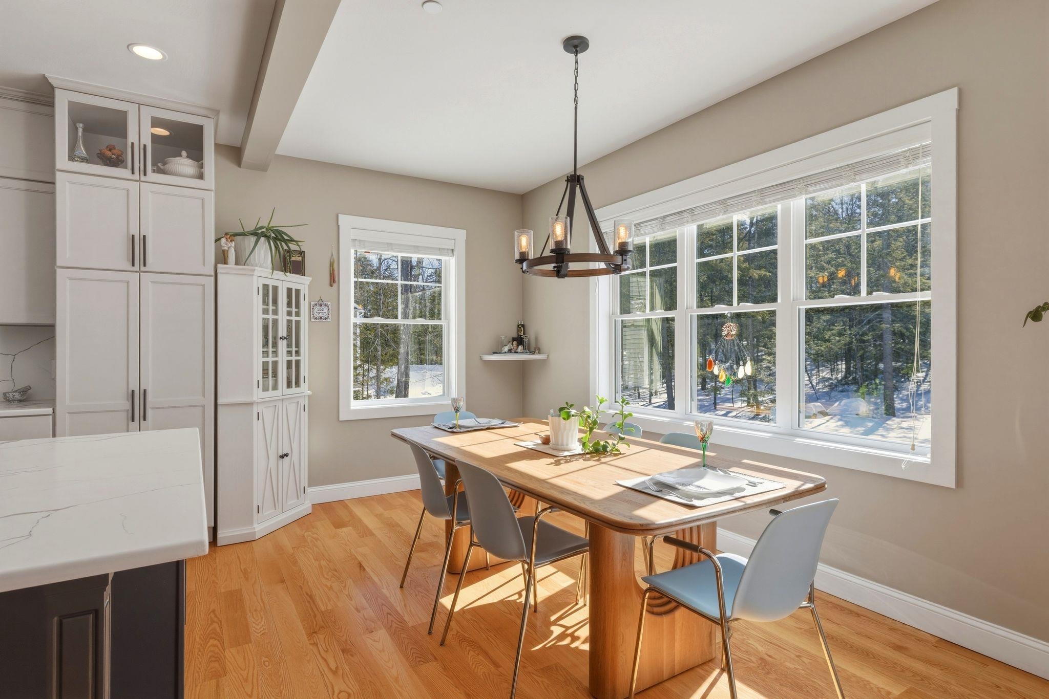 OPEN HOUSE Saturday 10-1 & Sunday 11-1. Set in the desirable Forest View neighborhood of New Boston, this luxurious Craftsman-style home offers privacy, space, and direct access to trails in the conservation land bordering the property. A covered front porch leads into a bright, open interior with hardwood floors throughout the home. The kitchen is centered around a large island and includes quartz countertops, custom cabinetry, stainless appliances, and a walk-in pantry. Just off the dining area, a covered balcony looks out over the yard and wooded surroundings. The open floor plan blends the kitchen and dining area, leading to the spacious living room with a cozy gas fireplace. There is a first floor bedroom option, currently being used as a playroom directly across from a 3/4 bathroom. Upstairs, the primary suite includes a large full bathroom with a soaking tub, glass shower, dual vanity, and a spacious walk-in closet. Three additional bedrooms and a study provide flexible space for work, residents, and guests. The finished walkout lower level offers flexibility; it includes space for a home gym, an additional office, a full bathroom, and leads directly to the patio and backyard. The backyard is mostly open, featuring a fire pit area and wooded privacy while still being part of an established neighborhood. Additional features include a hot tub, EV ready garage, a whole-house generator, and a Reeds Ferry storage shed. All of this is just a short drive to Bedford NH shopping, and the Manchester airport. Select photos have been virtually staged or enhanced.