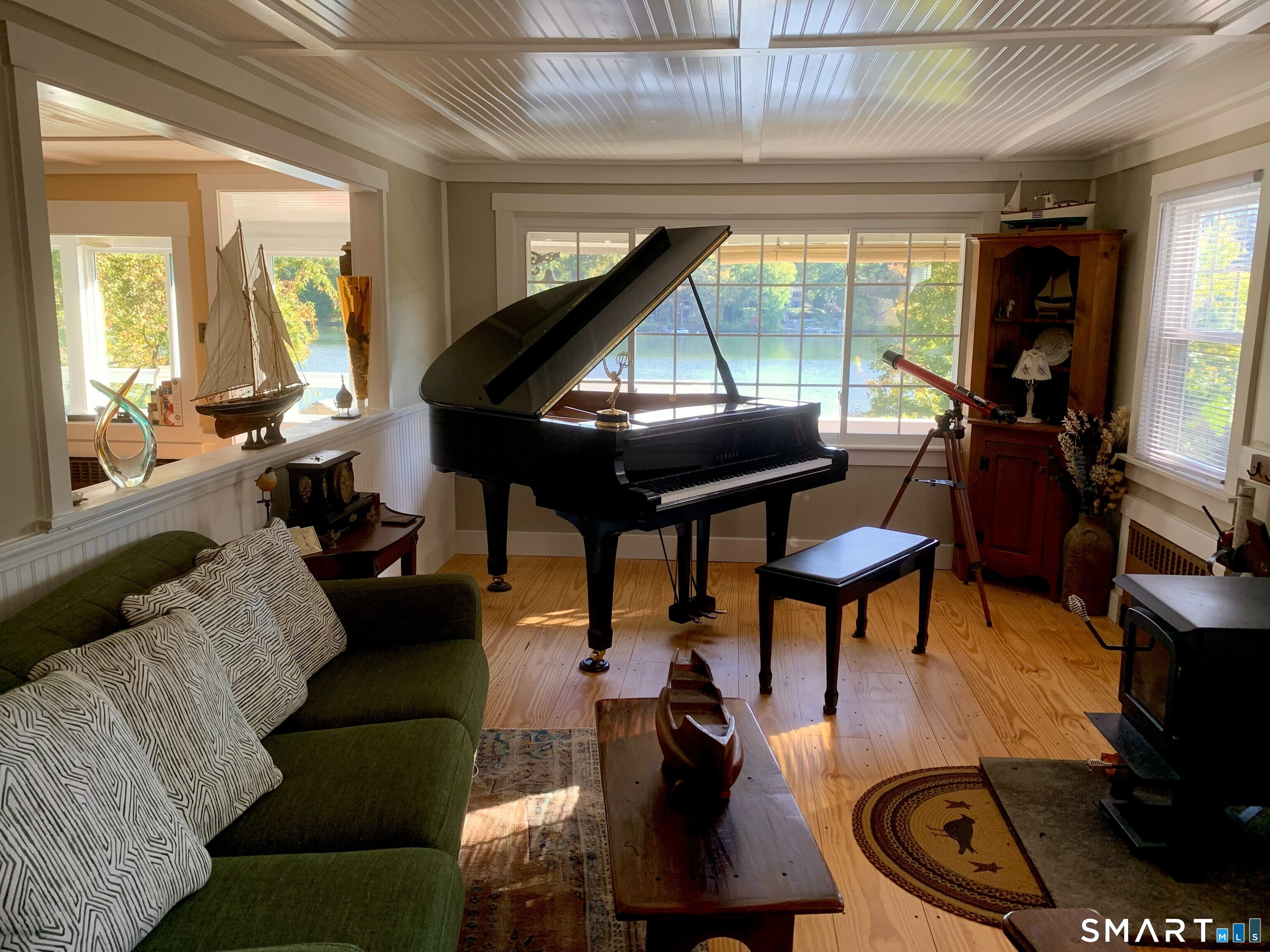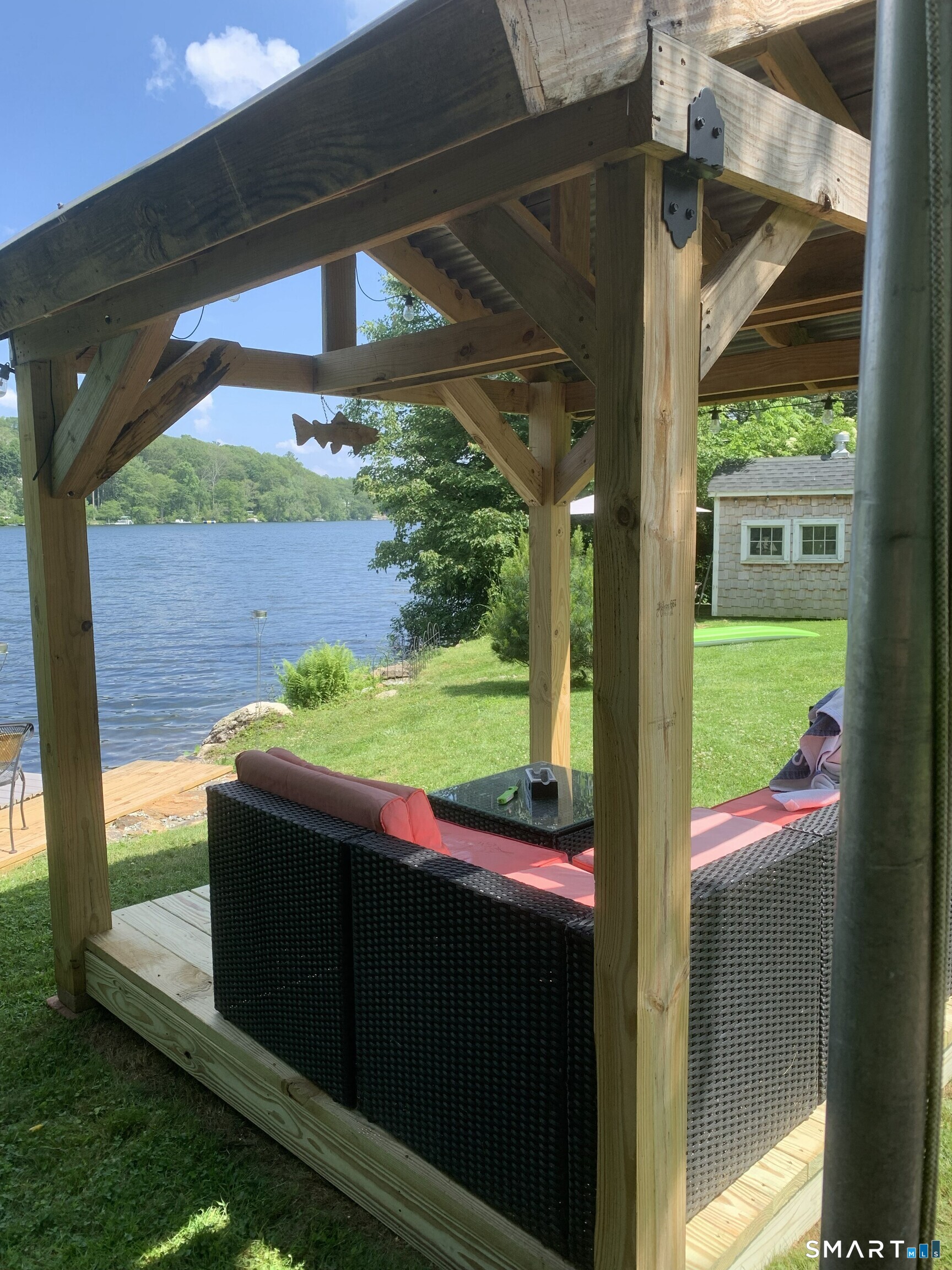 Set along 82 feet of direct waterfront on Lake Terramuggus, 23 Coleman Lane offers a thoughtfully renovated lakeside retreat designed to capture the natural beauty of the water and surrounding landscape. One of the original lake retreats from the 1920s, rebuilt and expanded in 1968, the home was extensively renovated in 2024 with a focus on light, views, and connection to the lake. The residence was reimagined by a four-time Emmy Award-winning composer, bringing a creative perspective to the design while maintaining the relaxed character of a classic Connecticut lake house. Recent improvements include cedar siding, a new roof, updated major appliances, new furnace, new windows, and a newly constructed lakeside patio. Outdoor features highlight the waterfront setting and include a private dock, gazebo, landscaped stone pathways, and a separate lakeside shed with a wood-burning stove-an inviting space positioned directly along the water for gathering or enjoying the lake in every season. Current photos provide an early look at the property, including lake views, waterfront access, interior living spaces, and the lakeside shed. Professional photography is scheduled for March 26 and will include additional interior images and a floor plan. This property offers direct access to Lake Terramuggus with a setting designed to highlight the surrounding water and natural landscape.