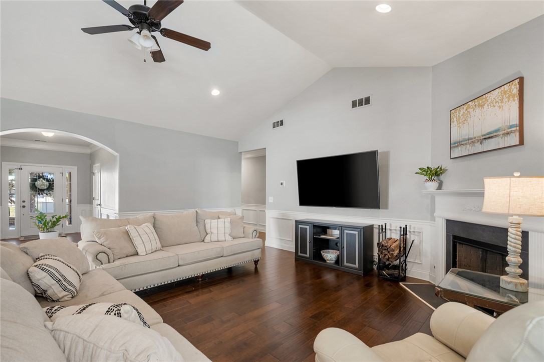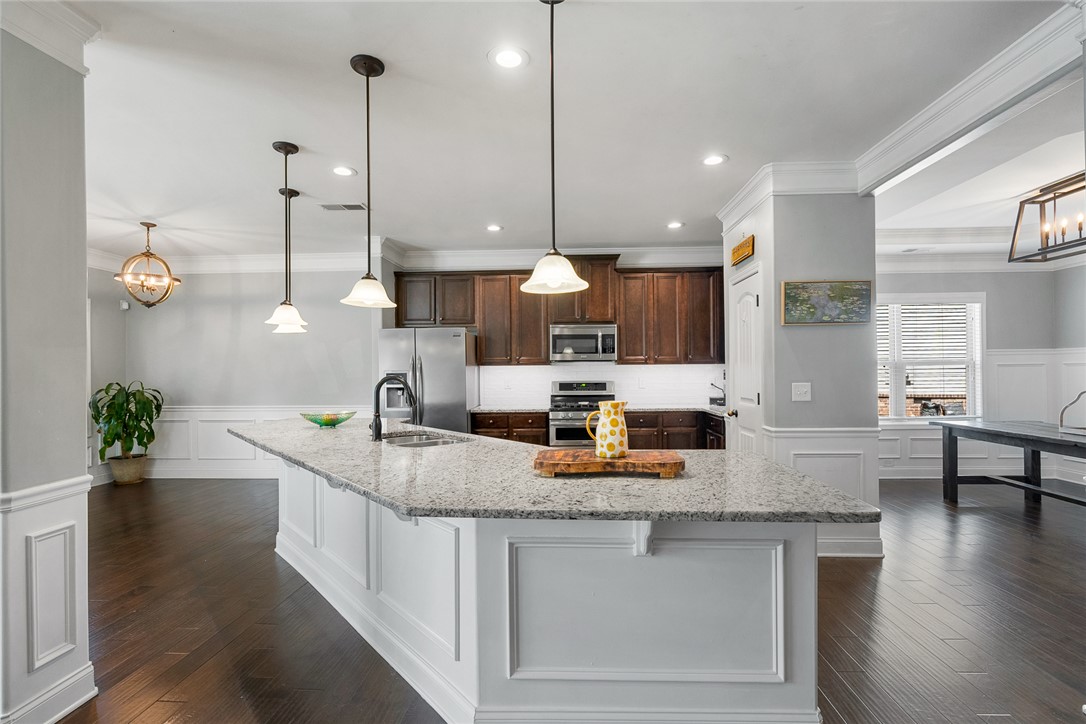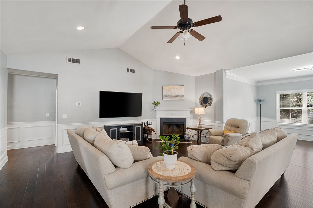 Welcome to this beautifully designed home in the desirable Mystic Vineyards Subdivision, centrally located to shopping, dining, hospitals, and top-rated schools. This spacious 3,500 square foot, 4-bedroom, 3.5-bathroom home offers a thoughtful layout ideal for both everyday living and entertaining. Step inside to an open-concept living area that seamlessly connects the living room, additional family space, and breakfast area. The heart of the home is the chef-inspired kitchen featuring granite countertops, a massive center island, stainless-steel appliances, and a layout that opens directly to the living room - perfect for hosting gatherings or enjoying family time. A separate formal dining room provides built-in storage and additional counter space, making it ideal for entertaining. The main-floor primary retreat offers privacy and comfort with a spacious sitting area and cozy gas fireplace. The luxurious en-suite bathroom includes a large garden tub, separate step-in shower, dual separated vanities, and a generous walk-in closet with plenty of storage. Two additional bedrooms are also located on the main level, each with ample closet space and convenient access to a full hallway bathroom. Upstairs, you'll find a versatile bonus room along with a private fourth bedroom suite featuring a large walk-in closet and full bathroom - perfect for guests, a home office, or multi-generational living. Enjoy outdoor living in the screened-in back porch, overlooking a low-maintenance yard with additional concrete patio space ideal for relaxing or entertaining. This home offers the perfect combination of space, functionality, and location - a must-see opportunity.
