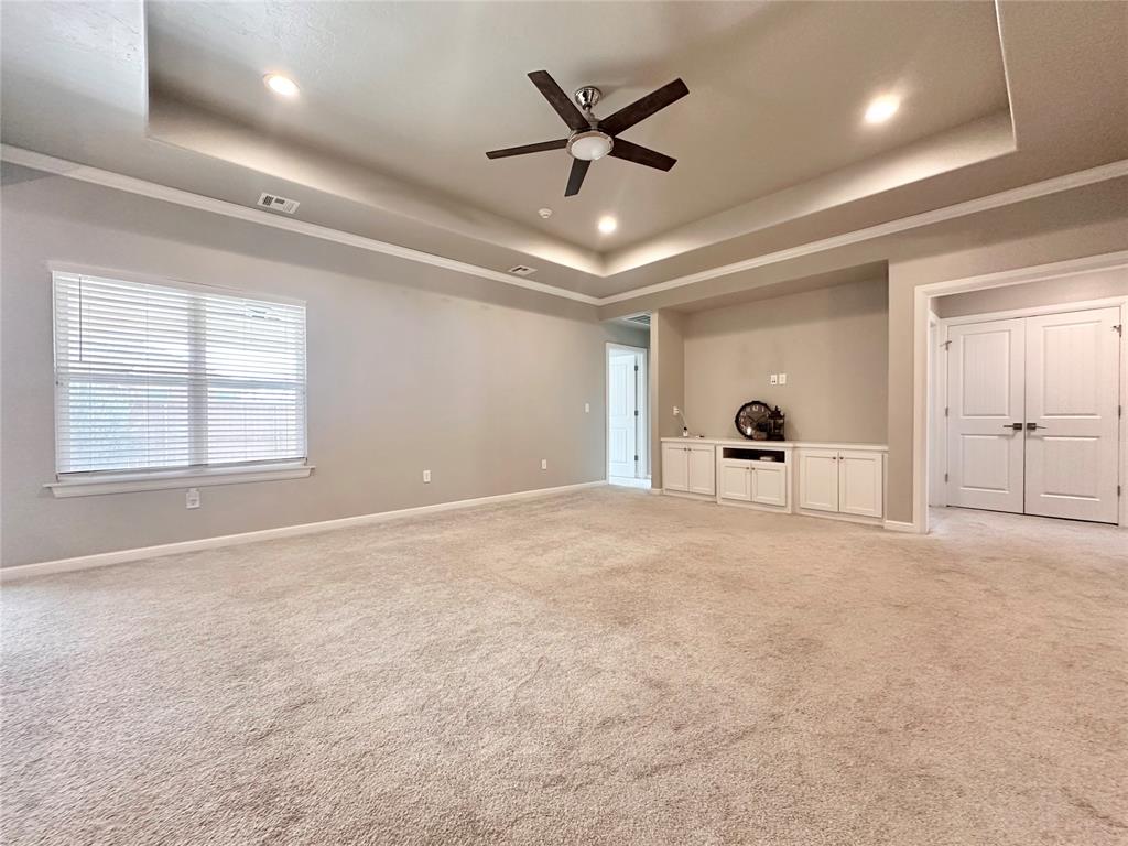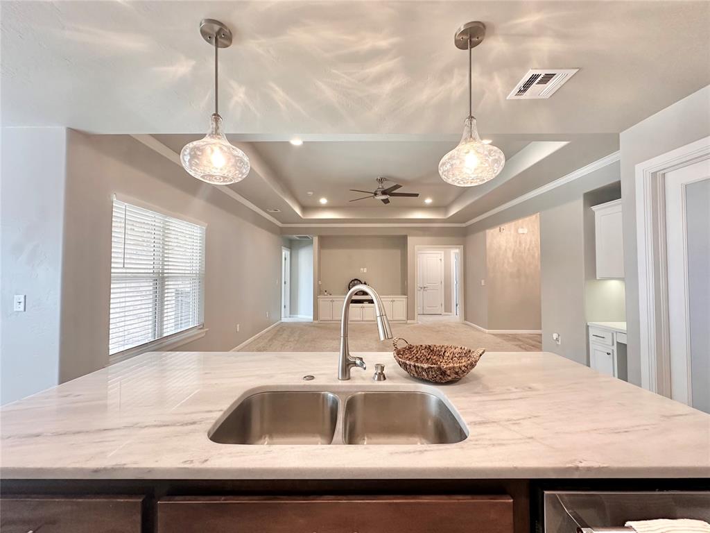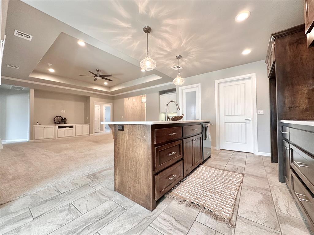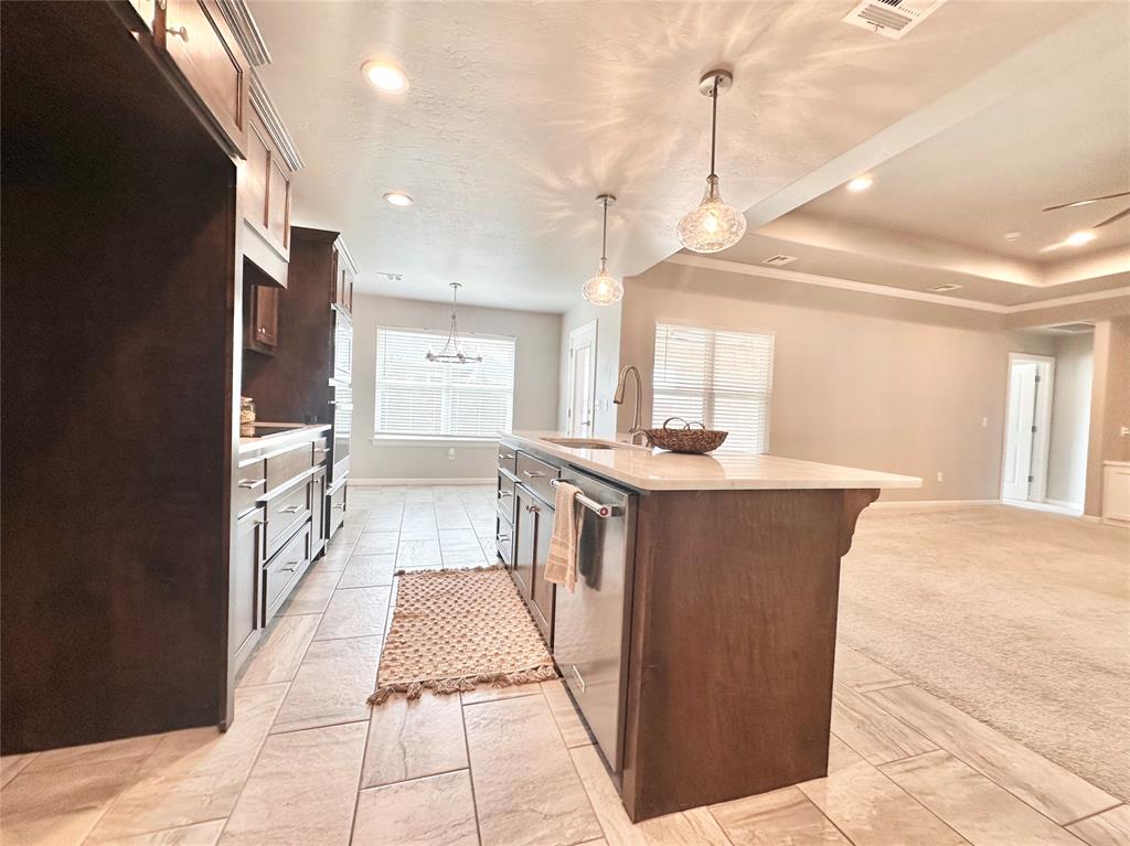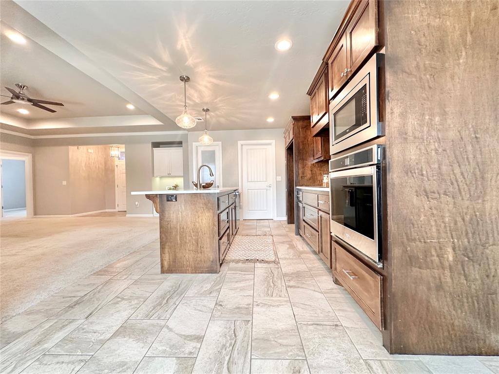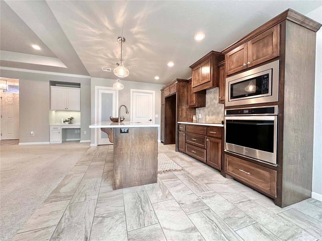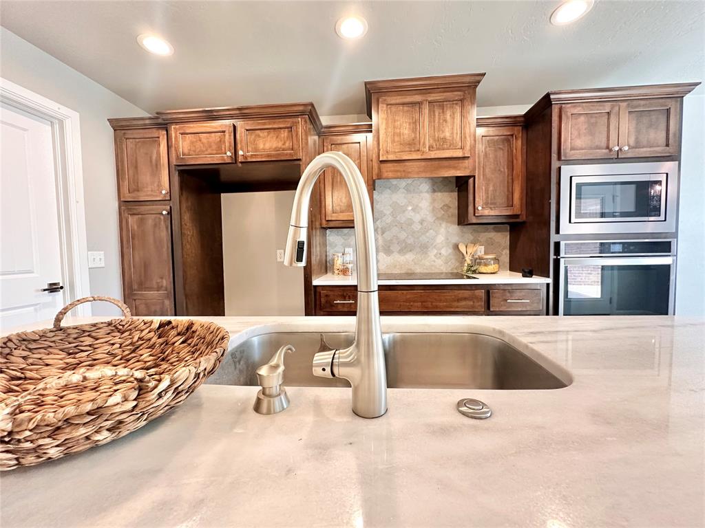This like-new custom home is packed with thoughtful upgrades and amenities designed for comfort and convenience. A welcoming entry leads into the open-concept living area featuring tray ceilings, LED can lighting, and a ceiling fan. The living room also includes a custom-built media center with ample storage, with HDMI wiring discreetly installed inside the walls so no cords are visible around the TV or cabinet. The beautifully designed kitchen offers granite countertops, a large island, walk-in pantry, KitchenAid quiet dishwasher, induction cooktop, and a WiFi-enabled oven that can be controlled remotely. The owner's suite provides a relaxing retreat with a spacious walk-in closet complete with a built-in dresser, oversized walk-in shower, and double vanities. Each bedroom is pre-wired with HDMI connections, and the front bedroom features a vaulted ceiling. Step outside to the covered patio and enjoy the built-in gas fireplace - perfect for relaxing or entertaining. Additional features include built-in garage shelving and a concrete sidewalk leading from the driveway to the backyard. The fully fenced yard includes two gated entries with double locks for added security. Located within the Grove School District and North Rock Creek High School District. Easy access to I40 and all things Shawnee! Place on your show list today.