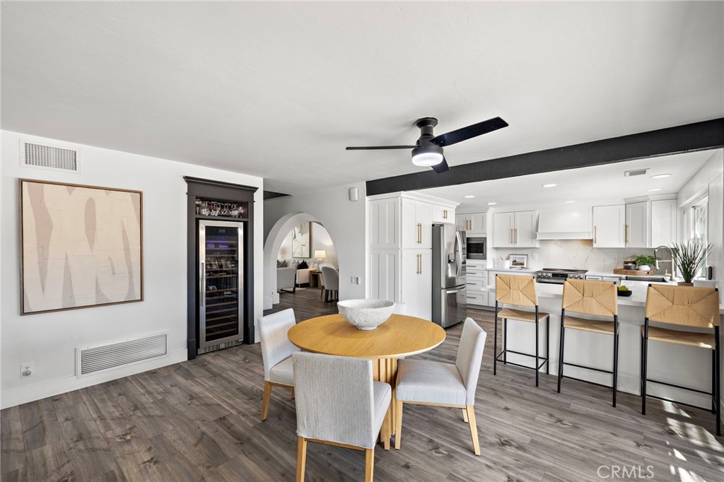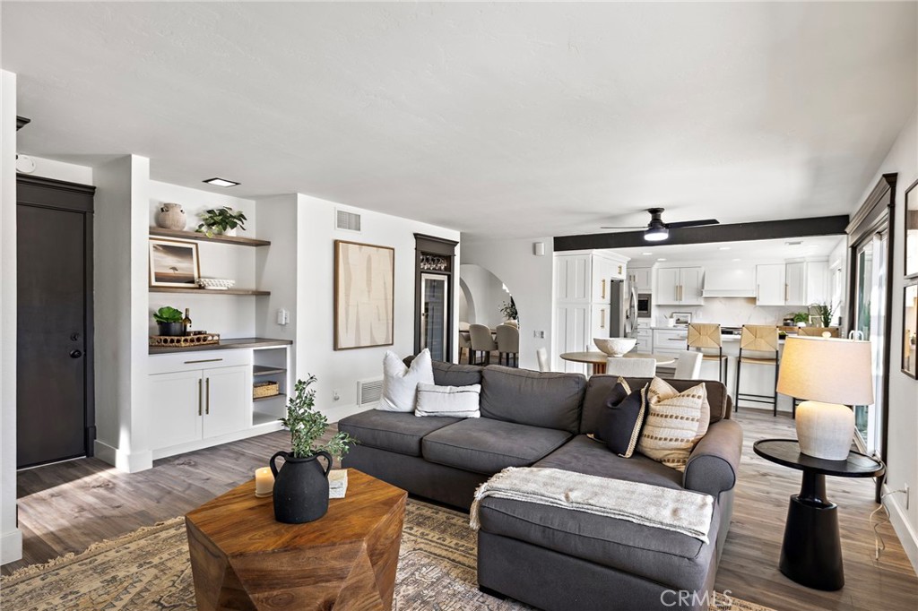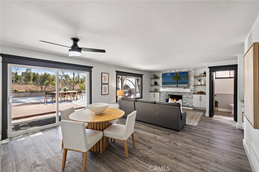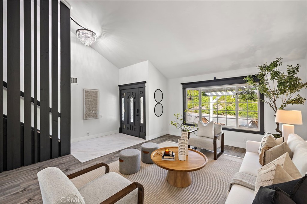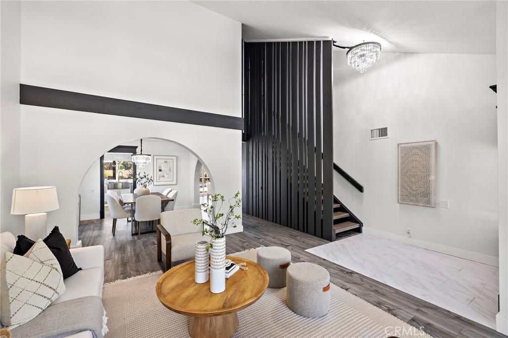 From the moment you arrive, this exceptional four bedroom, three bath residence captivates with a presence that simply feels like the one! The dramatic entry showcases a striking architectural staircase accented by custom wood slats with concealed storage, updated flooring and a statement chandelier that draws the eye upward. The open-concept living and dining areas, designed to maximize natural light, flow effortlessly from the foyer and are highlighted by a beautifully refreshed fireplace with custom built-in cabinetry and shelving, complemented by updated flooring - ideal for both everyday living and refined entertaining. The kitchen has been completely reimagined with new custom cabinetry, quartz countertops, stainless steel appliances, designer backsplash, upgraded fixtures, and new flooring, offering the perfect balance of style and functionality. A custom wine storage area with wine refrigerator and glass display nook adds a sophisticated touch, perfect for hosting. All bathrooms have been beautifully updated with new vanities, faucets, mirrors, flooring and lighting, along with thoughtful finishes throughout, including custom paneling in the first-floor bath. A well-planned laundry area with custom cabinetry maximizes everyday convenience and smart storage. Each bedroom has been freshly painted and enhanced with custom wood detailing. An oversized secondary bedroom features refined chair rail paneling, while the primary suite offers a serene retreat, highlighted by a beautifully appointed fireplace. The en-suite bath has been fully renovated for elevated comfort and everyday luxury. Outdoor living has been thoughtfully curated to create a private oasis. The backyard boasts hardscape enhancements and a new gazebo, ideal for entertaining or unwinding, while the front-yard pergola offers a serene spot to enjoy the California sunshine, in the privacy of a single loaded street. Residents also enjoy exclusive access to Mission Viejo's private lake, a rare and coveted lifestyle amenity, featuring summer concerts on the beach, boating, fishing, swimming and a full calendar of lakeside events. Every detail of this home reflects the owners' background in high-end custom construction, blending timeless craftsmanship with modern finishes throughout.